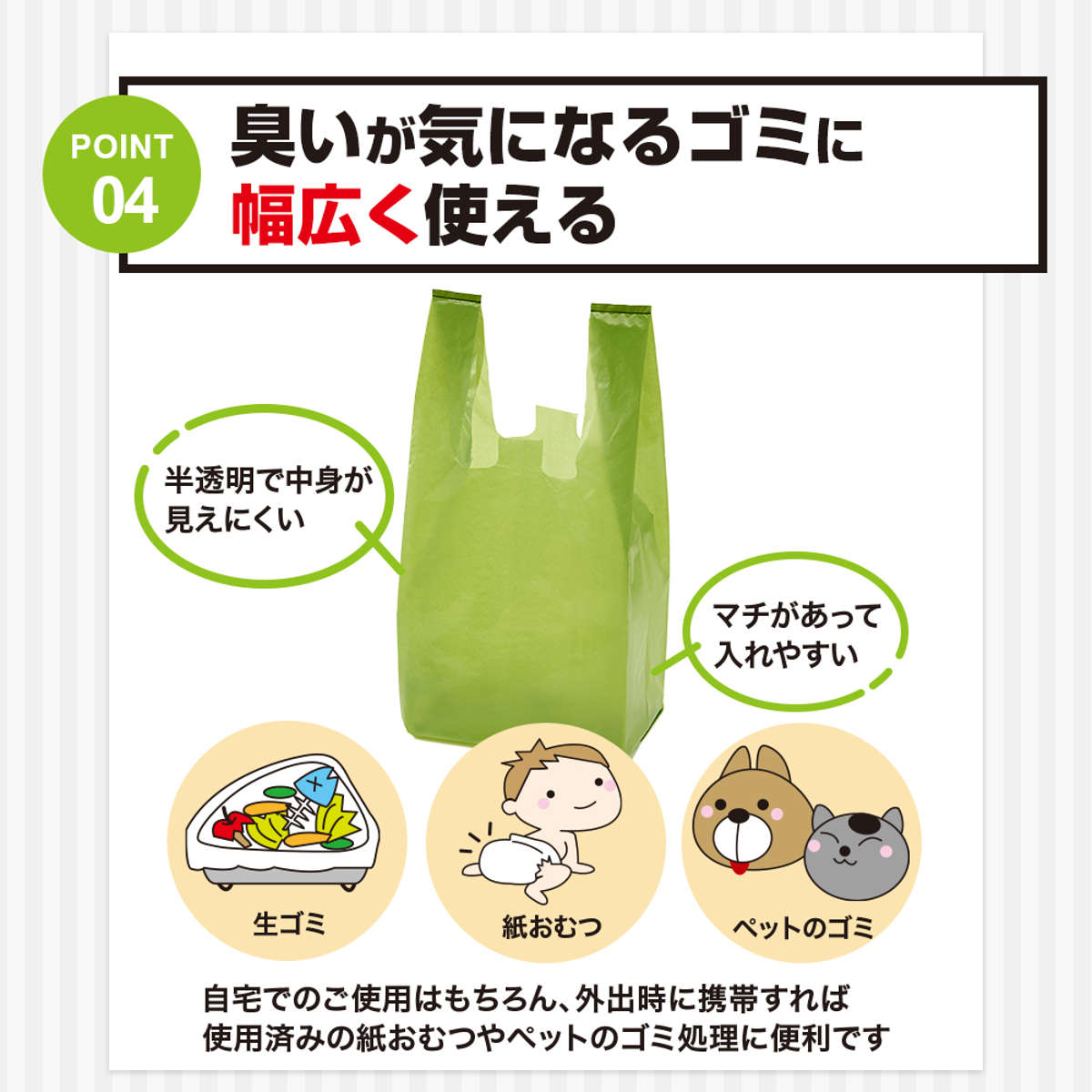 生ゴミ・ペットの排泄物・使用済みオムツなど、気になるニオイをしっかり閉じ込める消臭袋です。密閉しなくても消臭できるので、毎日気持ちよく使えます。