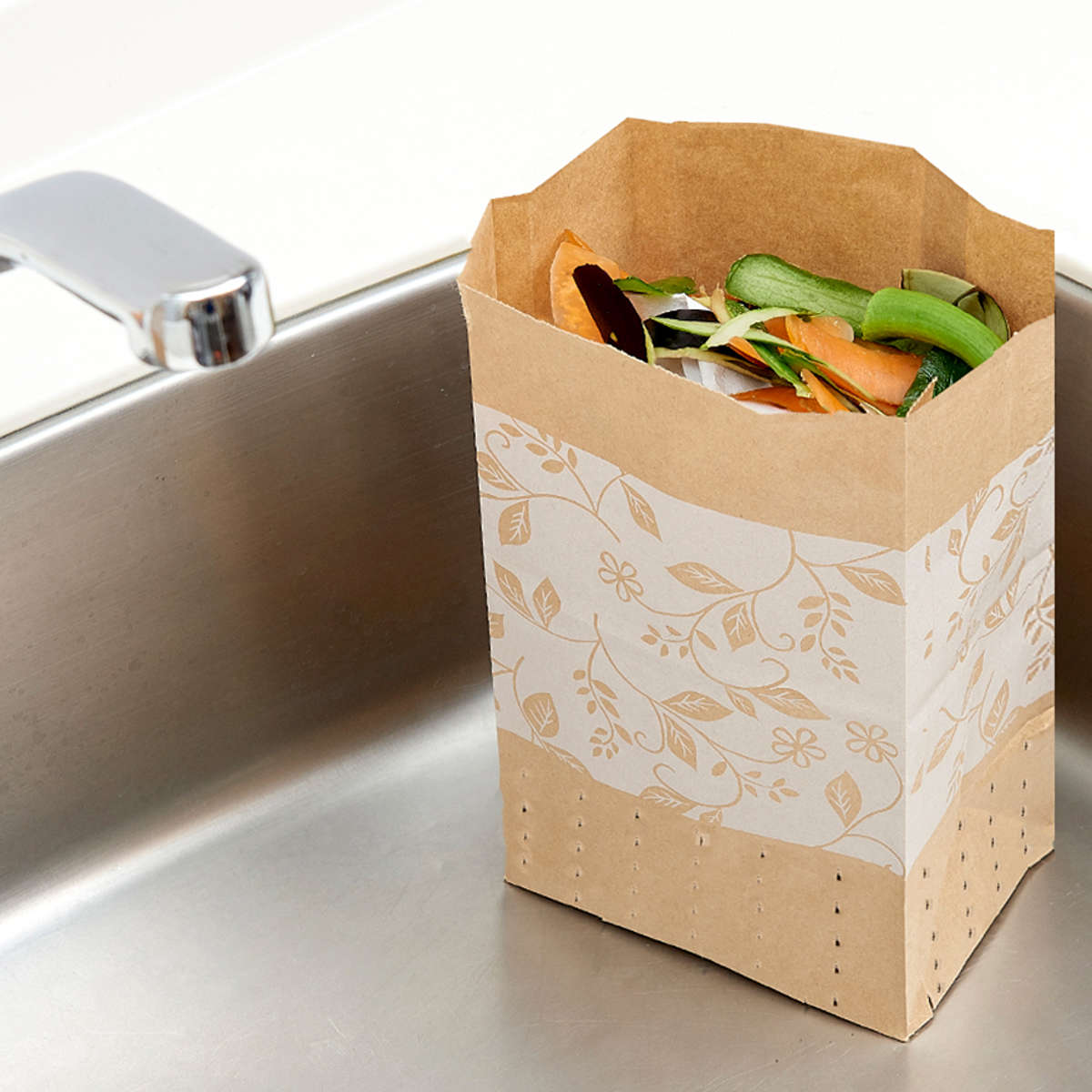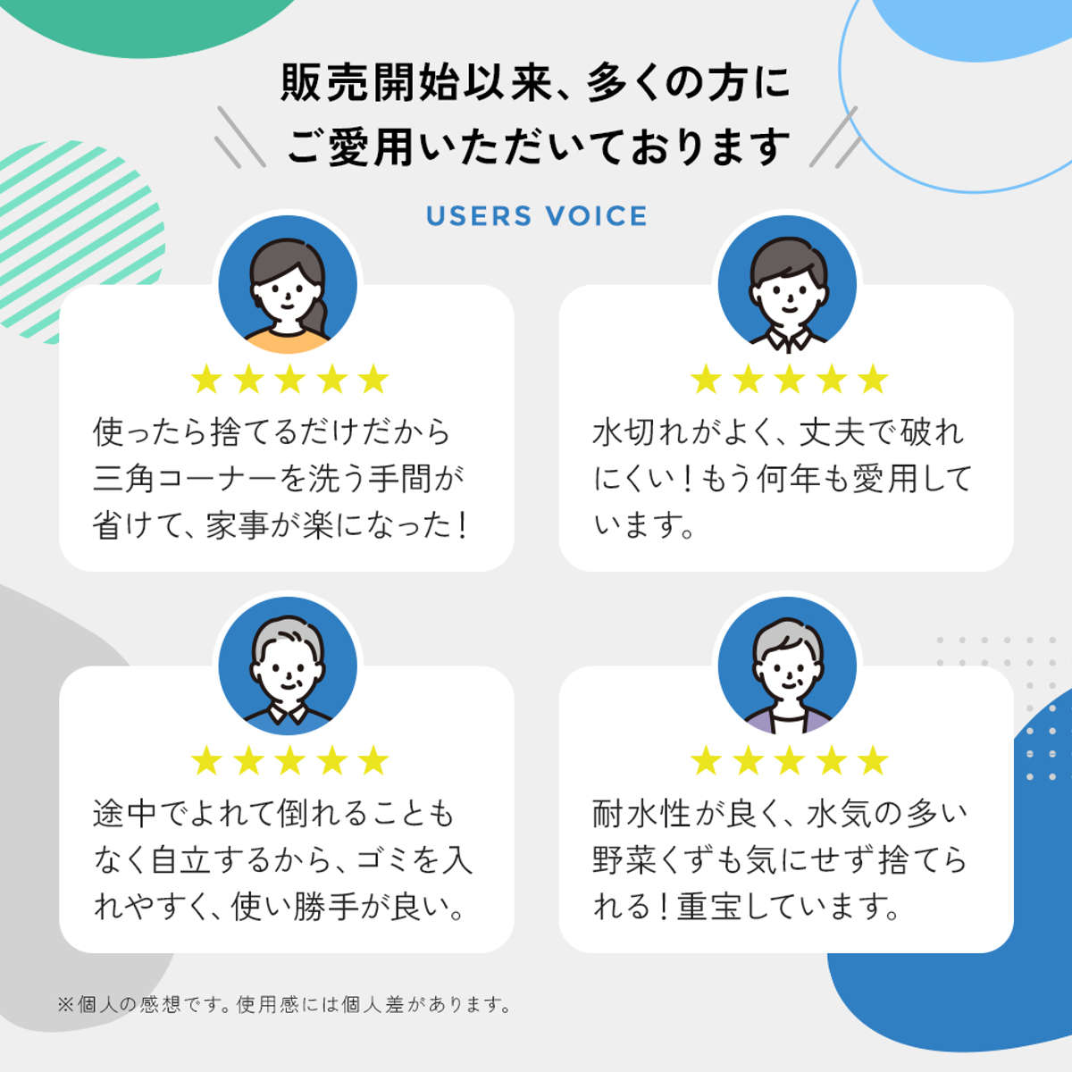 狭いシンクにも置きやすいコンパクトなゴミ袋です。三角コーナー不要で掃除の手間を省き、シンクを広々清潔に保てます。袋は自立するので、調理中も野菜くずなどをサッと捨てられて便利です。