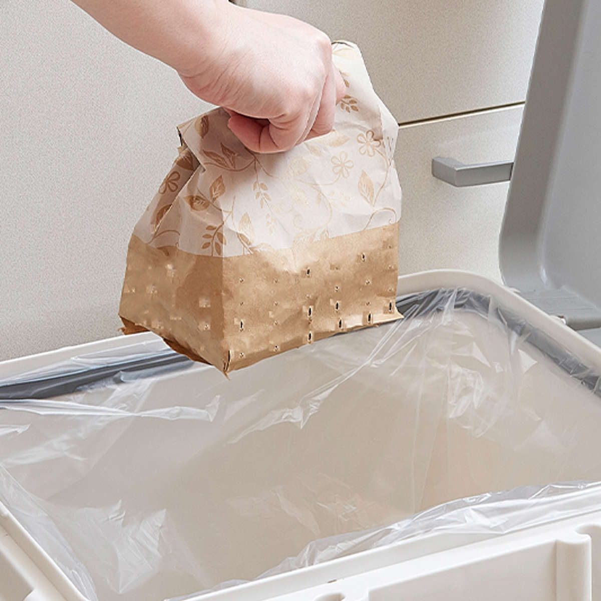 袋の底面と側面に水切り穴が付いているので、袋ごとギューッと絞って生ゴミを触ることなく、そのまま捨てられます。