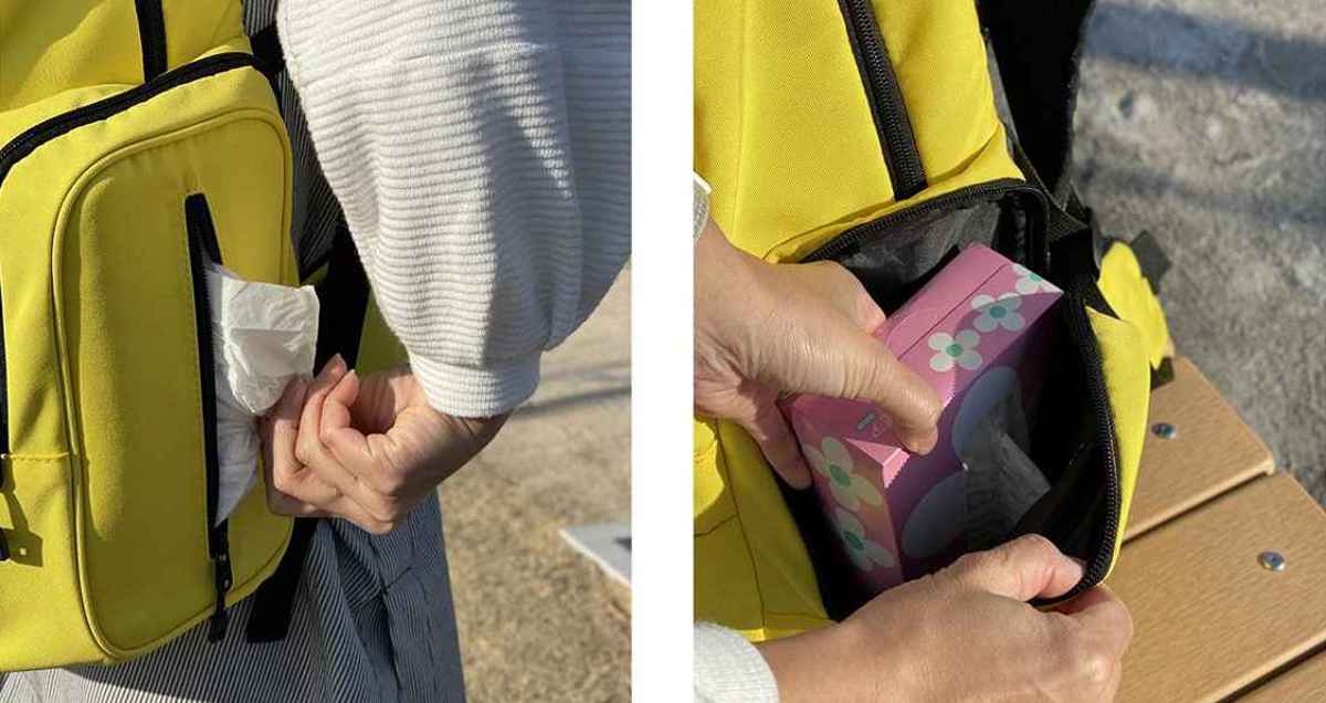 右側ポケットには、箱ティッシュをまるごと入れられます。外側のファスナーを閉めれば、ティッシュ以外にも様々なものを収納できます。