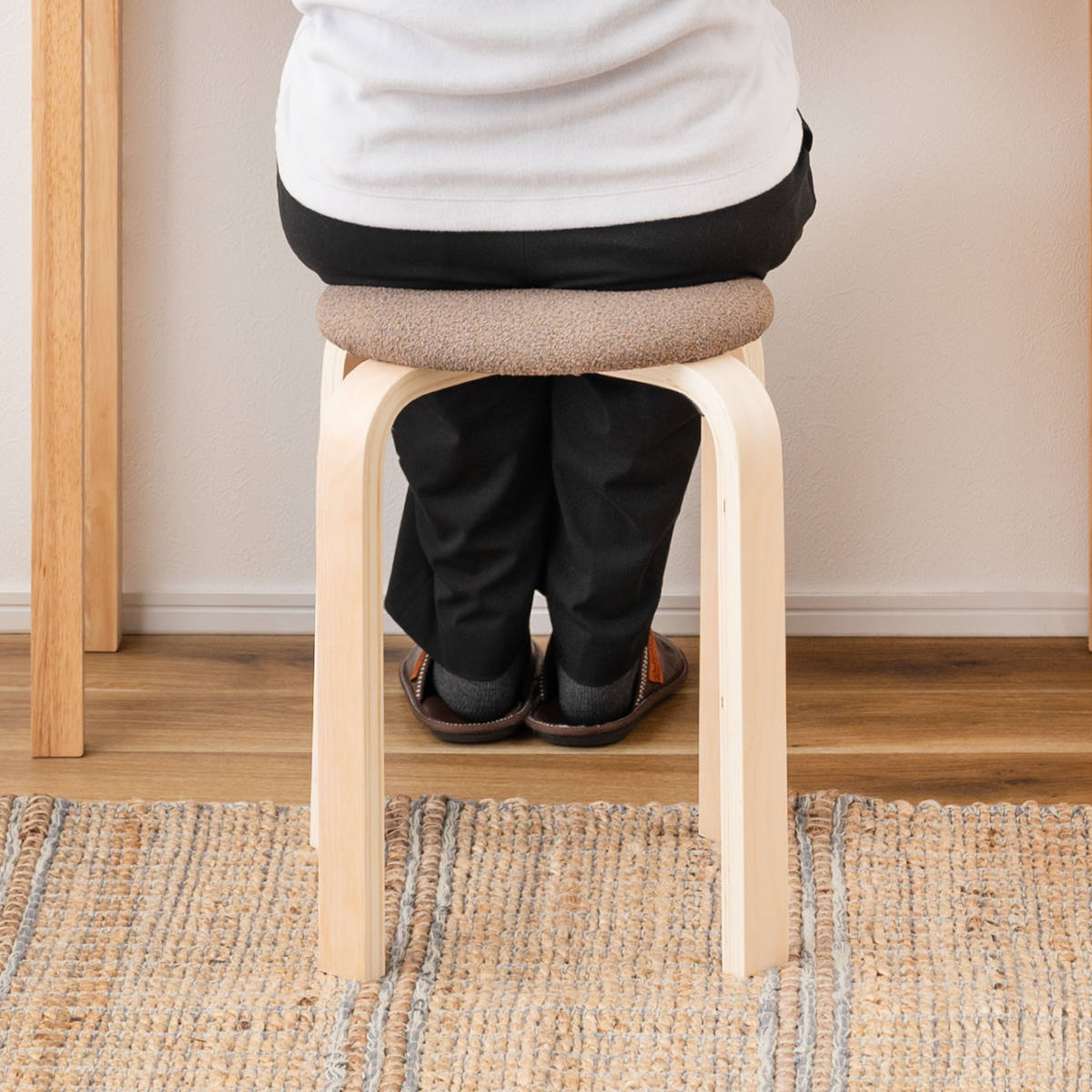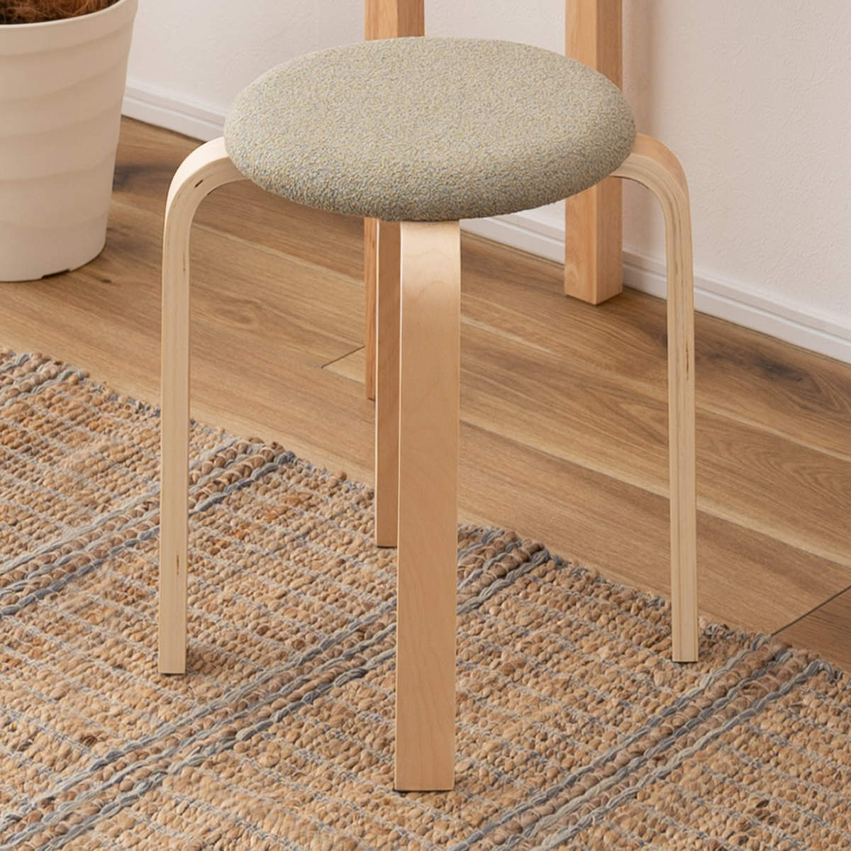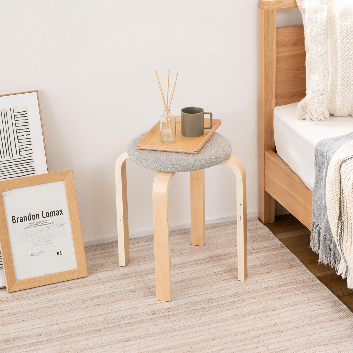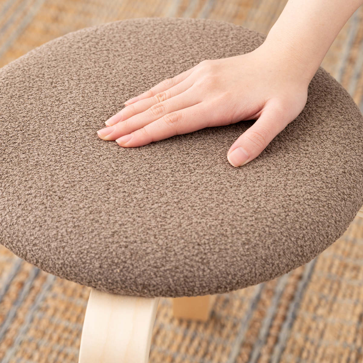 ナチュラルな空間にそっと寄り添う、丸みのあるデザインが魅力のスツールです。天然木のあたたかさと、ニュアンスカラーの落ち着いたファブリック座面が、インテリアにやさしい印象をプラスしてくれます。
