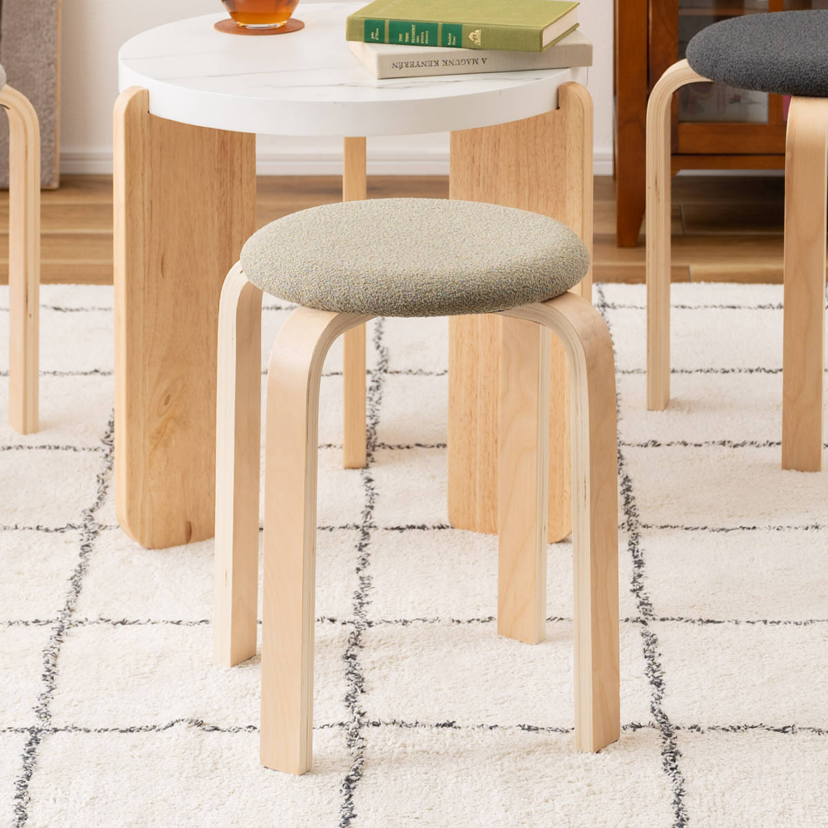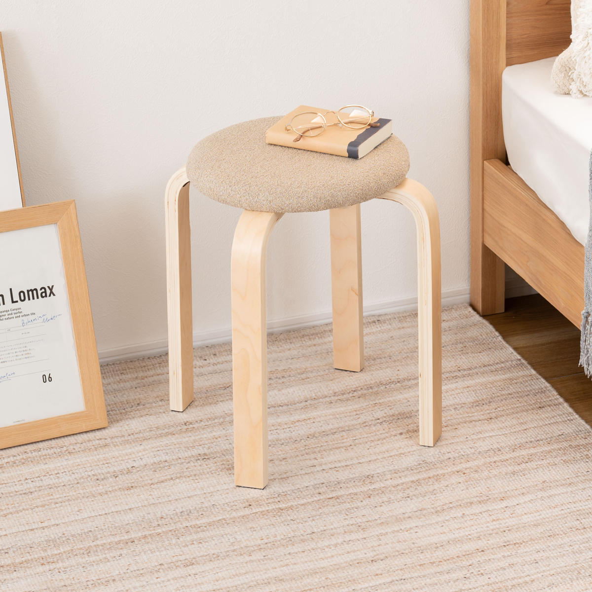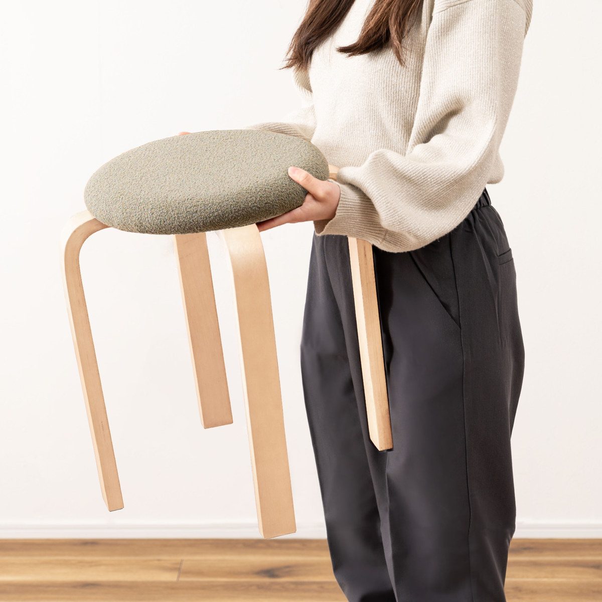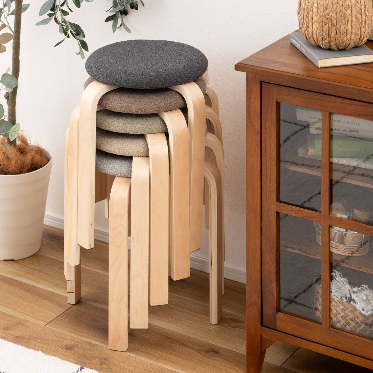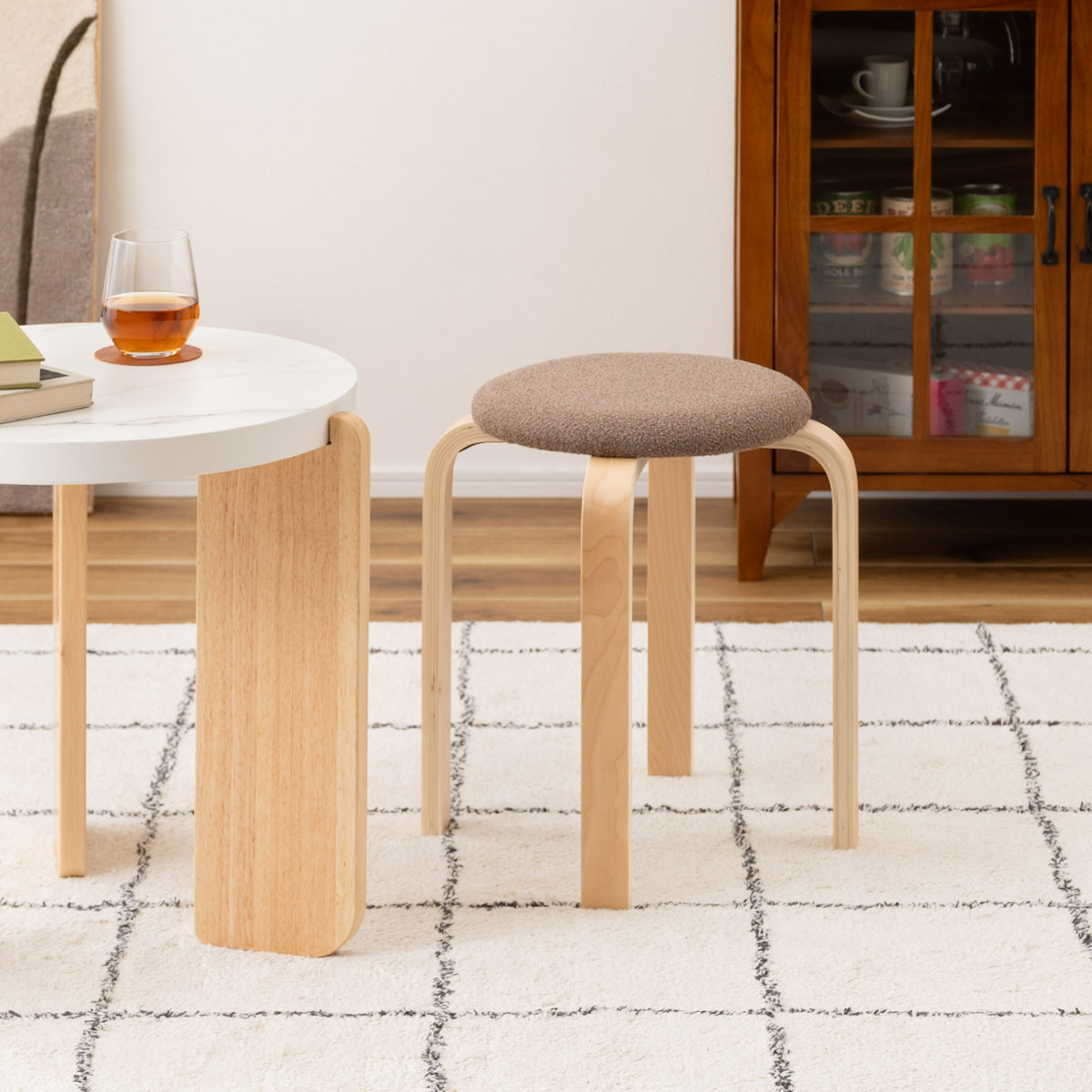 ナチュラルな空間にそっと寄り添う、丸みのあるデザインが魅力のスツールです。天然木のあたたかさと、ニュアンスカラーの落ち着いたファブリック座面が、インテリアにやさしい印象をプラスしてくれます。