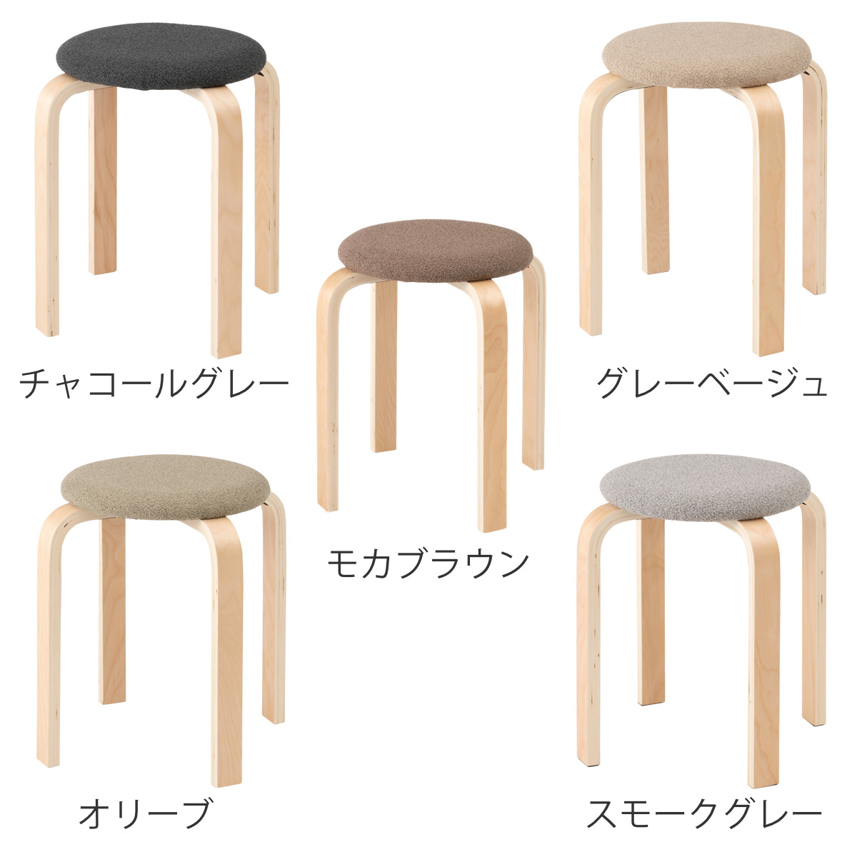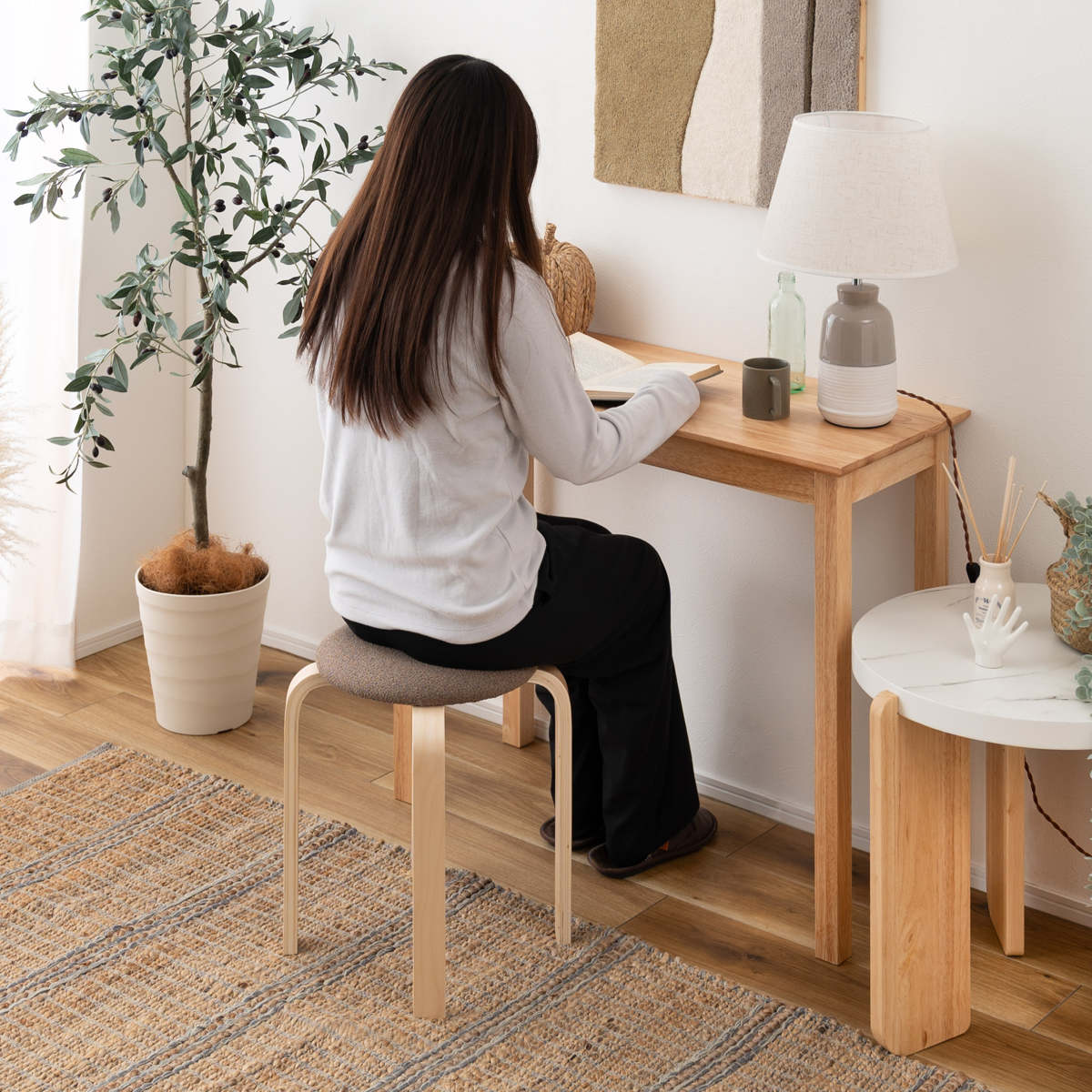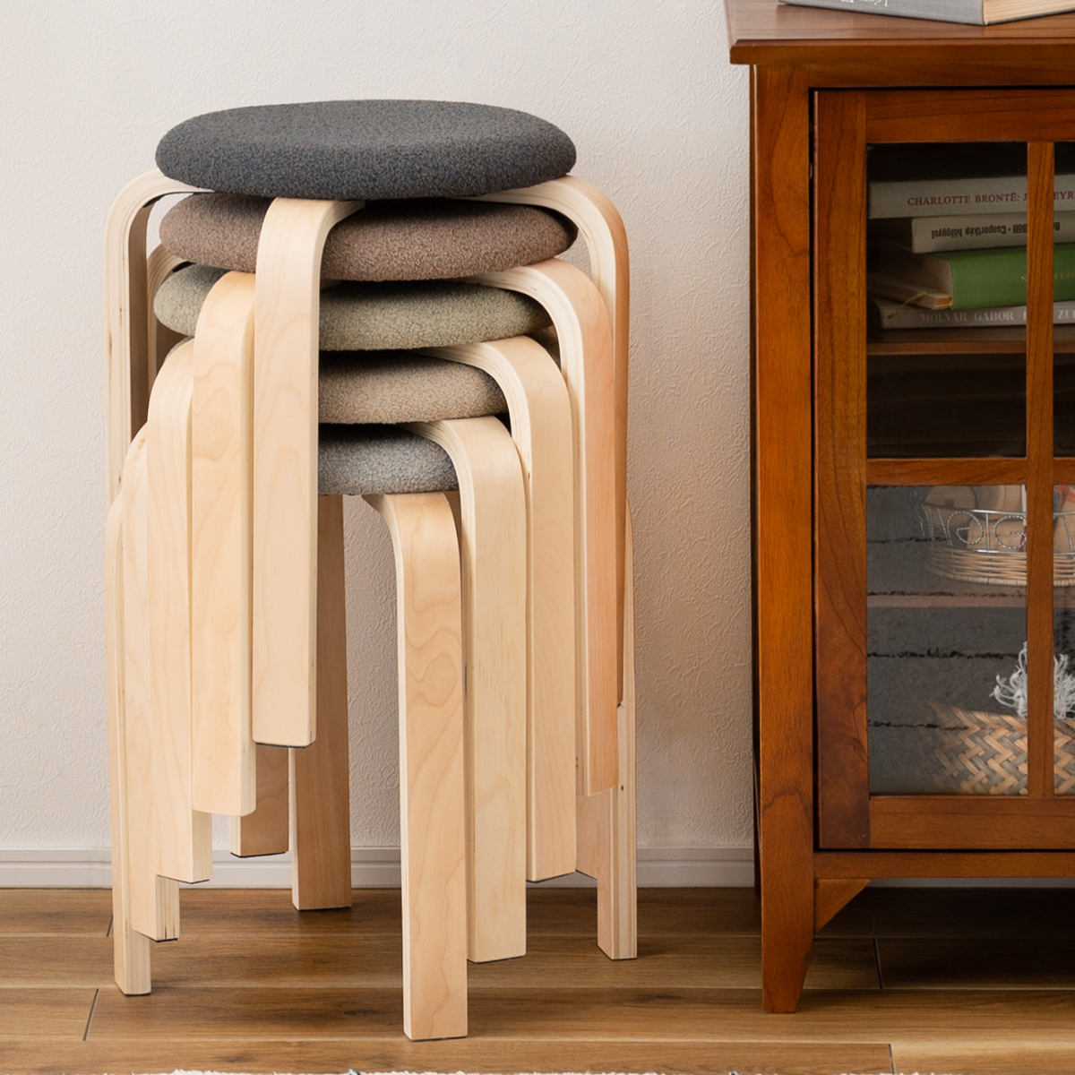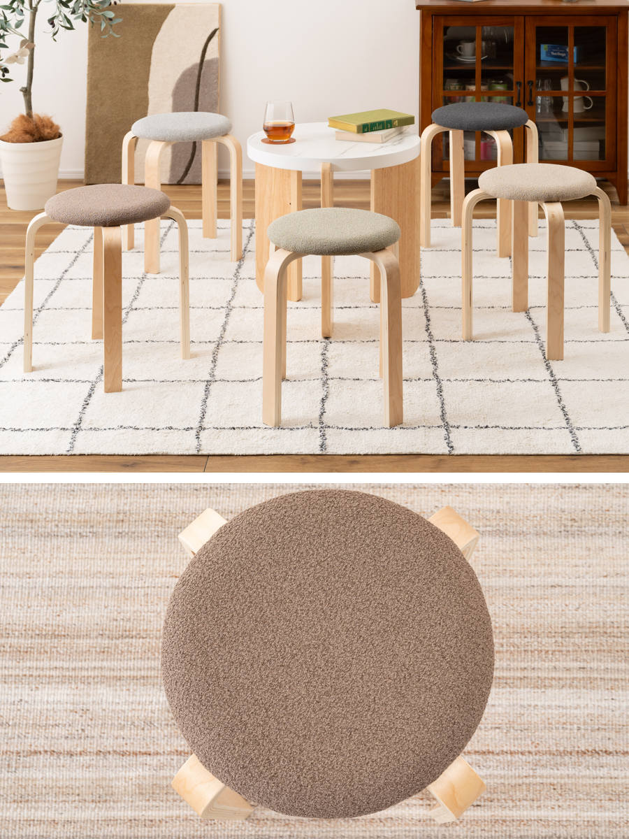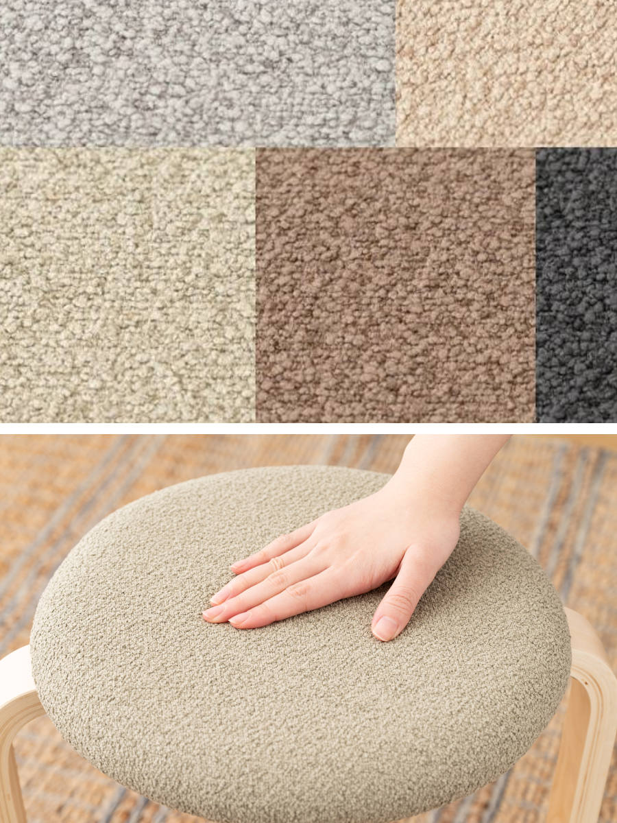 ナチュラルな空間にそっと寄り添う、丸みのあるデザインが魅力のスツールです。天然木のあたたかさと、ニュアンスカラーの落ち着いたファブリック座面が、インテリアにやさしい印象をプラスしてくれます。