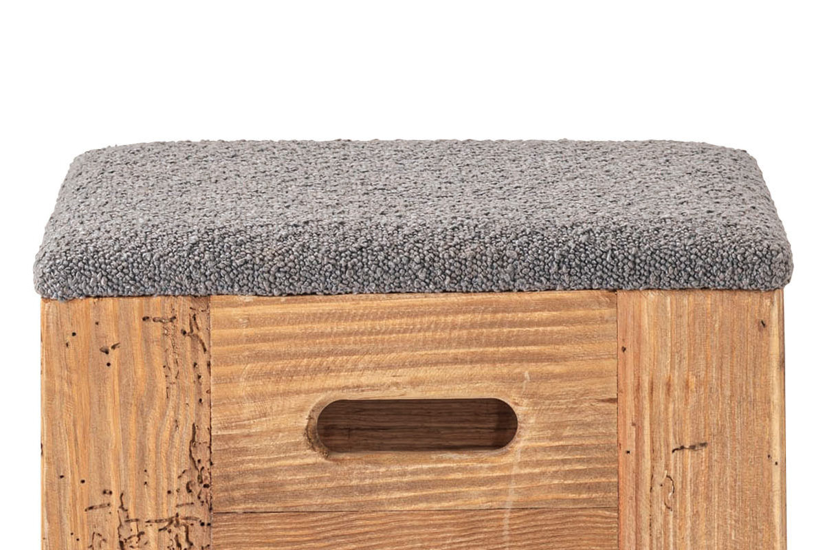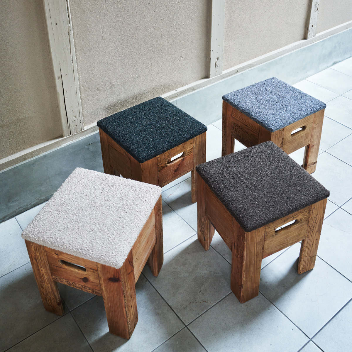 スツールの座面にはファブリック素材を使用しています。ベージュ・ブラウン・ブラック・グレーの落ち着いた色合いからお選びいただけます。パイン古材の素朴な風合いと合わさることで、北欧インテリアのようなやさしい温かさが生まれ、空間にふんわりと馴染みます。