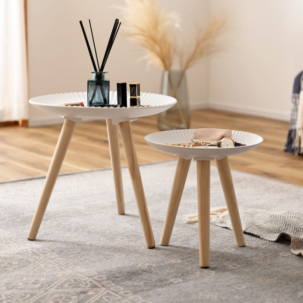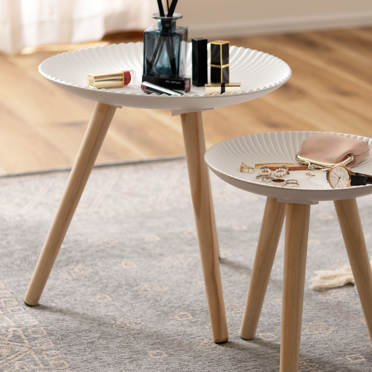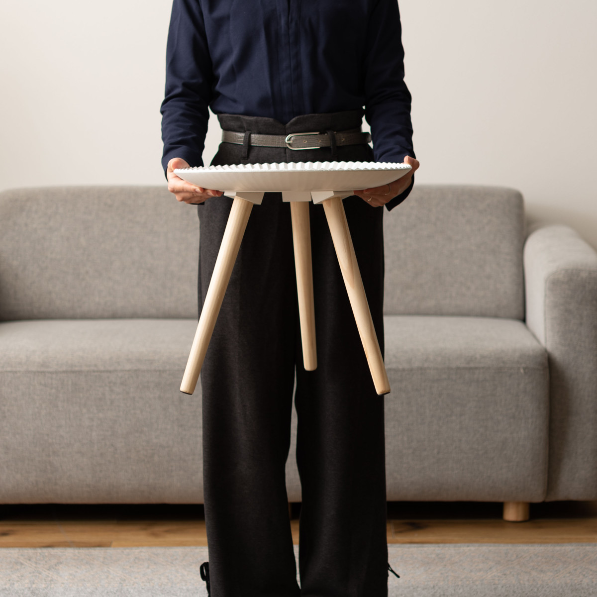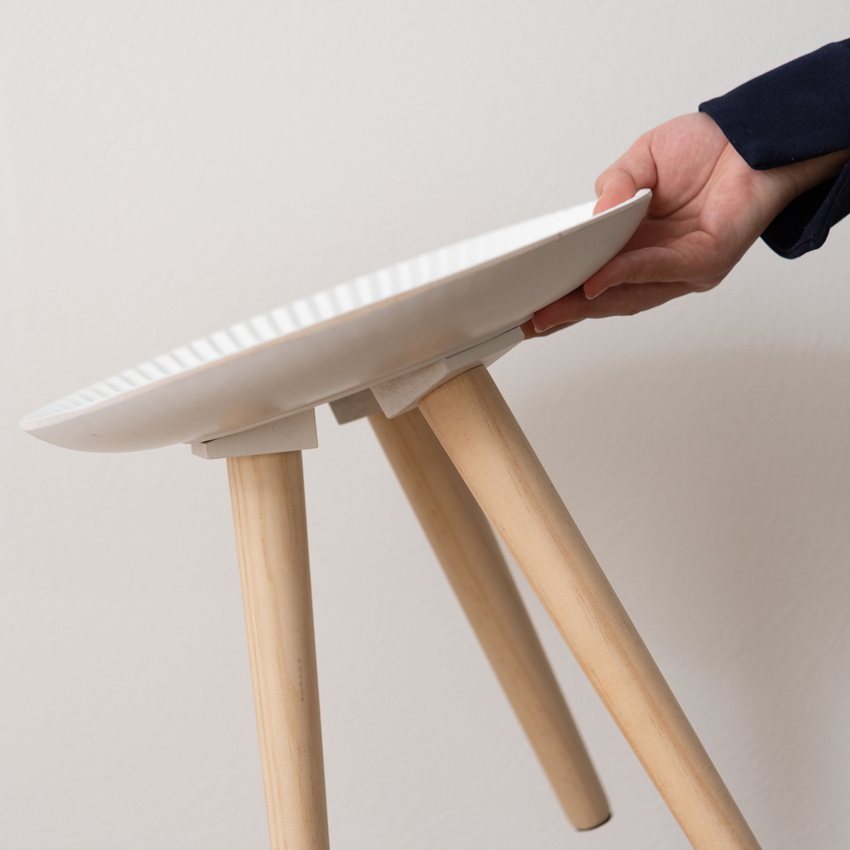 トレーには白い繊維板にやさしい色合いと自然な木目が魅力の天然木パイン材の脚を組み合わせました。空間に温もりを添えてくれます。