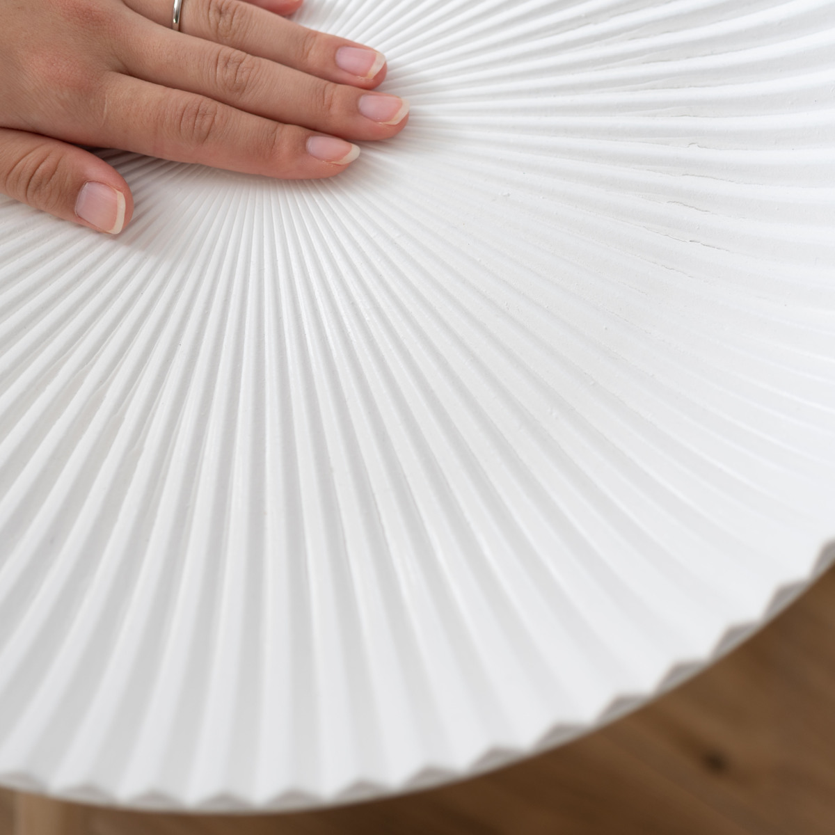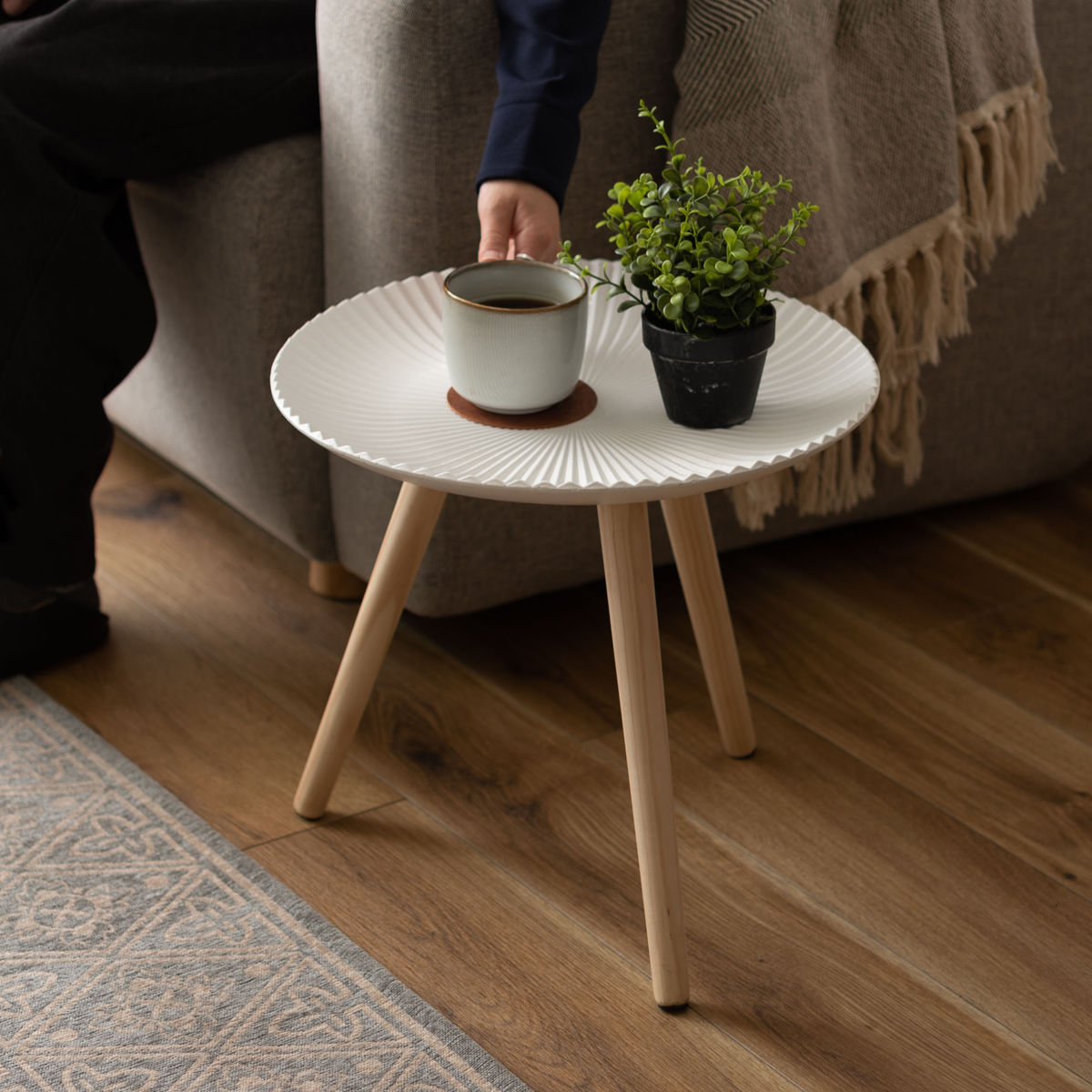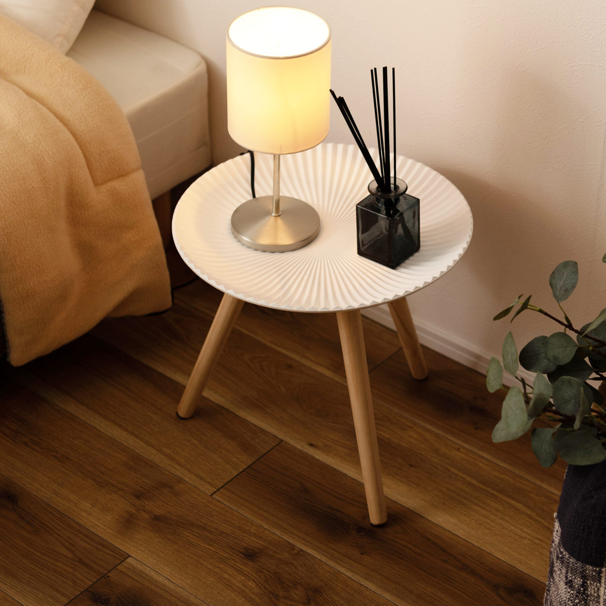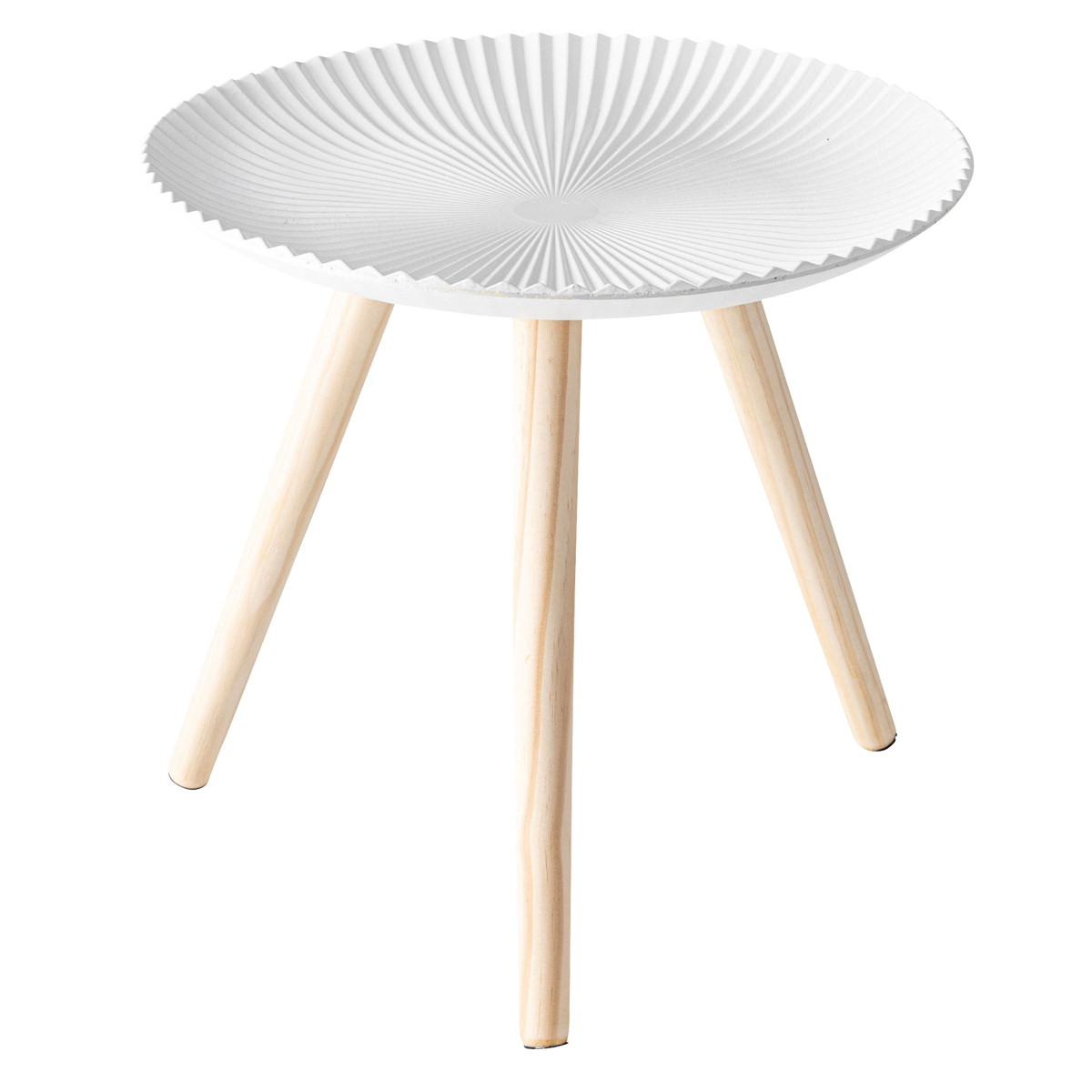 放射状に広がる繊細なラインが印象的な天板が美しいサイドテーブルです。白を基調としたシンプルな佇まいで、インテリアの色を選ばず合わせやすいデザインです。