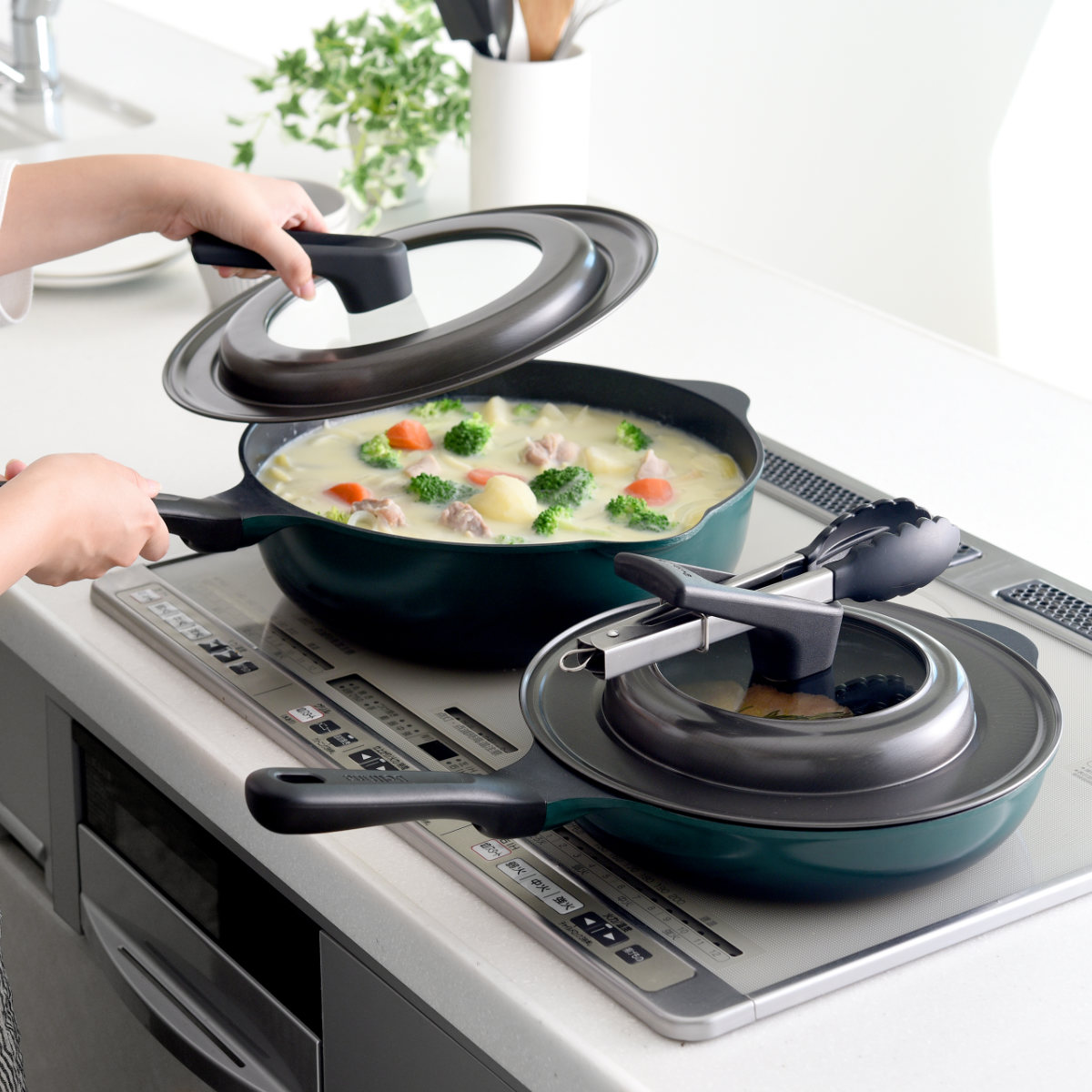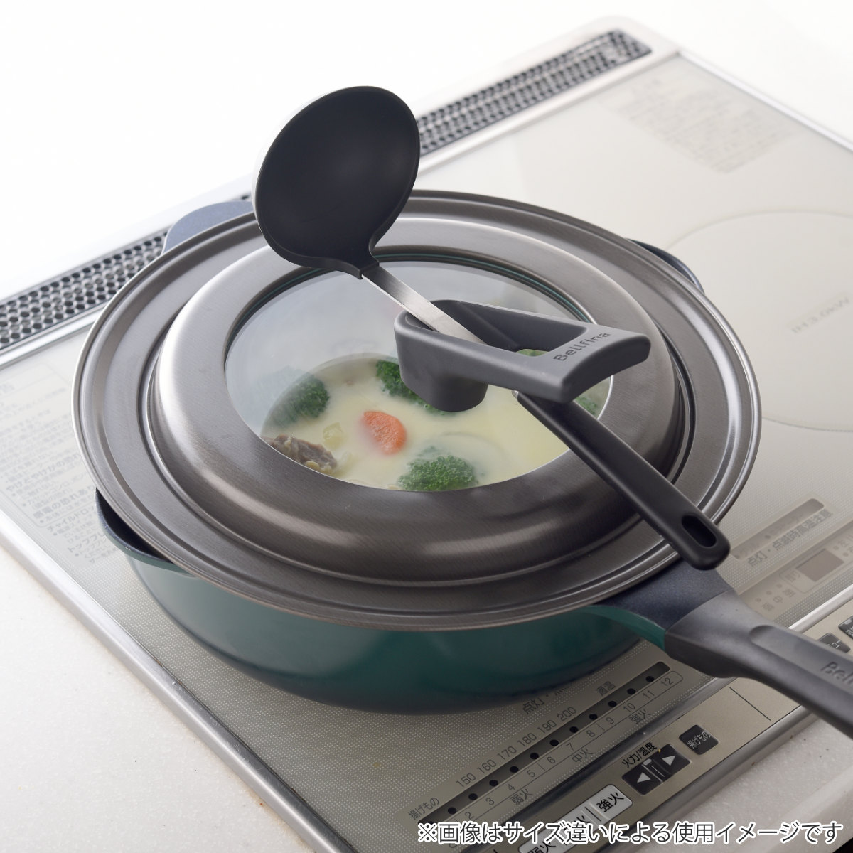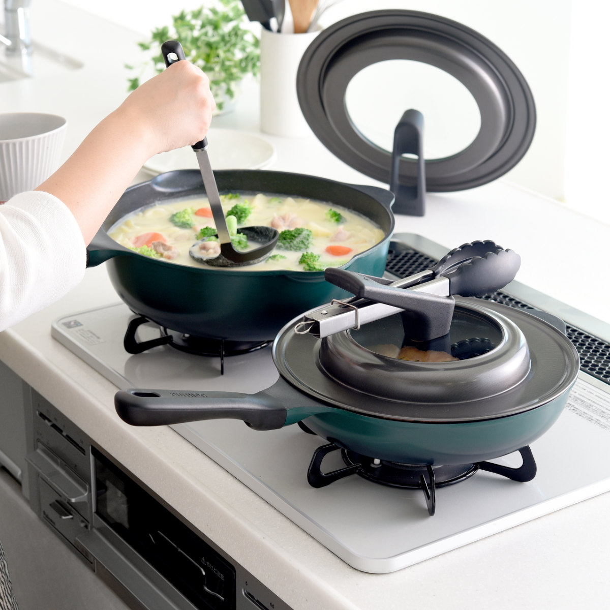 ハンドル部分にキッチンツールを一時置きできるため、蓋をしていても置き場所に困りません。手元の動線がスムーズになり、キッチン作業がより快適になります。