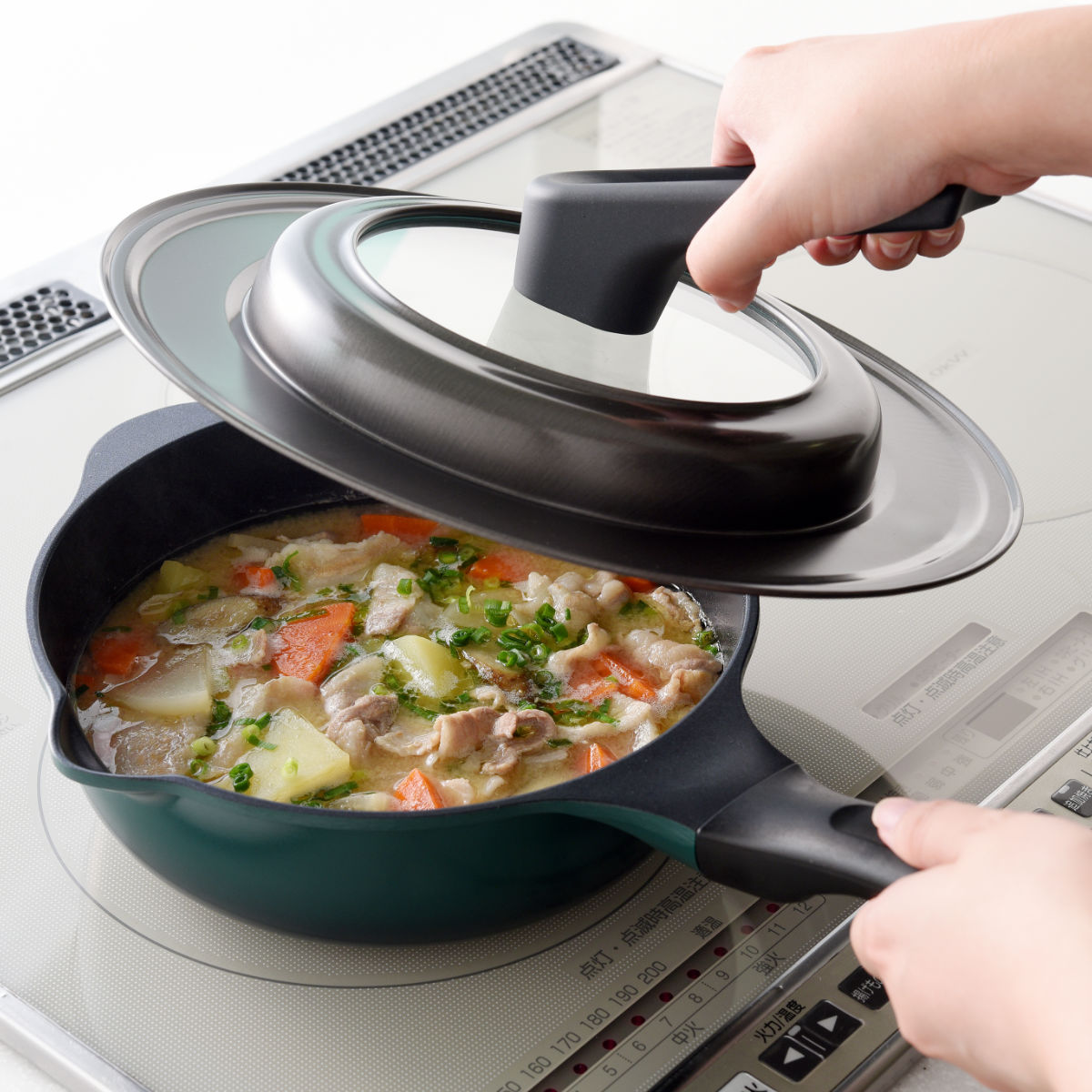 ガラス窓付きなので、蓋を開けずに加熱具合や食材の状態を確認できます。蒸し焼きや煮込み料理の火加減調整がしやすく、調理の失敗を防げます。