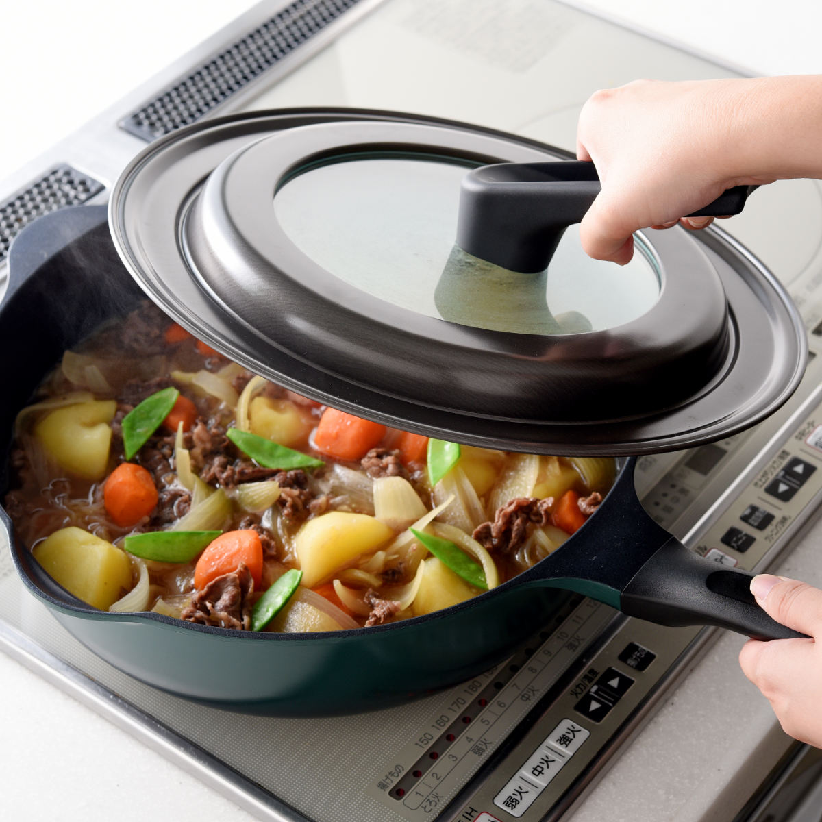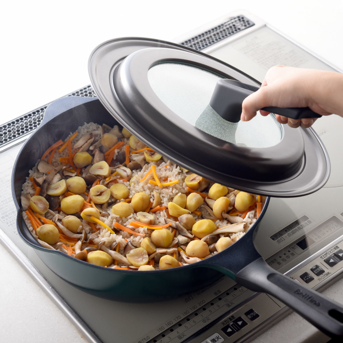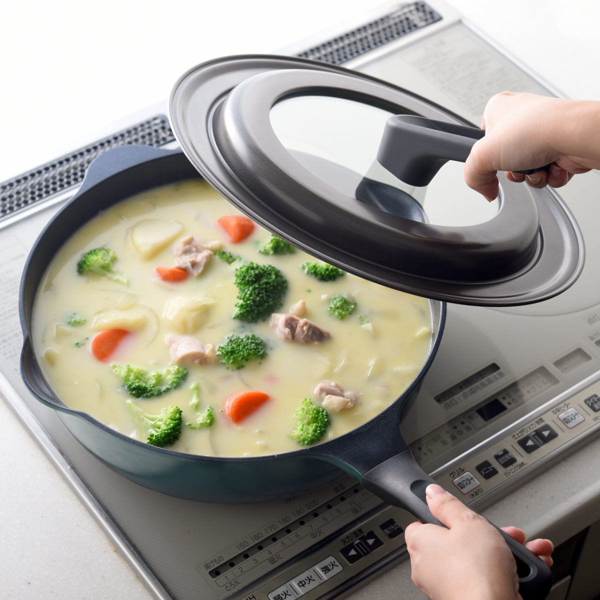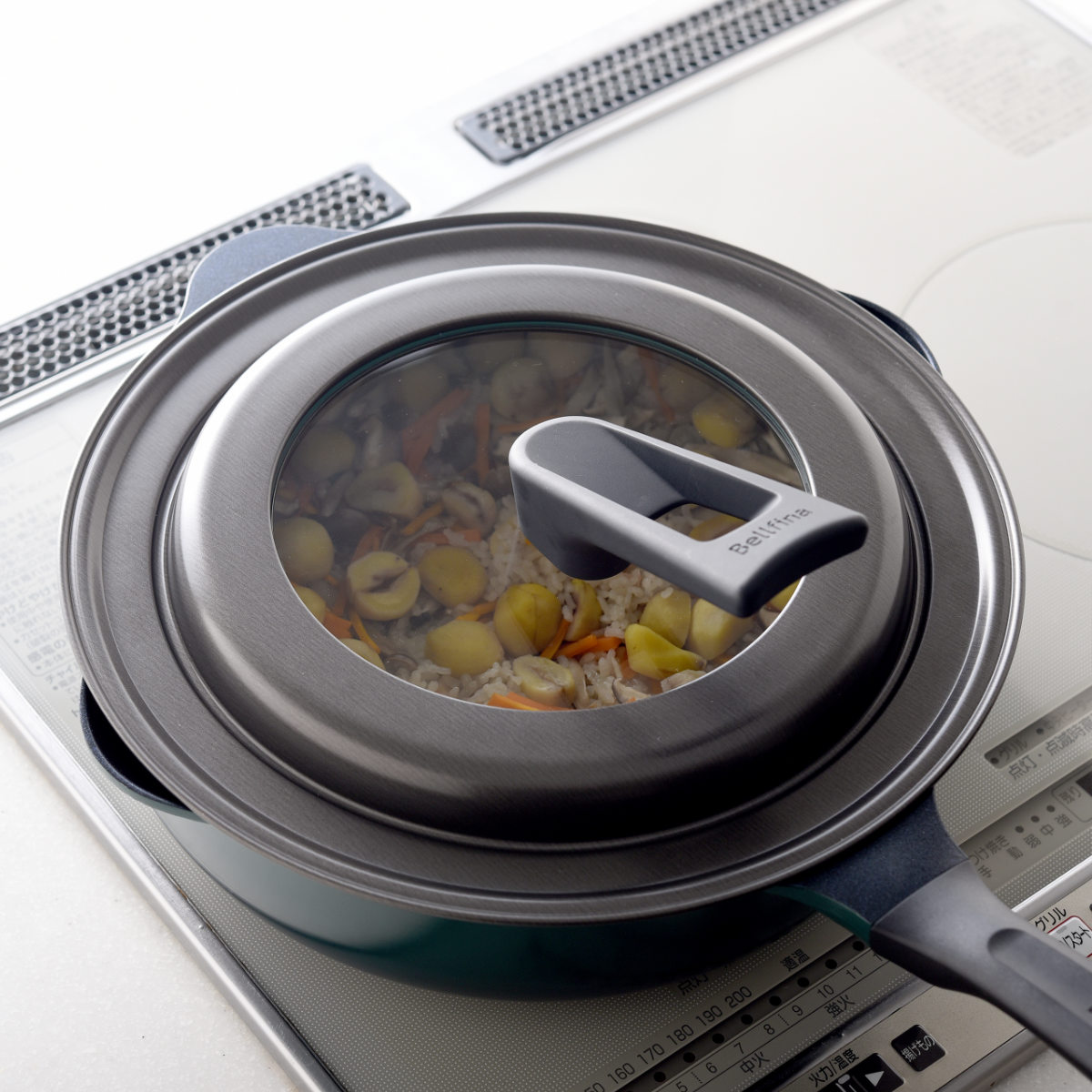 ガラス窓付きなので、蓋を開けずに加熱具合や食材の状態を確認できます。蒸し焼きや煮込み料理の火加減調整がしやすく、調理の失敗を防げます。