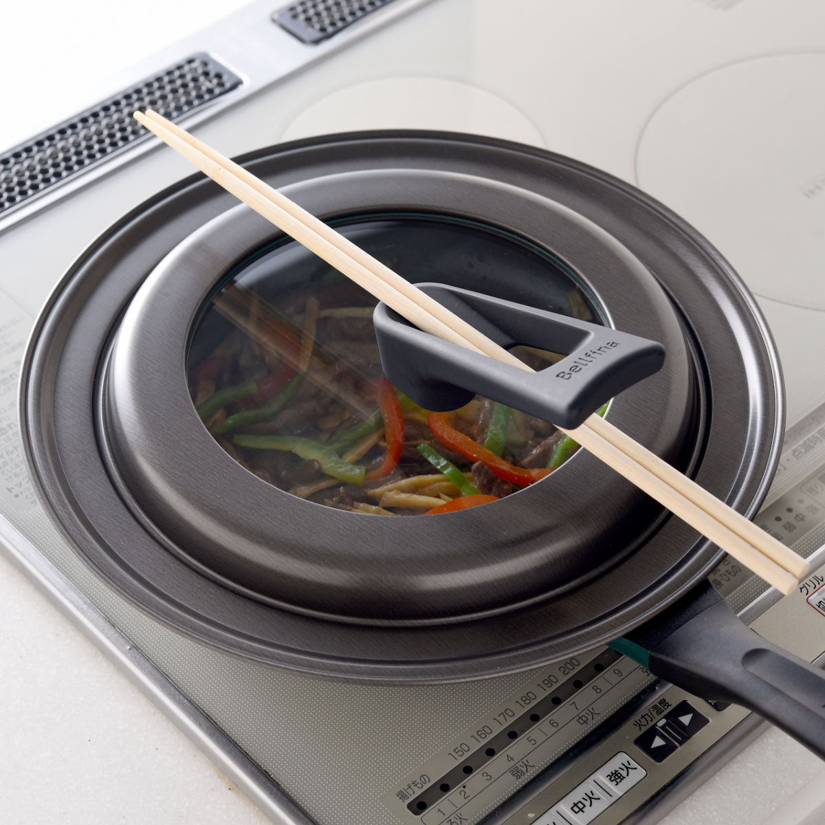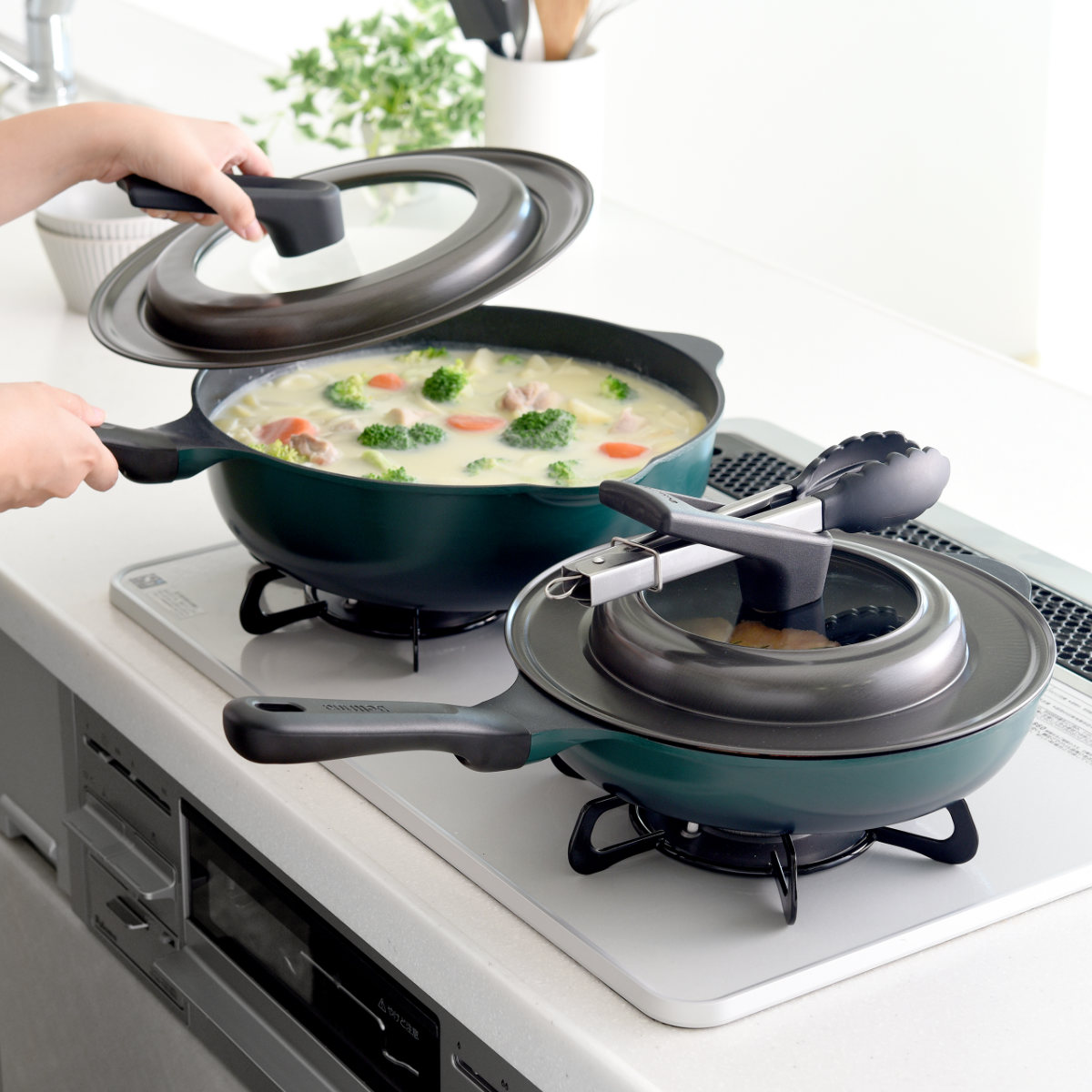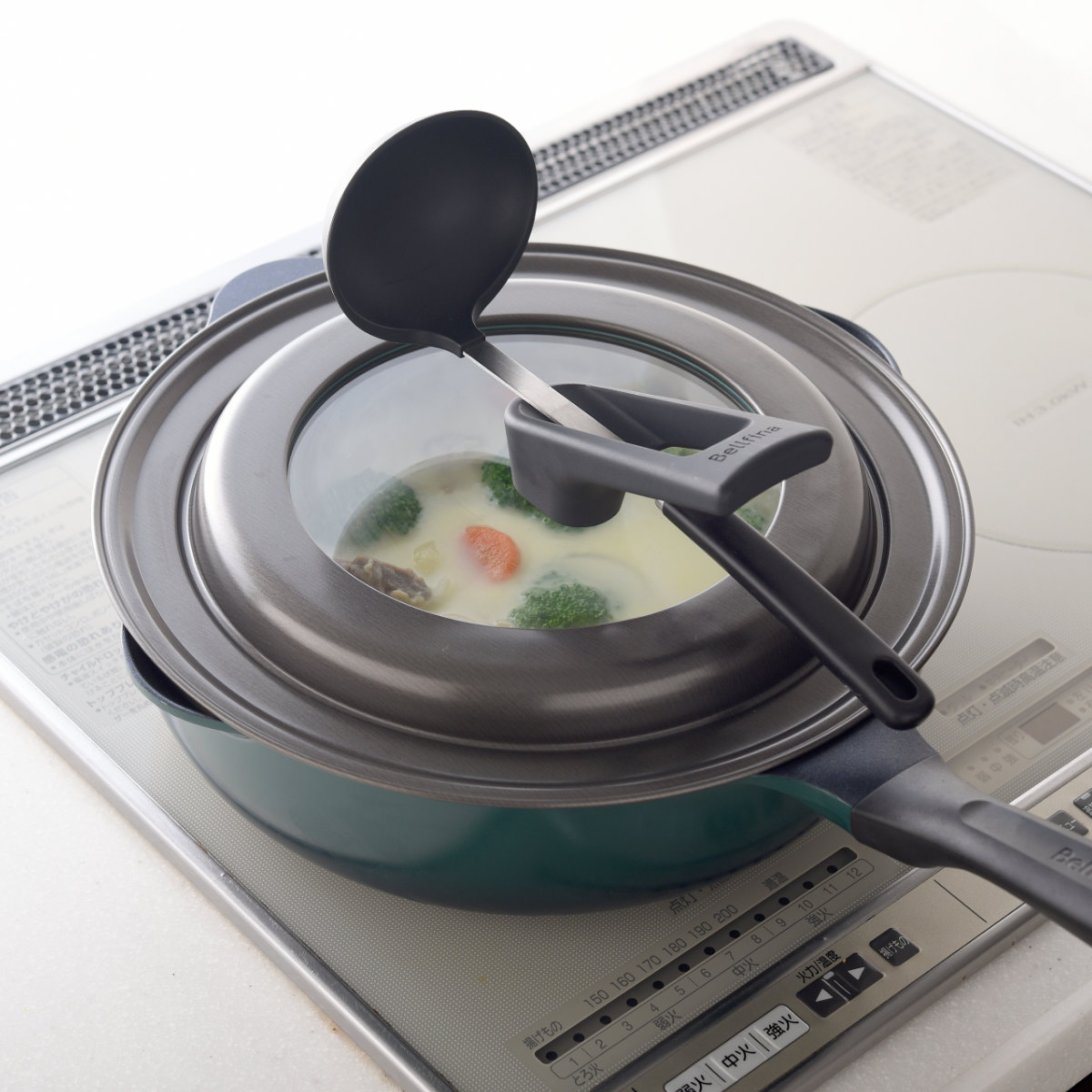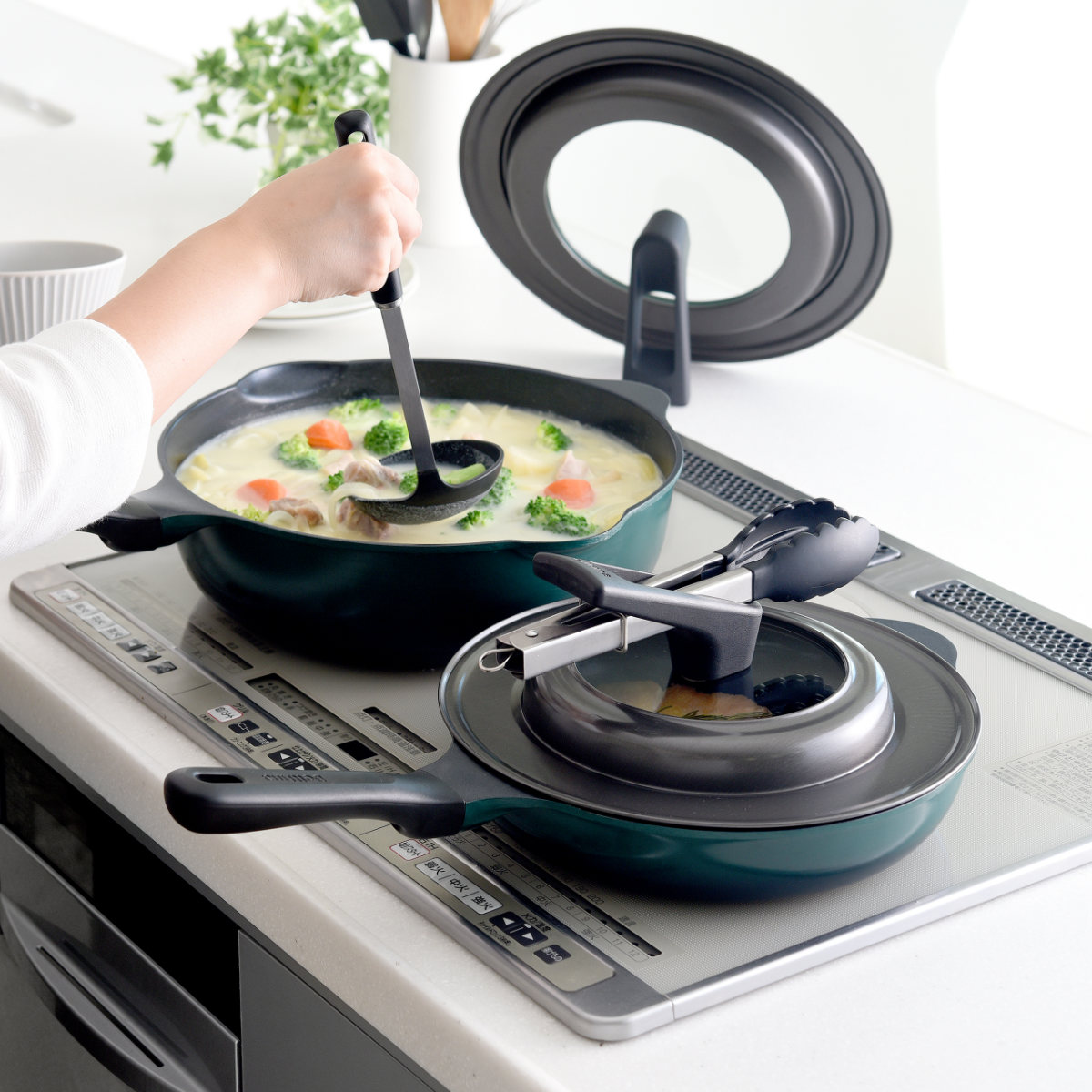 ハンドル部分にキッチンツールを一時置きできるため、蓋をしていても置き場所に困りません。手元の動線がスムーズになり、キッチン作業がより快適になります。