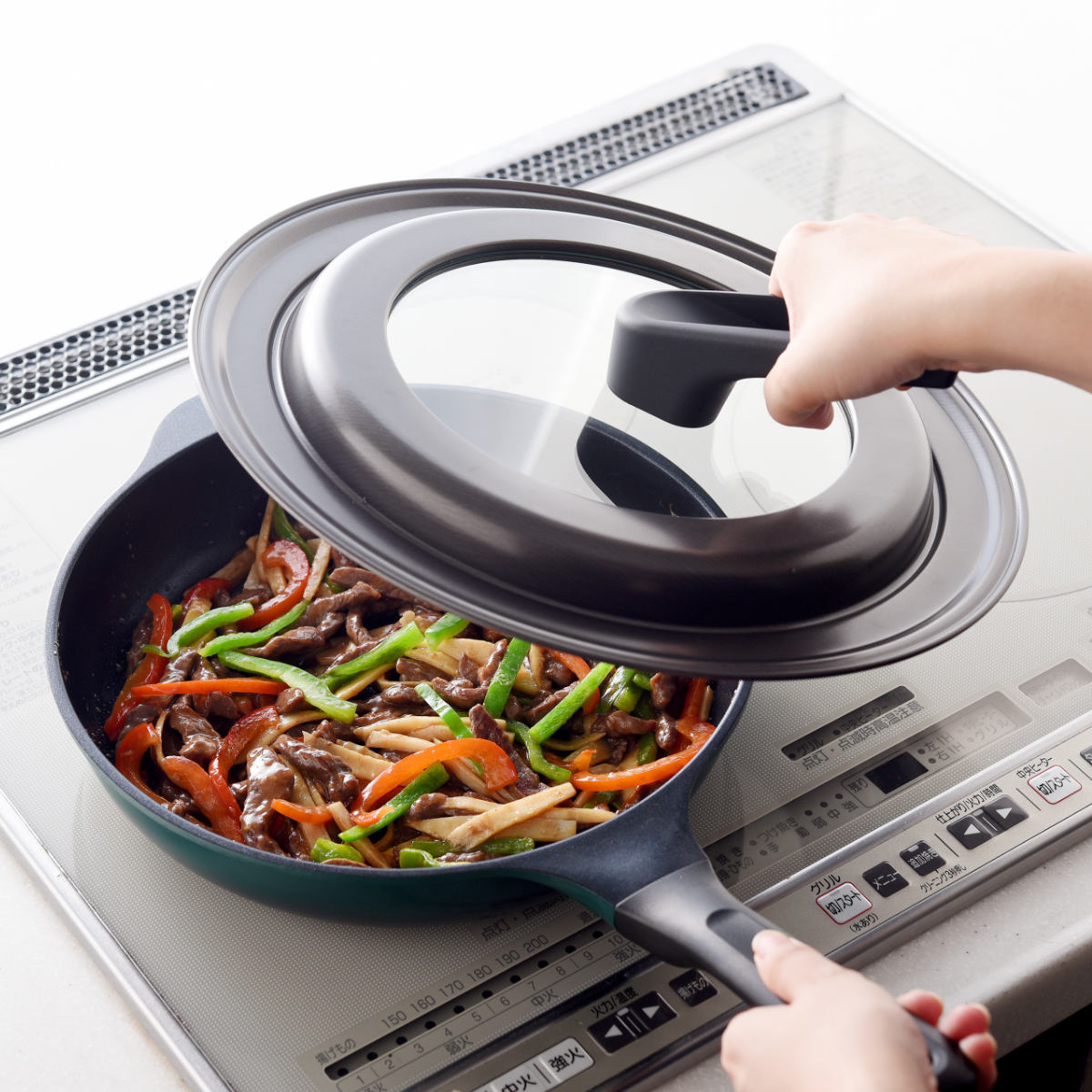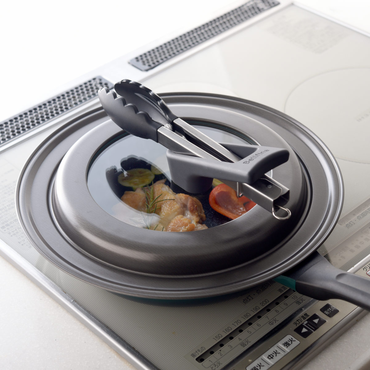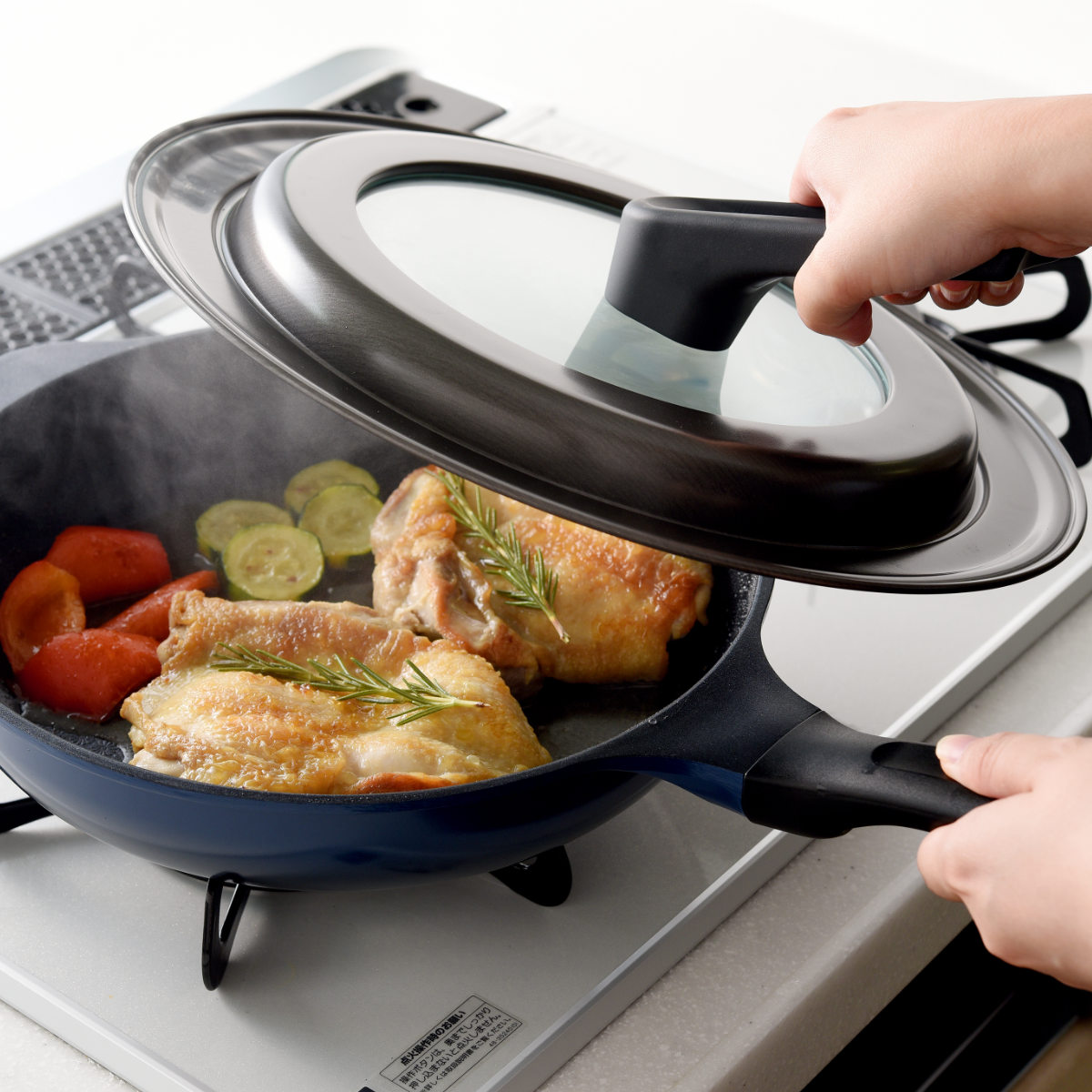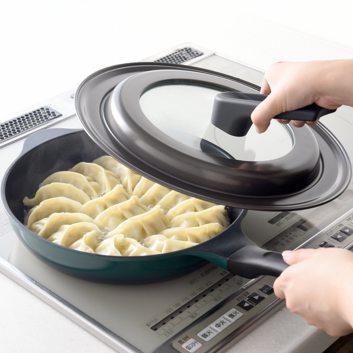 26~30cmまでの鍋やフライパンに幅広く使える蓋です。サイズごとに蓋をそろえる必要がなく、キッチンスペースを有効に使えます。