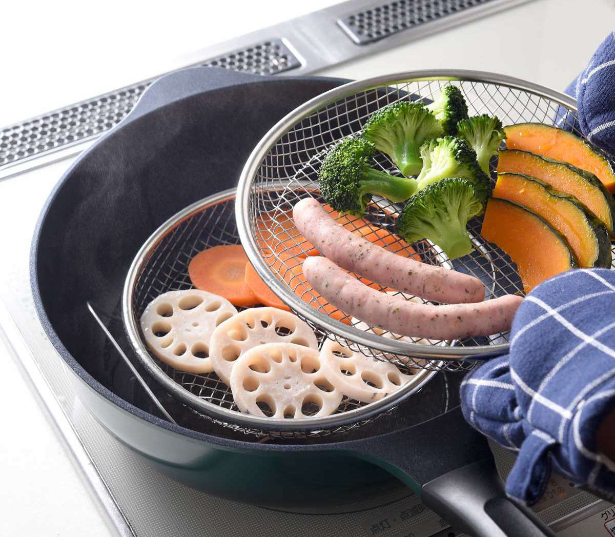 使用可能なフライパンは24cm以上と一般的なサイズです。 お持ちのフライパンで、食材の栄養素を逃さずヘルシーな蒸し料理を簡単に作れます。蒸し器やせいろがなくても気軽に楽しめます。