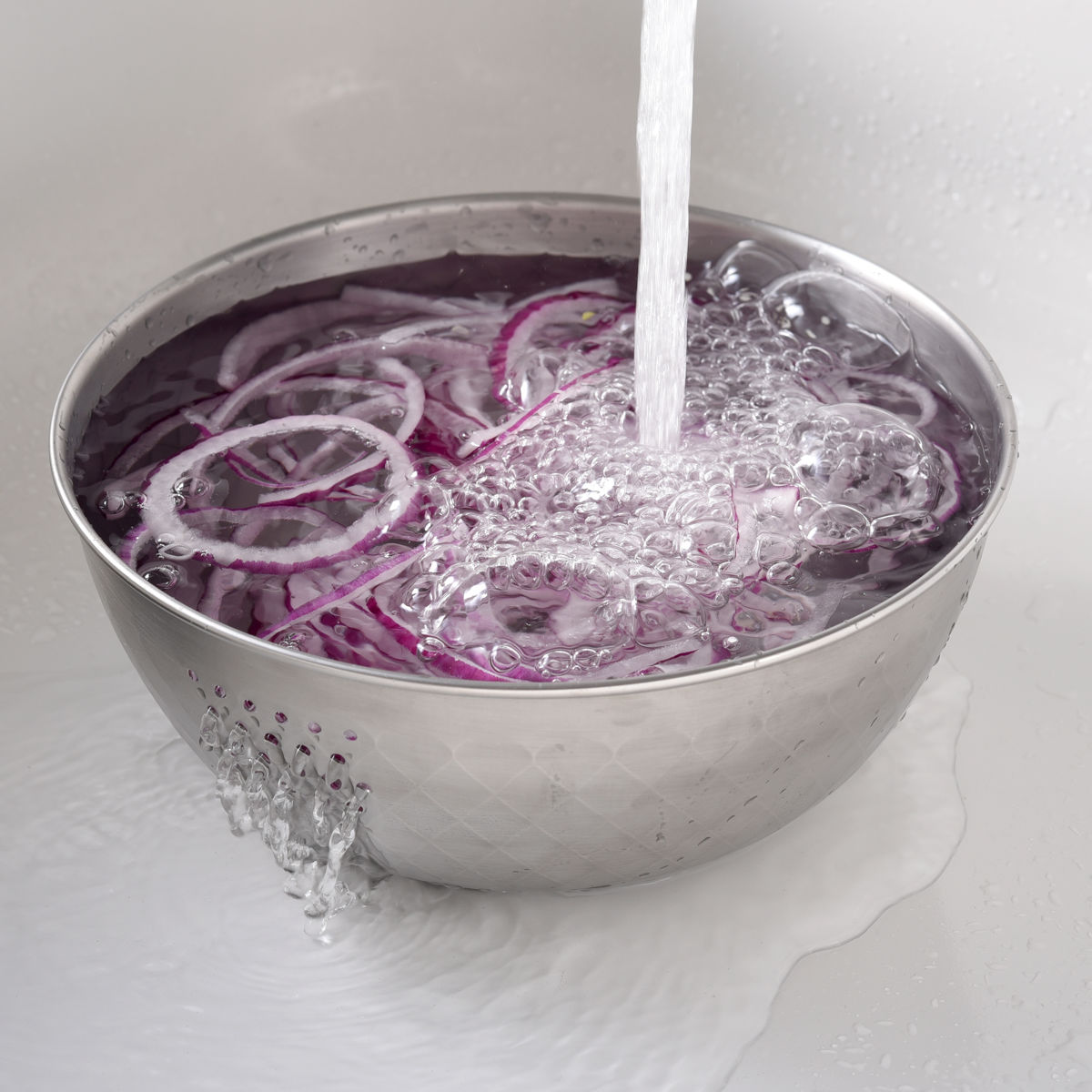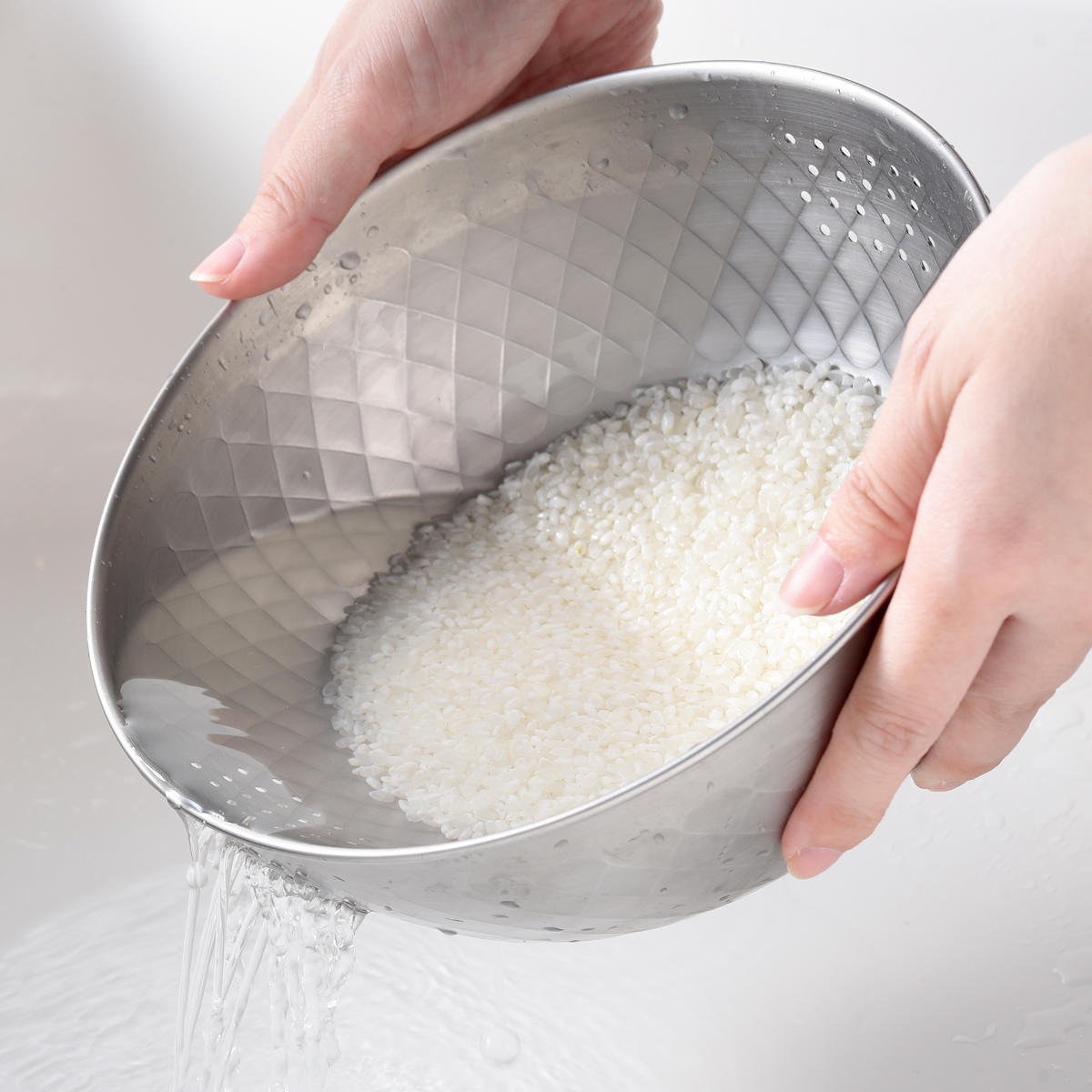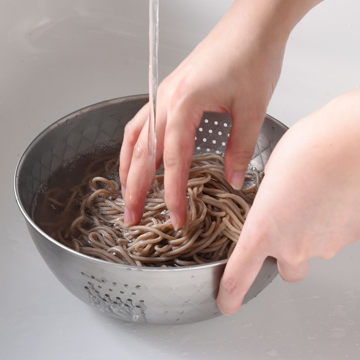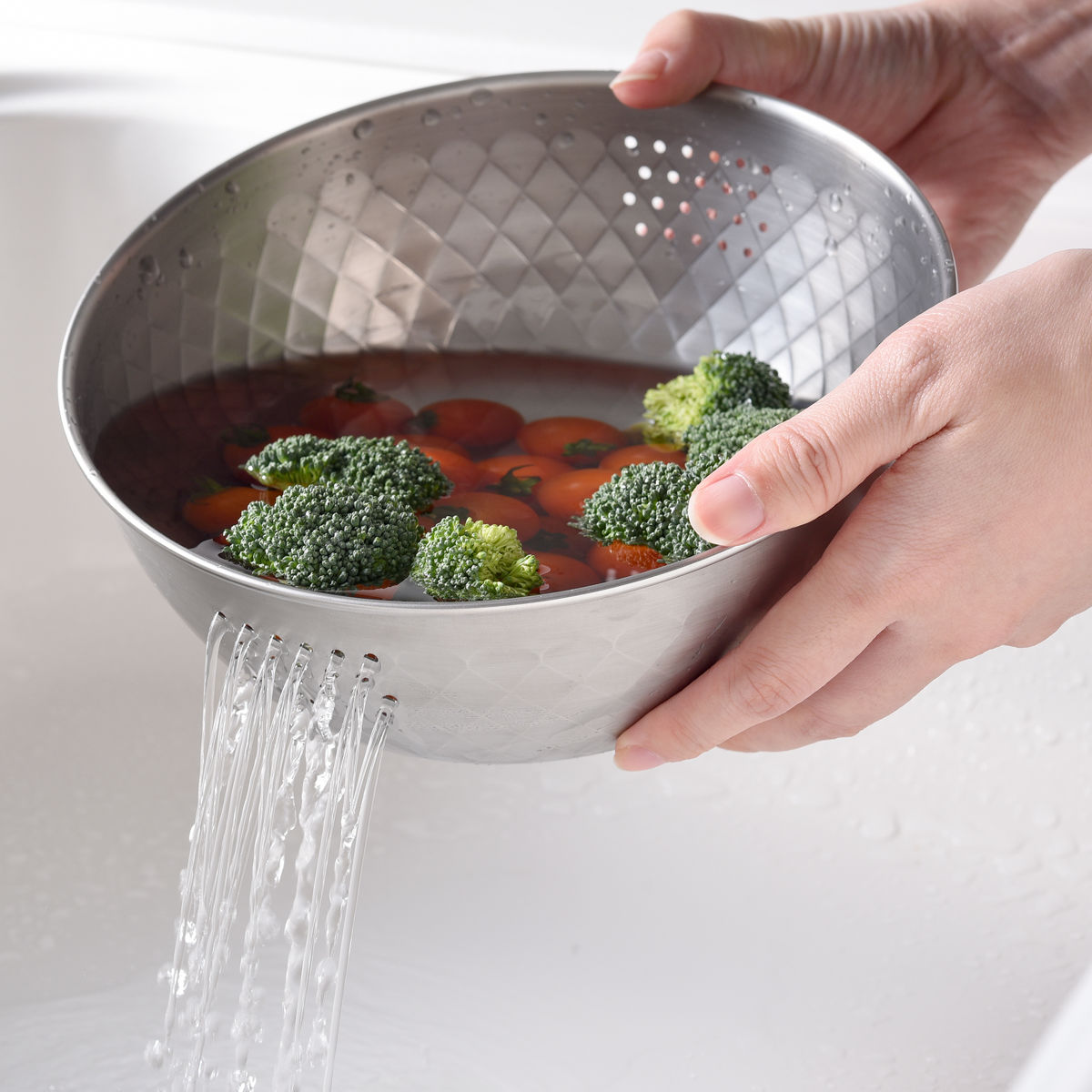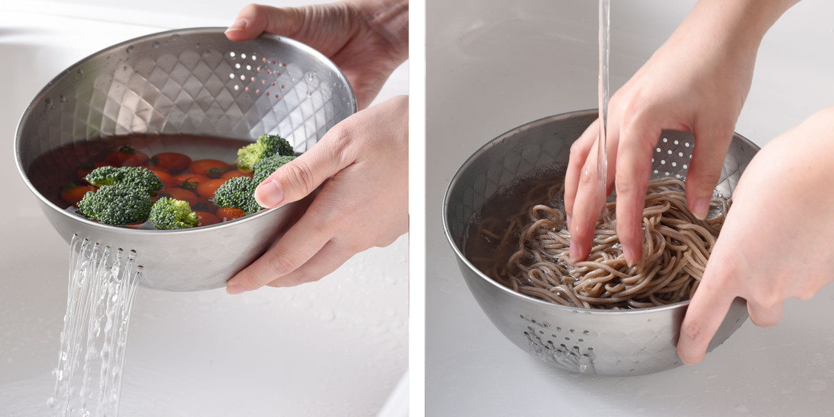 左右に水切り穴があるので、小さな野菜でもあふれずに水を切りながら洗えます。水さらしや麺類のぬめり取りなどにも便利です。