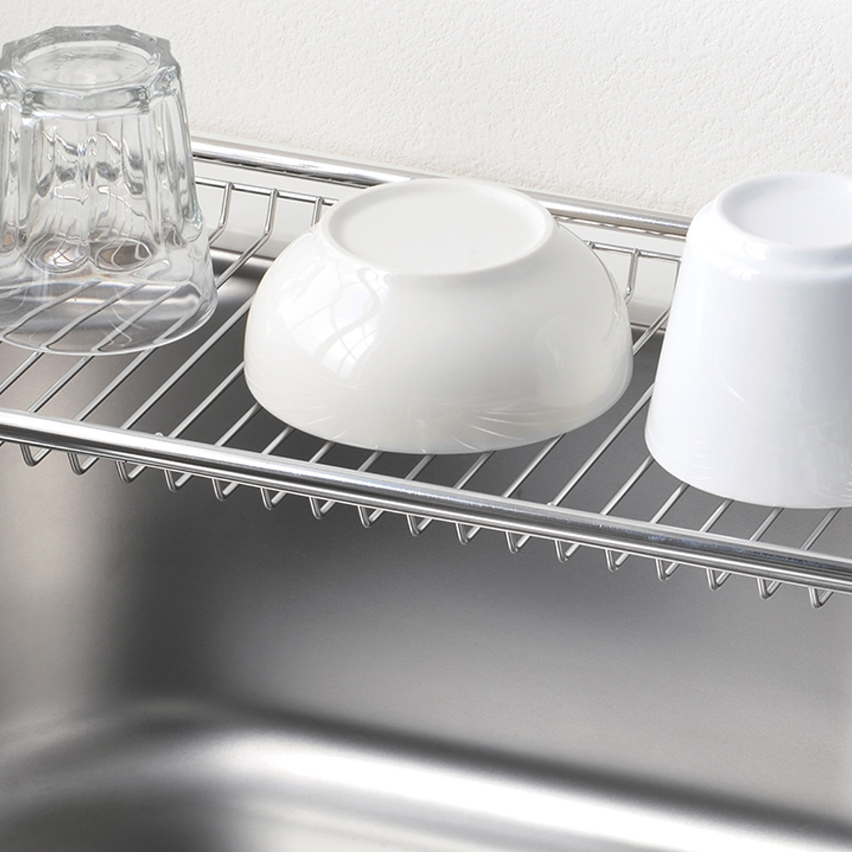 スライド式でシンクにピッタリと置ける水切りラックです。シンクの端のスペースを有効活用できるため、シンク廻りを広く使えます。使わないときは立て掛けて収納できるので、じゃまになりません。
