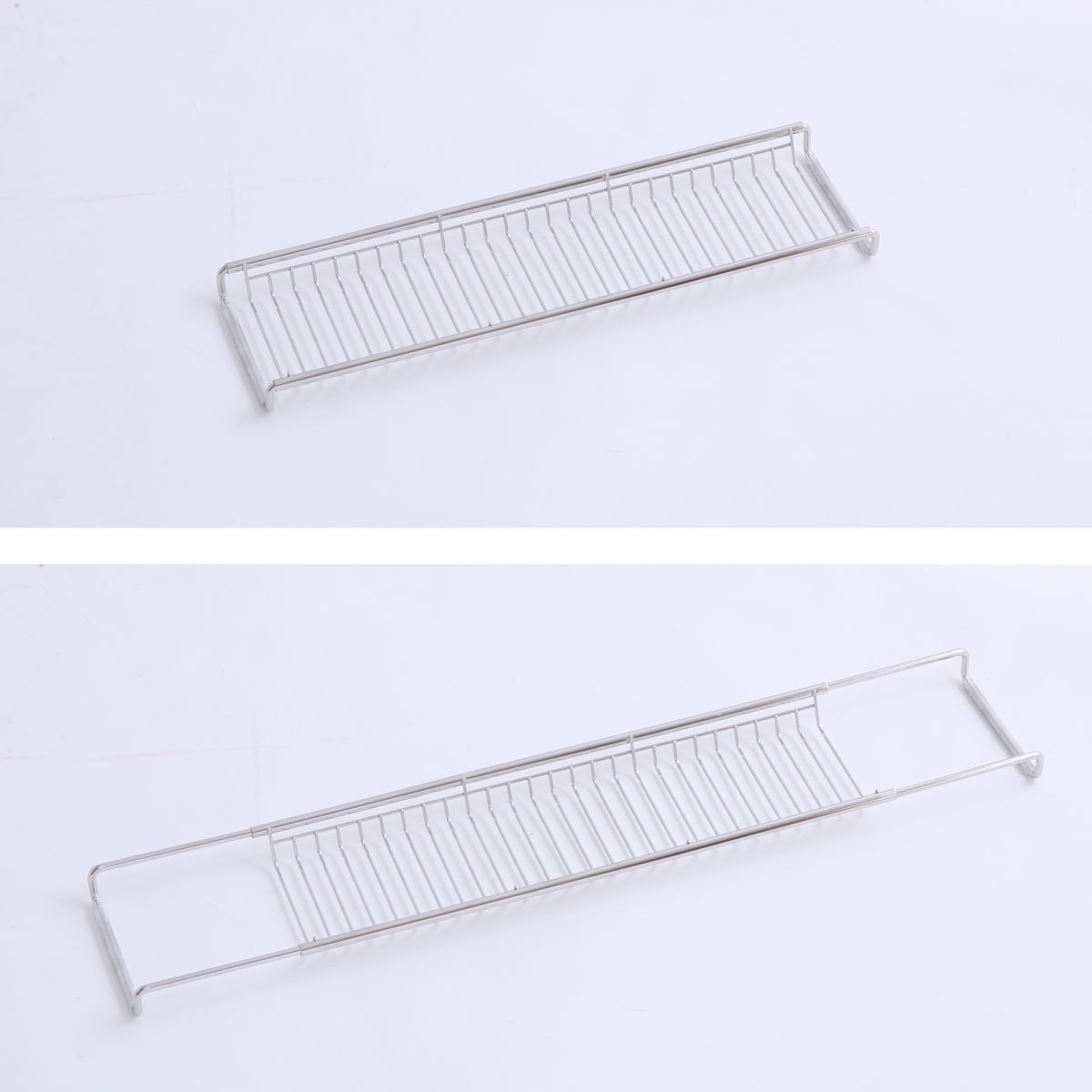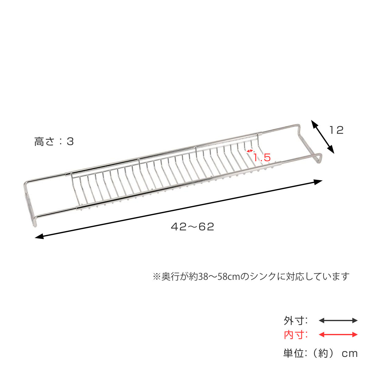 伸縮するので、ご家庭のシンクに合わせてお使いいただけます。奥行が約38~58cmのシンクに対応しています。