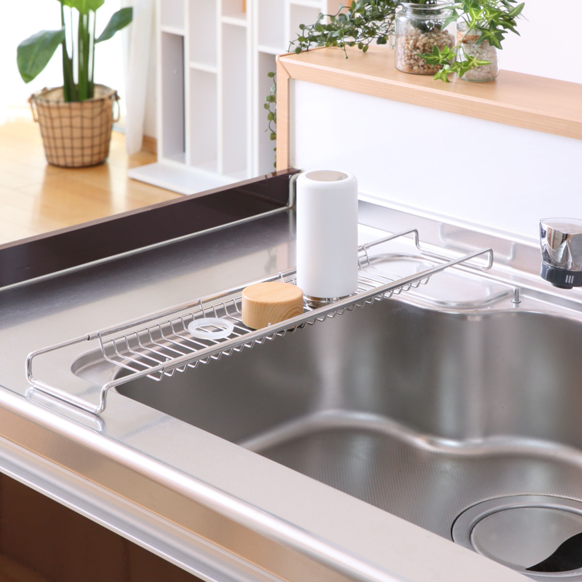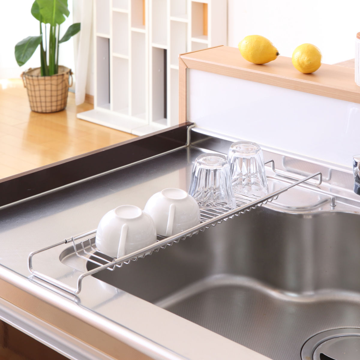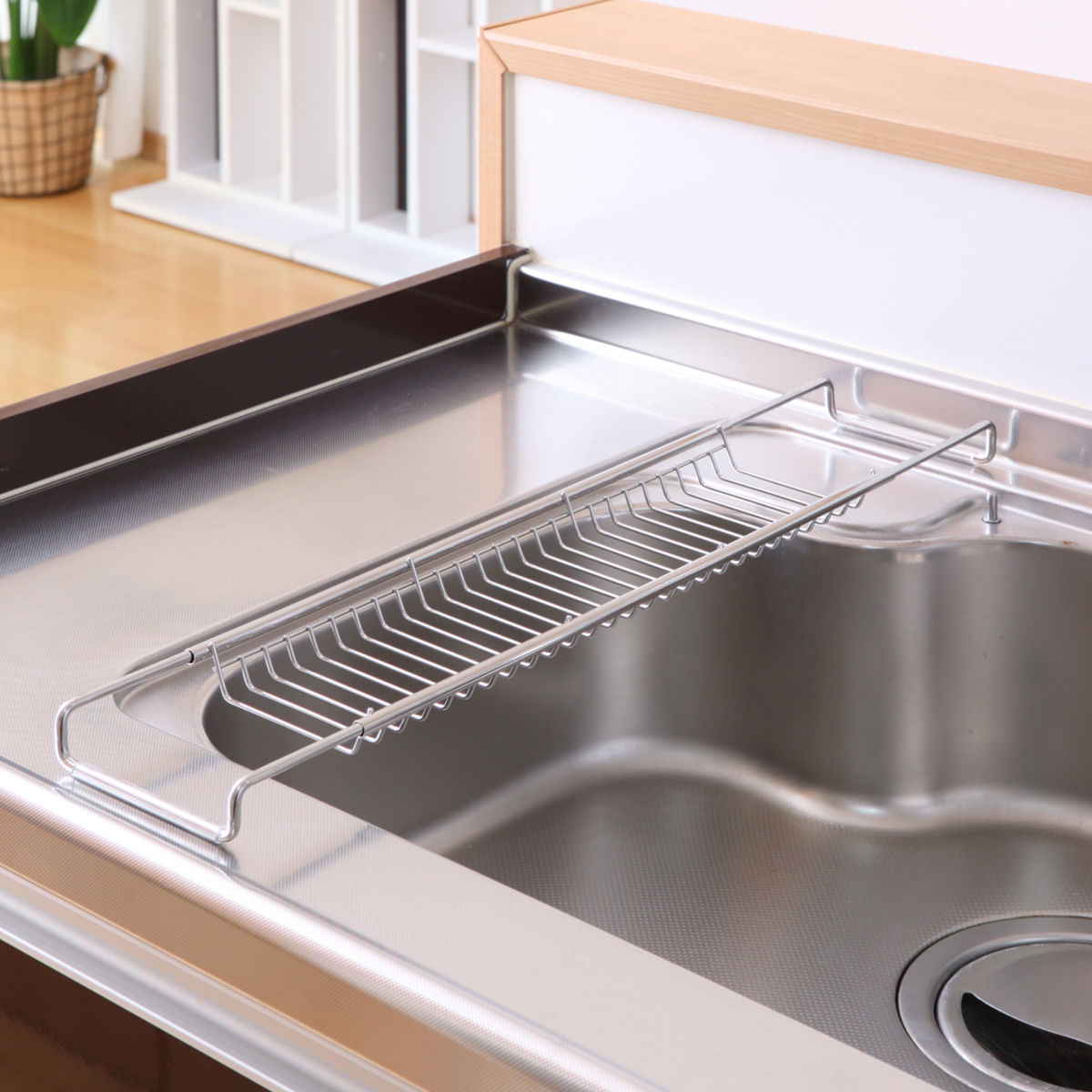 スライド式でシンクにピッタリと置ける水切りラックです。シンクの端のスペースを有効活用できるため、作業スペースを広く使えます。
