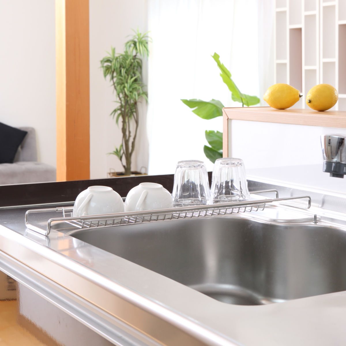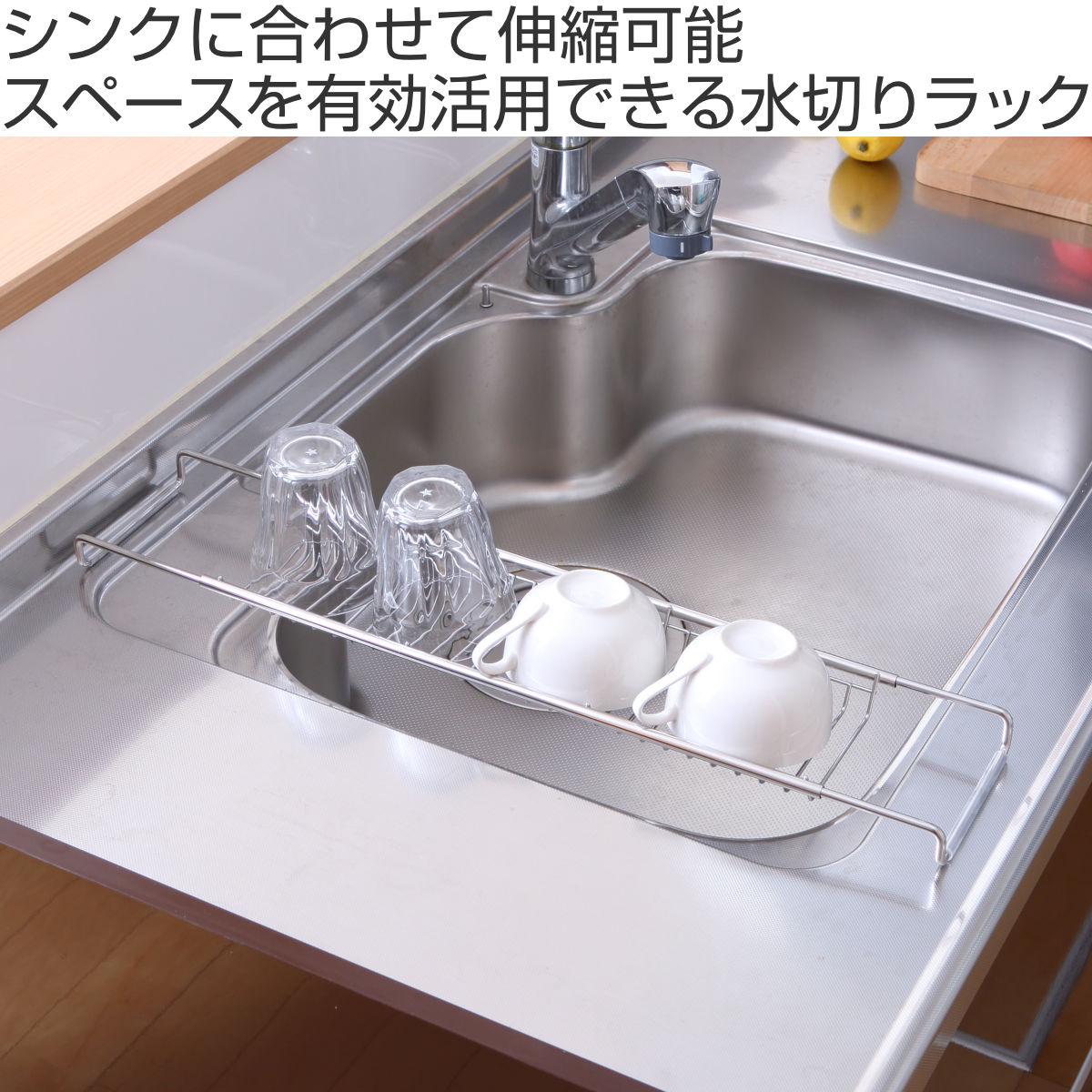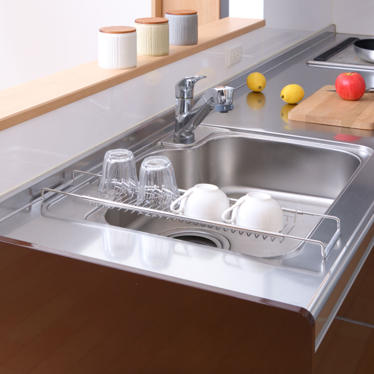 スライド式でシンクにピッタリと置ける水切りラックです。シンクの端のスペースを有効活用できるため、作業スペースを広く使えます。