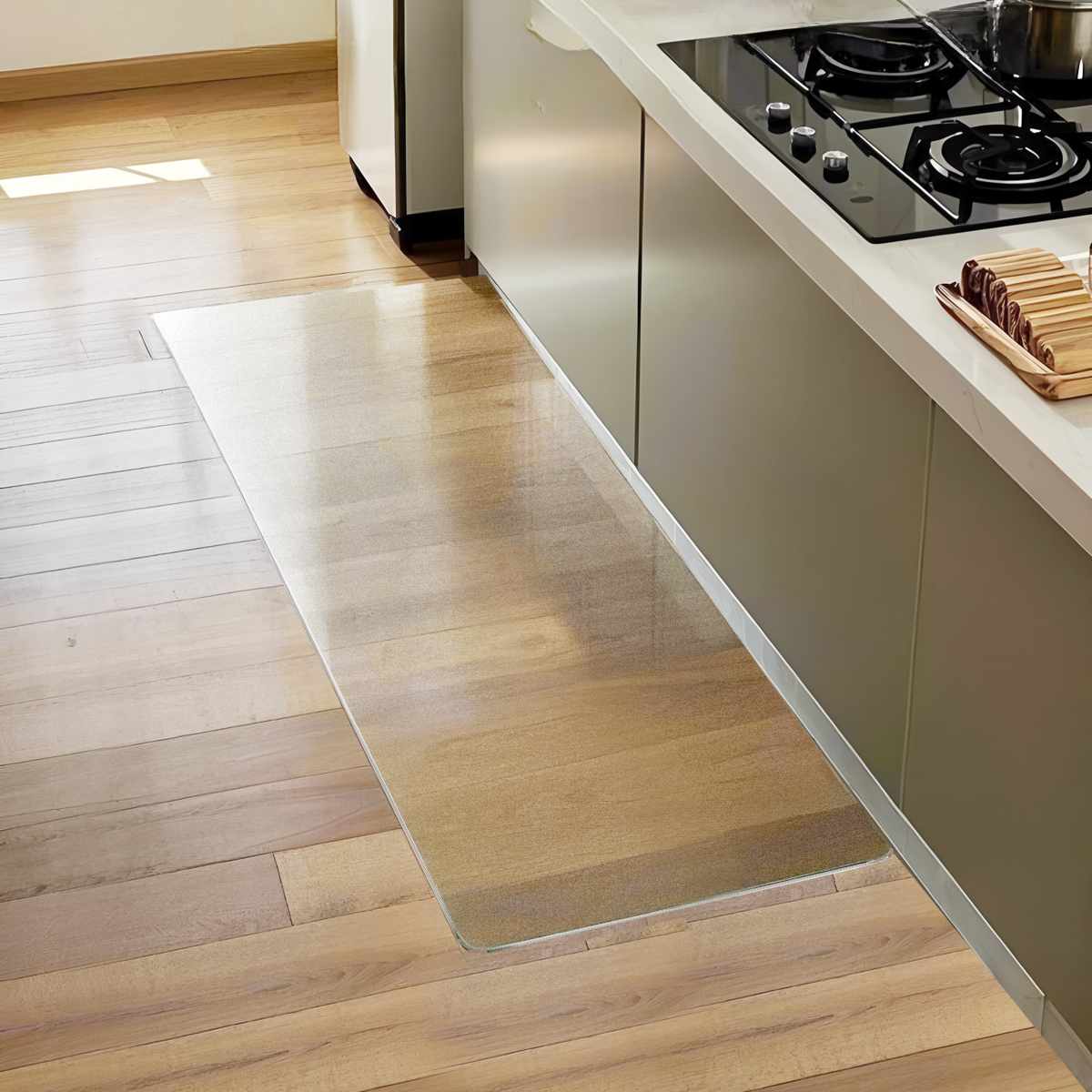 お部屋の雰囲気を損なわないクリアなデザインで、キズや汚れから床を守ってくれるキッチンマットです。厚さは1.5mmで掃除機やお掃除ロボットもスムーズに使えます。また、床暖房対応なので、季節問わずに使用できて便利です。