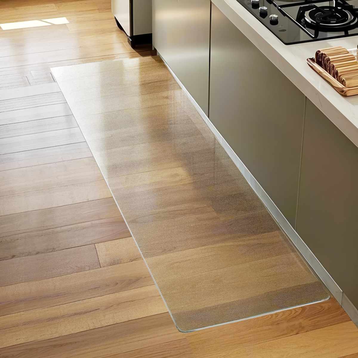 お部屋の雰囲気を損なわないクリアなデザインで、キズや汚れから床を守ってくれるキッチンマットです。厚さは1.5mmで掃除機やお掃除ロボットもスムーズに使えます。また、床暖房対応なので、季節問わずに使用できて便利です。