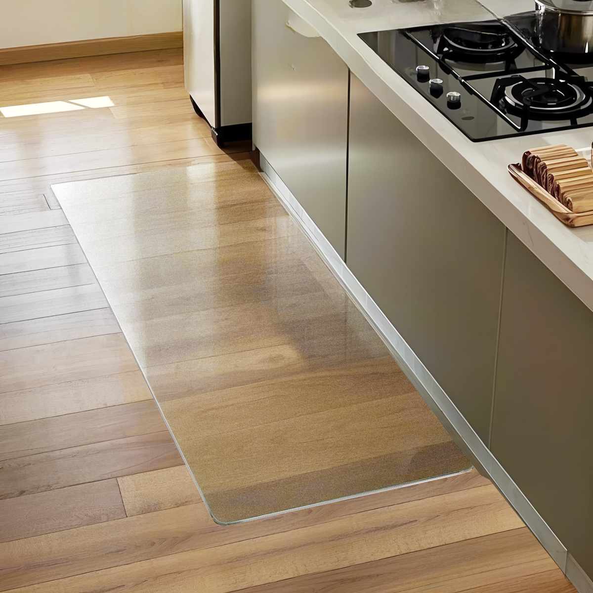お部屋の雰囲気を損なわないクリアなデザインで、キズや汚れから床を守ってくれるキッチンマットです。厚さは1.5mmで掃除機やお掃除ロボットもスムーズに使えます。また、床暖房対応なので、季節問わずに使用できて便利です。
