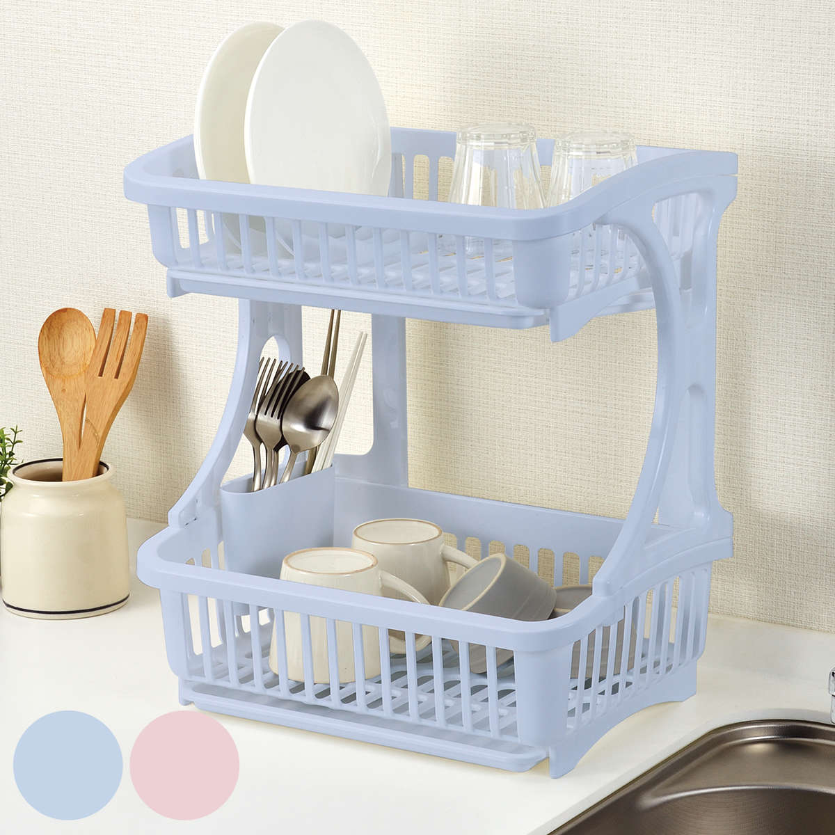 ![]() 2段式バスケット | ![]() 水切りカゴ | ![]() 水切りカゴ 水が流れるトレー |