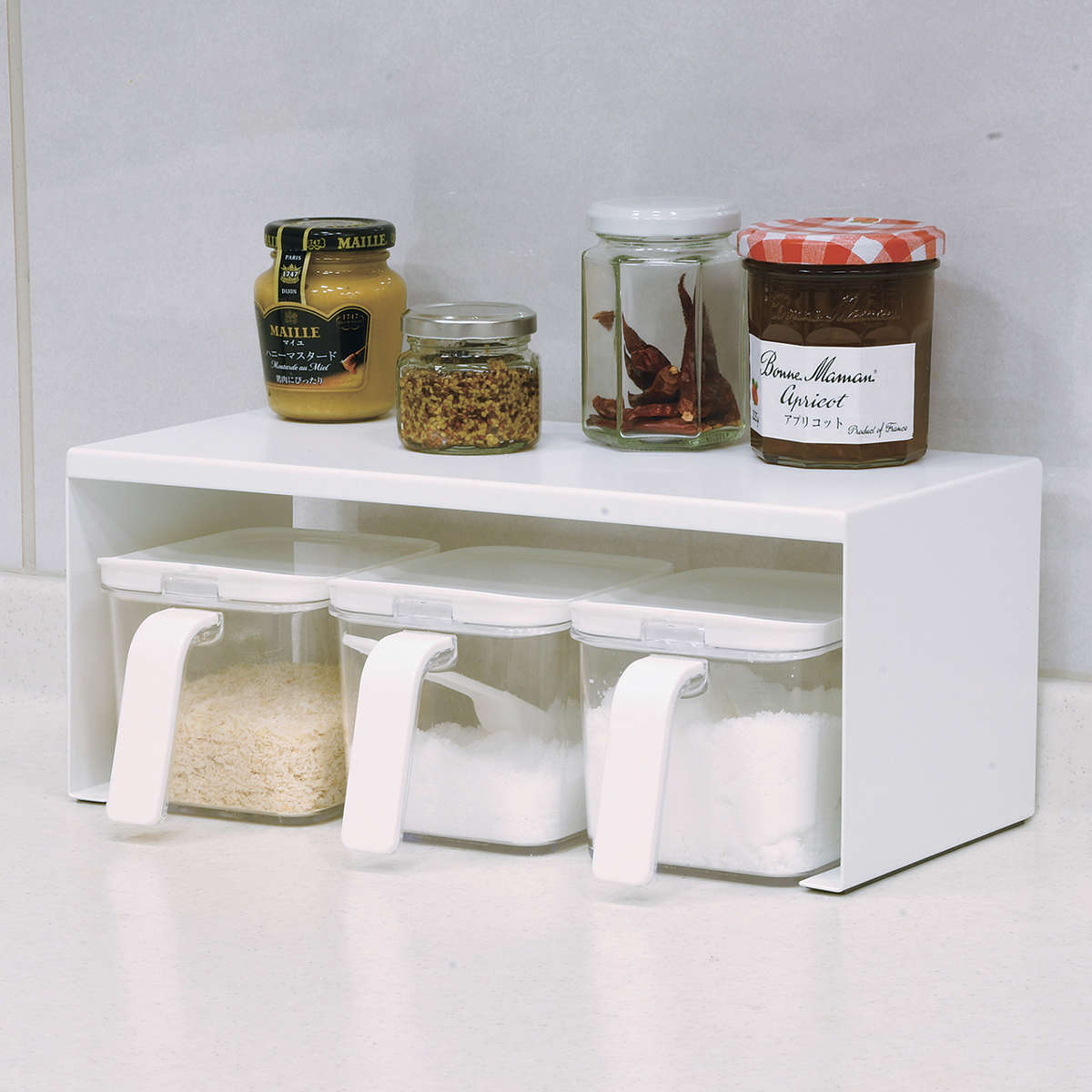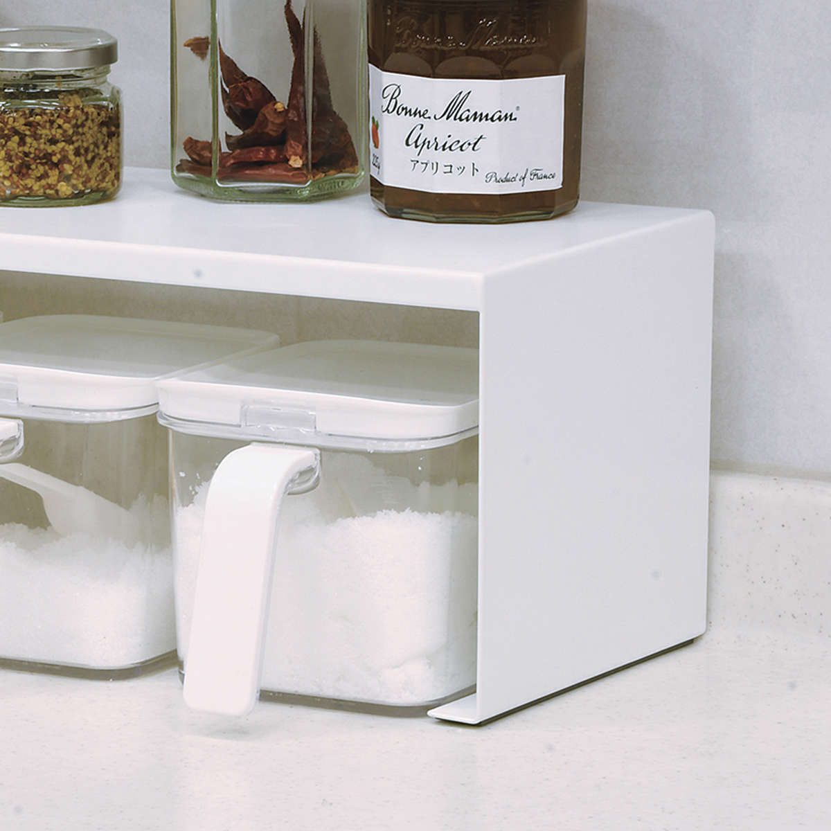 棚の上に置くだけで収納スペースを上下に分けられるため、調味料や小物をすっきり整理できます。シンプルで清潔感のあるデザインがキッチンに馴染みます。