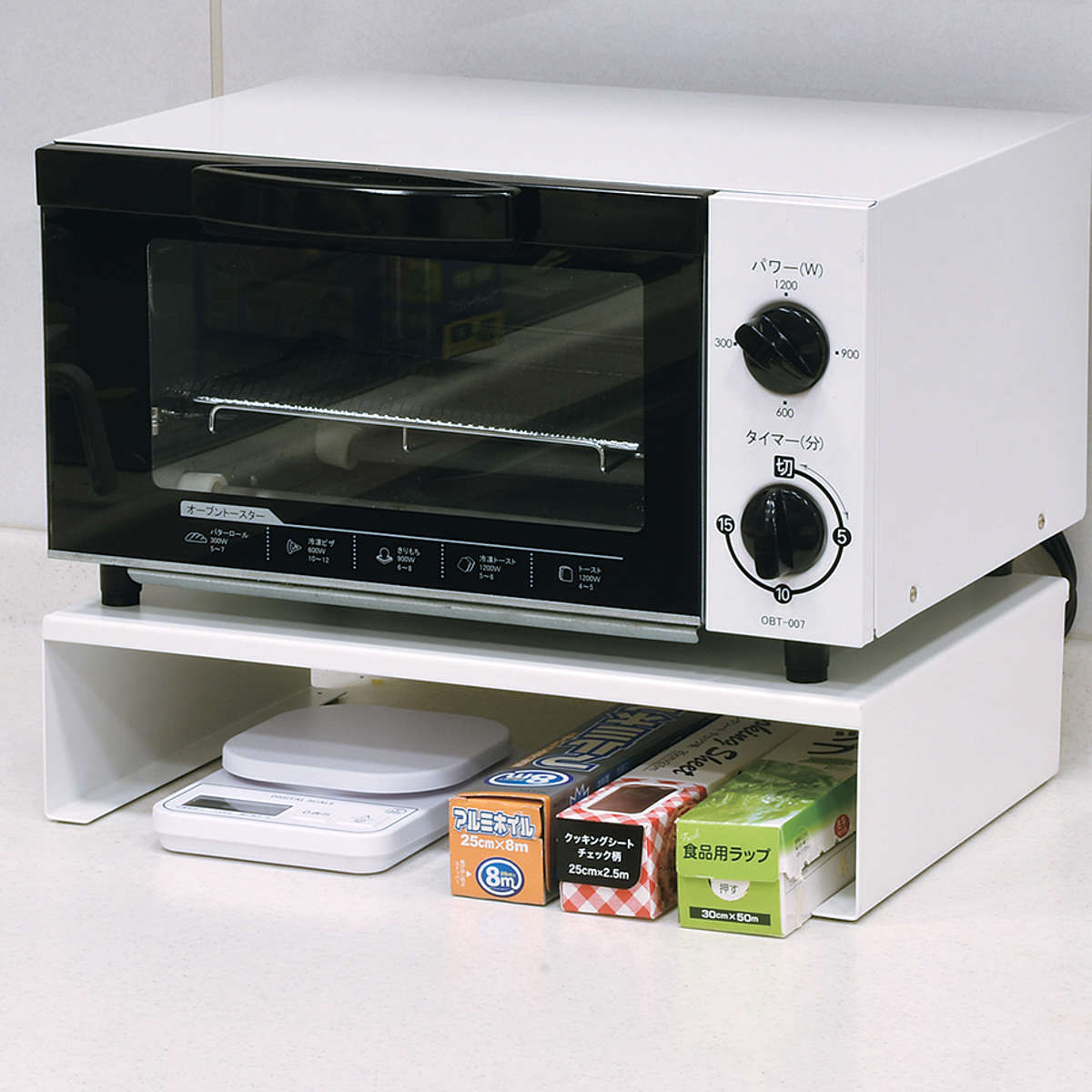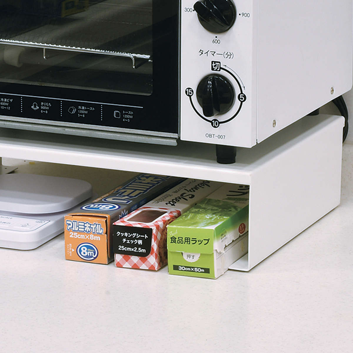 棚の上に置くだけで収納スペースを上下に分けられるため、食器や小物をすっきり整理できます。電子レンジやオーブントースターの置台としても活用でき、ラック下のスペースを収納に使えるのも便利です。