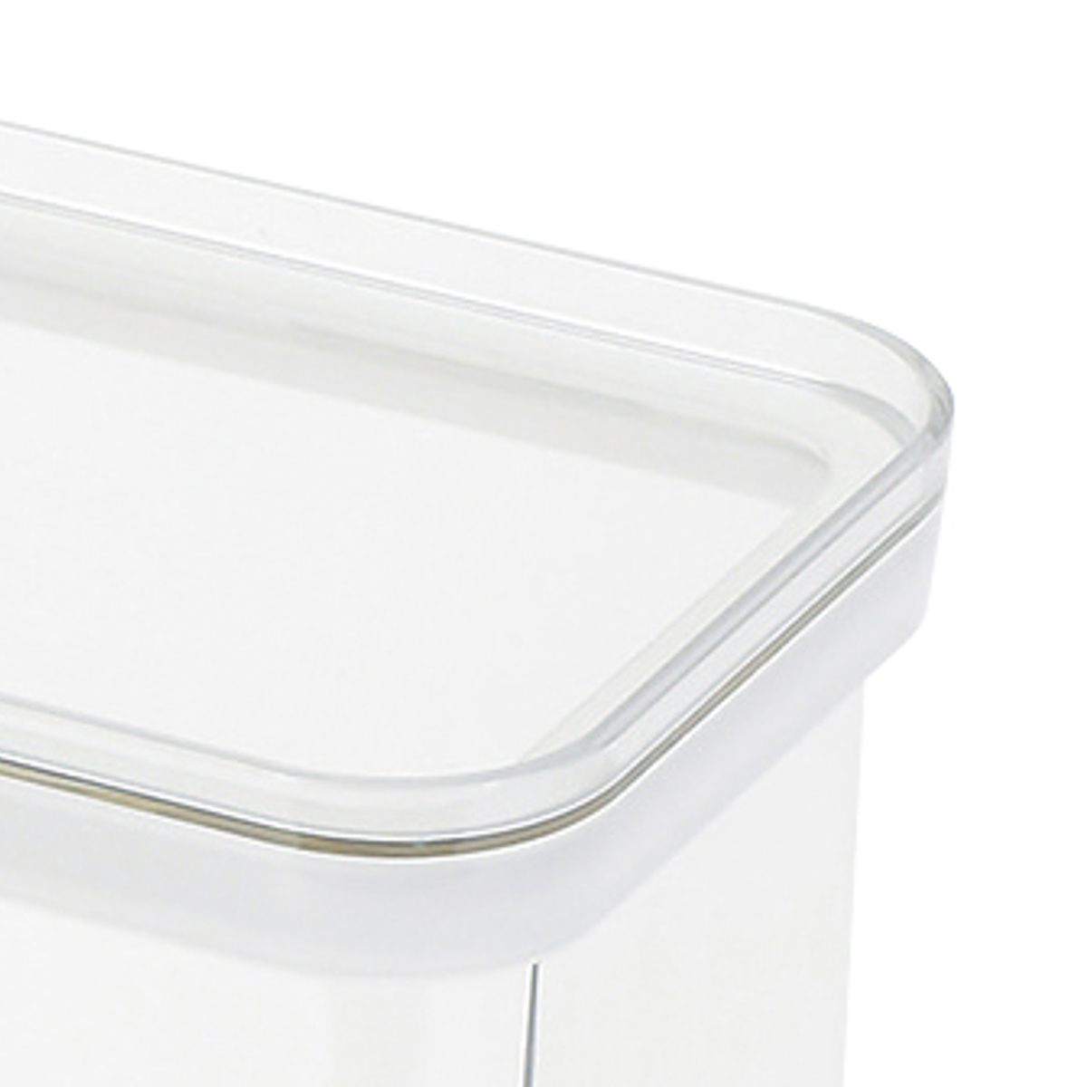 フタも透明なので、上からもしっかり中身を確認できます。システムキッチンの下段や低い位置に収納しても、取り出さずに残量がひと目でわかり便利です。麦茶パックだけでなく、シリアルやショートパスタ、コーヒー豆などの保存にもおすすめです。