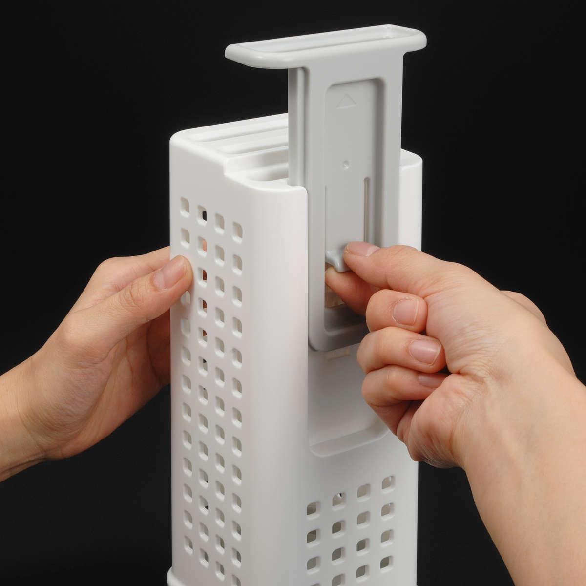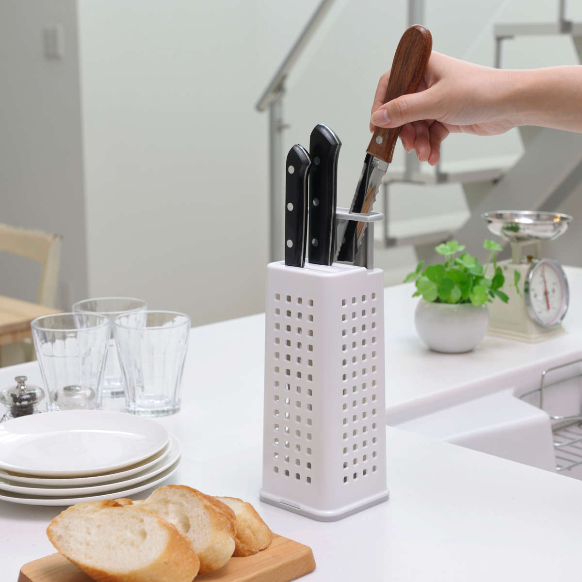 長めのパン切りナイフもすっきり収納できるナイフスタンドです。高さを6段階で調整できるスライドアーム付きで、さまざまなサイズのナイフに対応します。