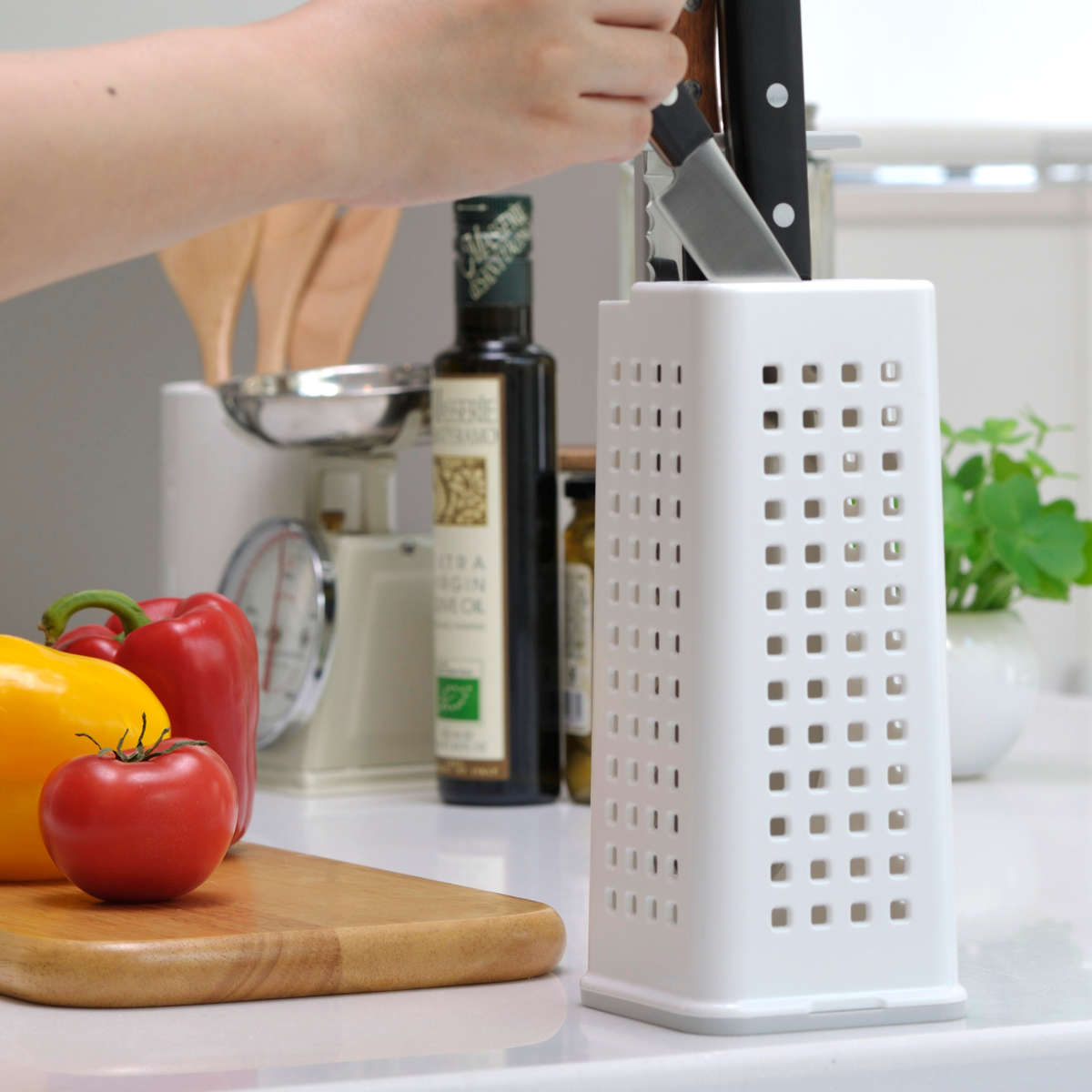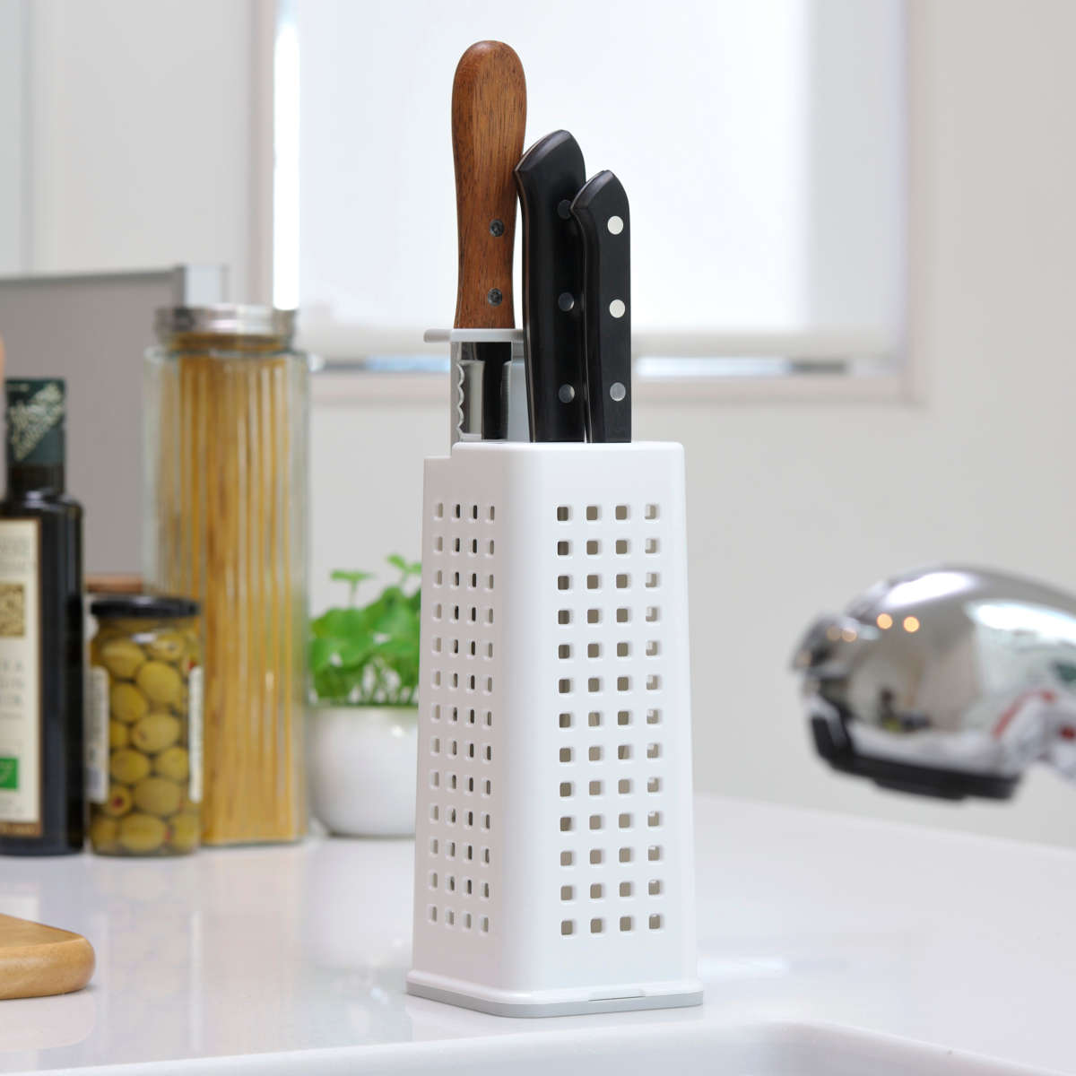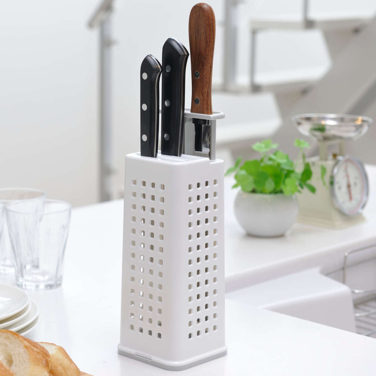 シンプルでスマートなデザインのナイフスタンドです。通気性の良い4面メッシュ構造で、ナイフを清潔に保ち、キッチンを美しく整えます。