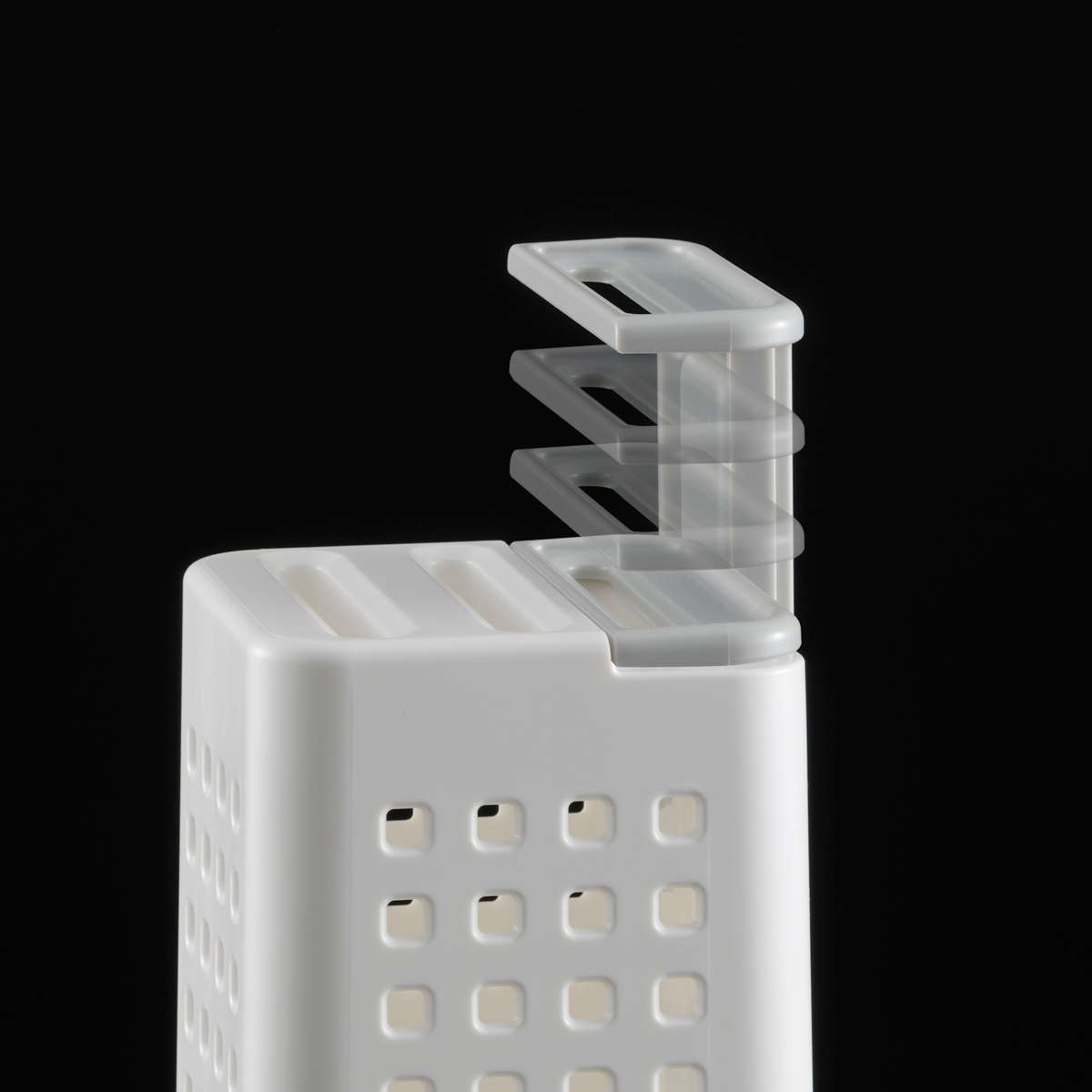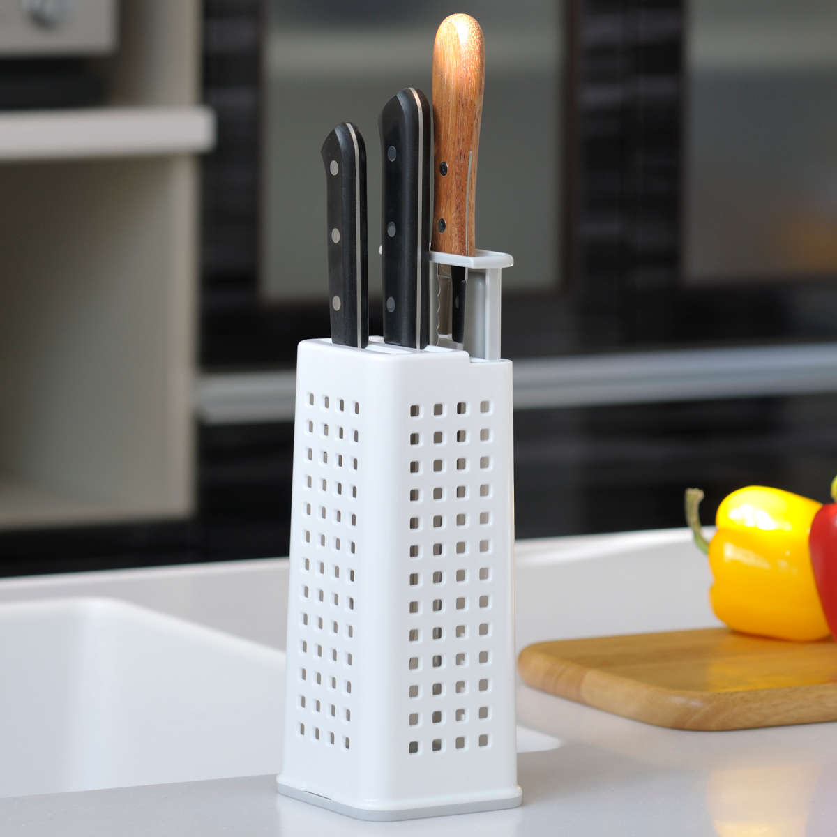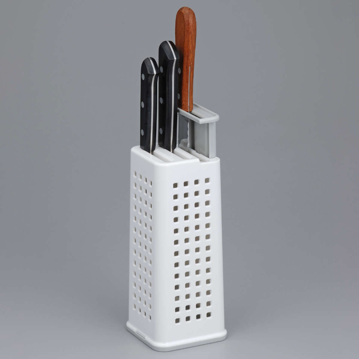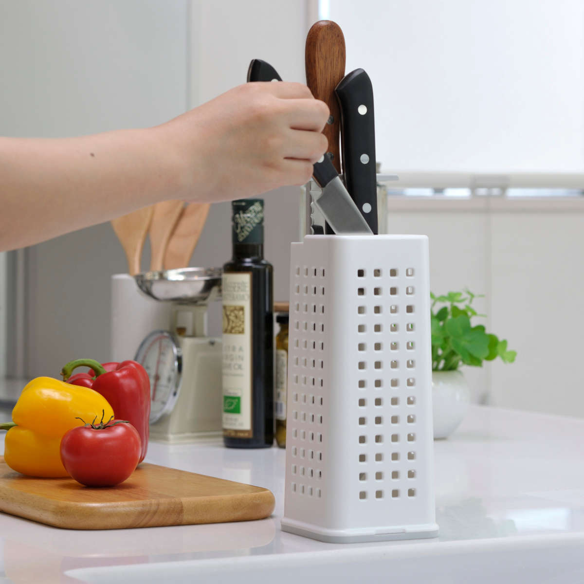 シンプルでスマートなデザインのナイフスタンドです。通気性の良い4面メッシュ構造で、ナイフを清潔に保ち、キッチンを美しく整えます。