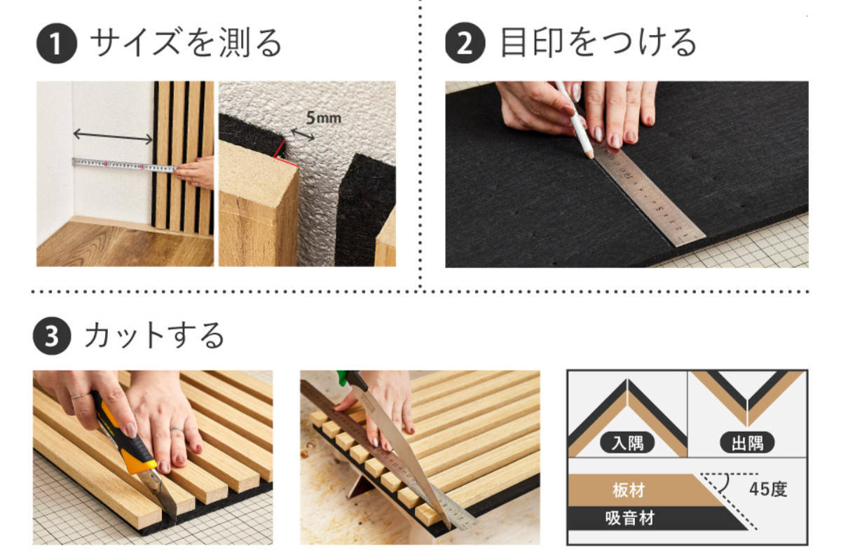 3.吸音部分はカッター、板部分はノコギリで切れます。角を隙間なくきれいに仕上げるには、その方向に合わせて斜め45度にカットします。