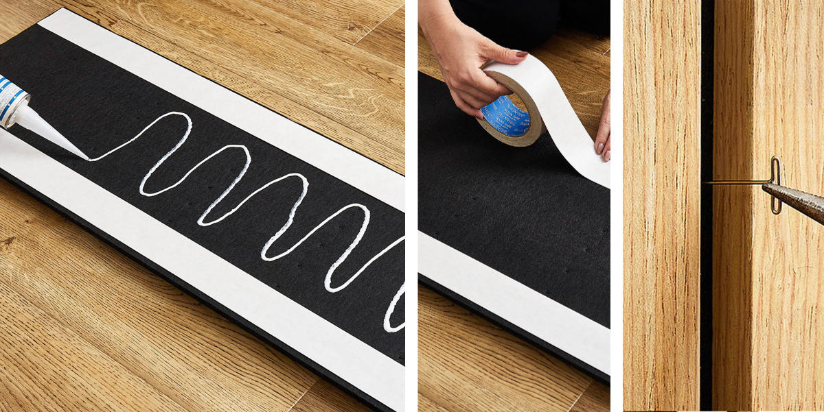 2.端に板を合わせ施工方向に吸音材が出るようにして貼り付けます。