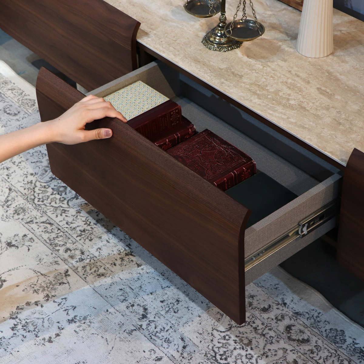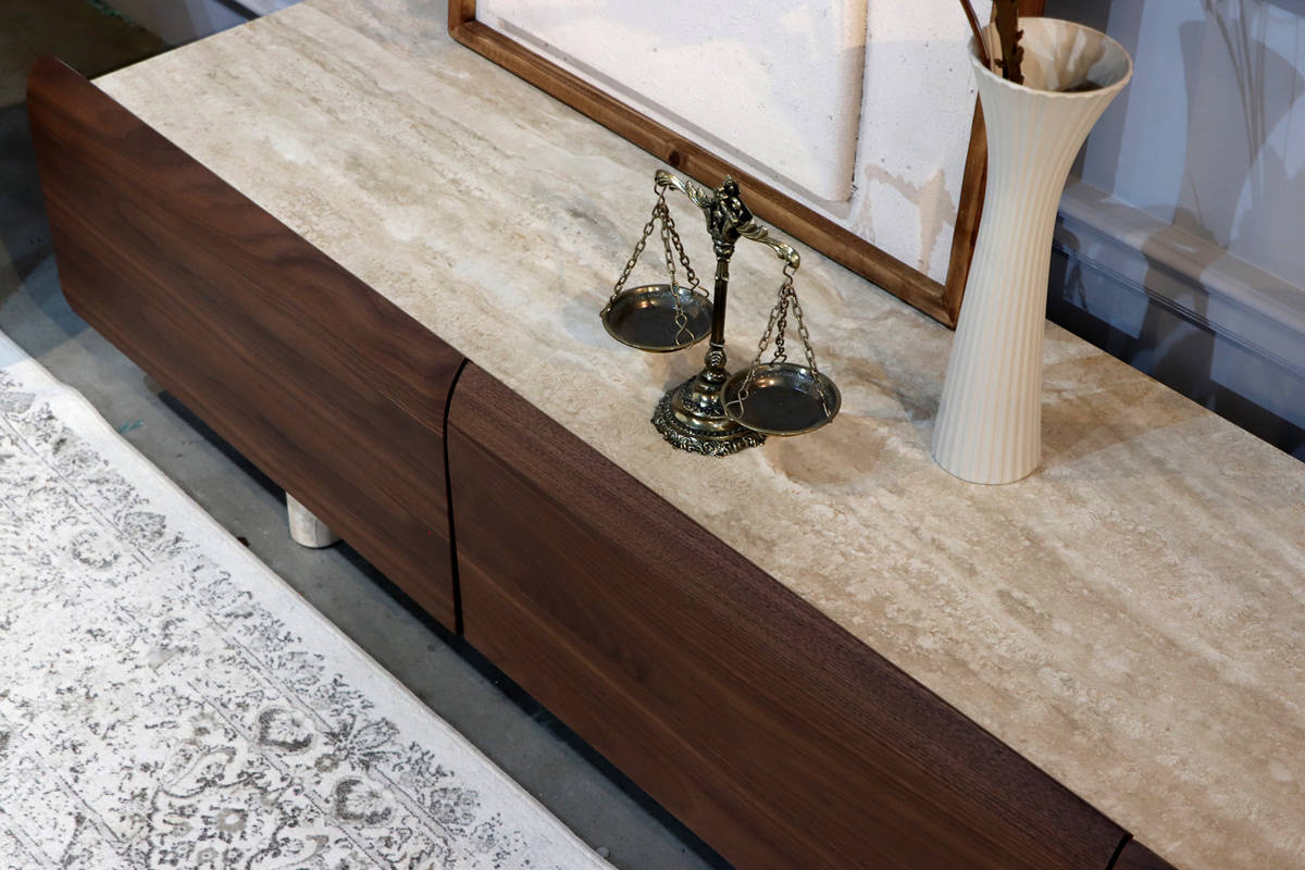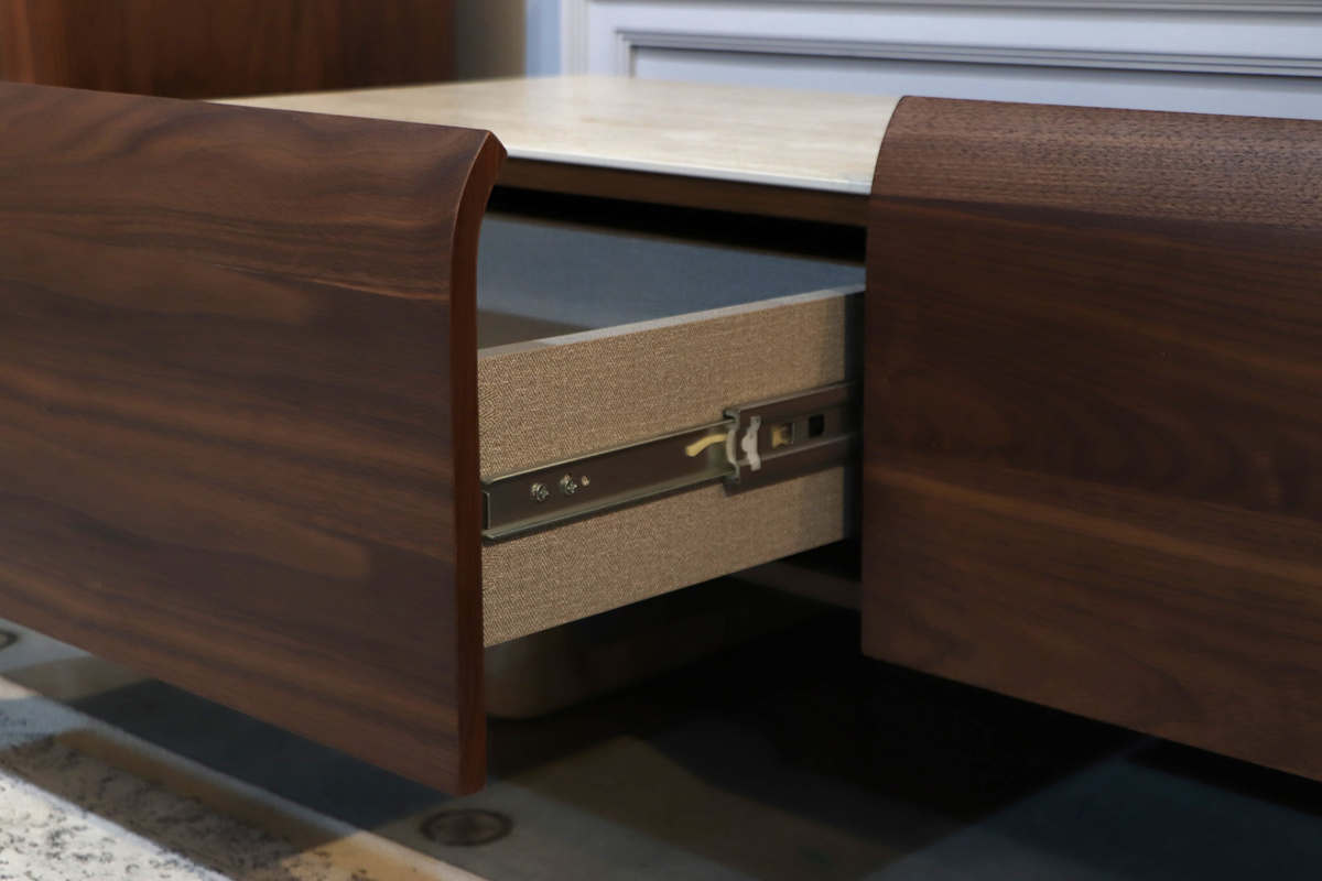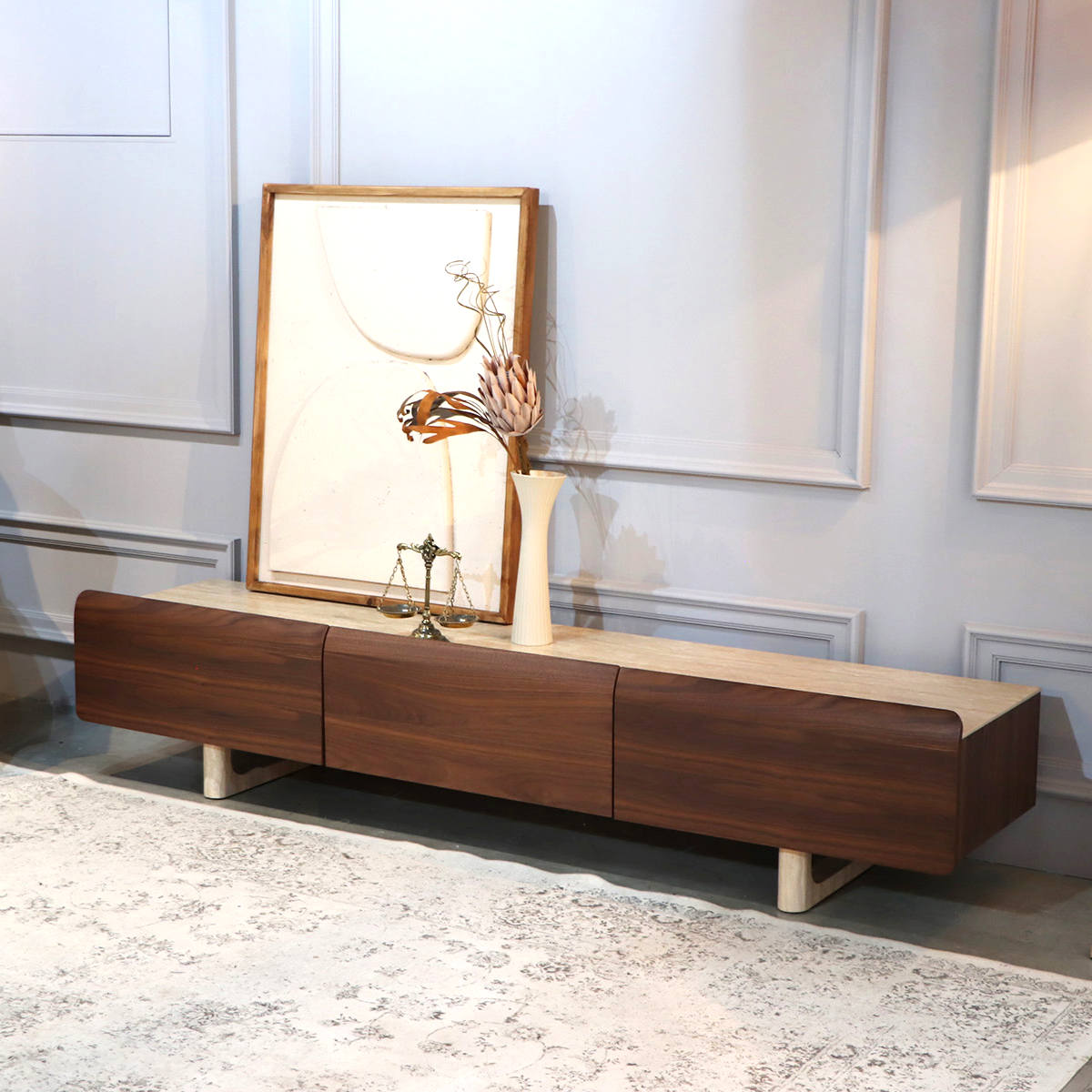 木目が美しいウォルナットとセラミックの天板を組み合わせたローボードです。丸みを帯びた前板が、まるでアート作品のような佇まいです。お部屋を広く見せながらも重厚感のある雰囲気を演出するロータイプです。
