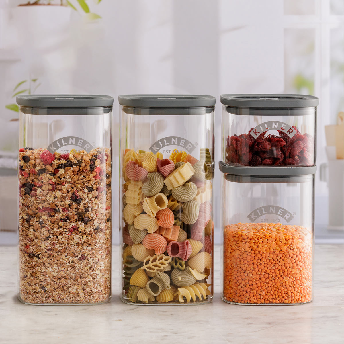 食材や収納スペースに合わせて、4つのサイズから選べます。同じサイズはもちろん、サイズ違いでも重ねて収納できるので、自由に組み合わせが可能です。食材別に揃えれば、出し入れしやすく、毎日のキッチンが自然と整います。
