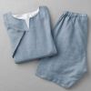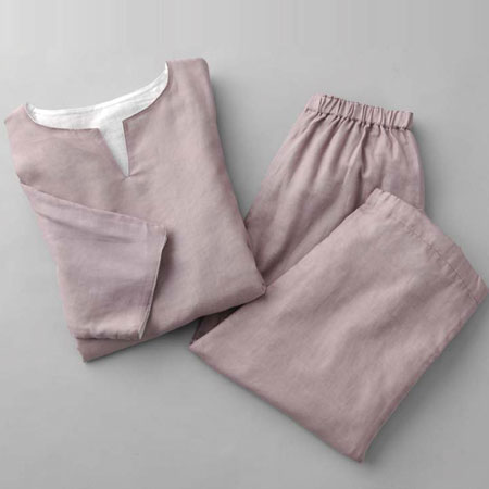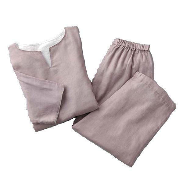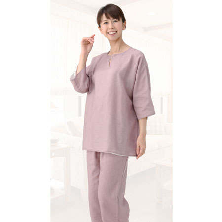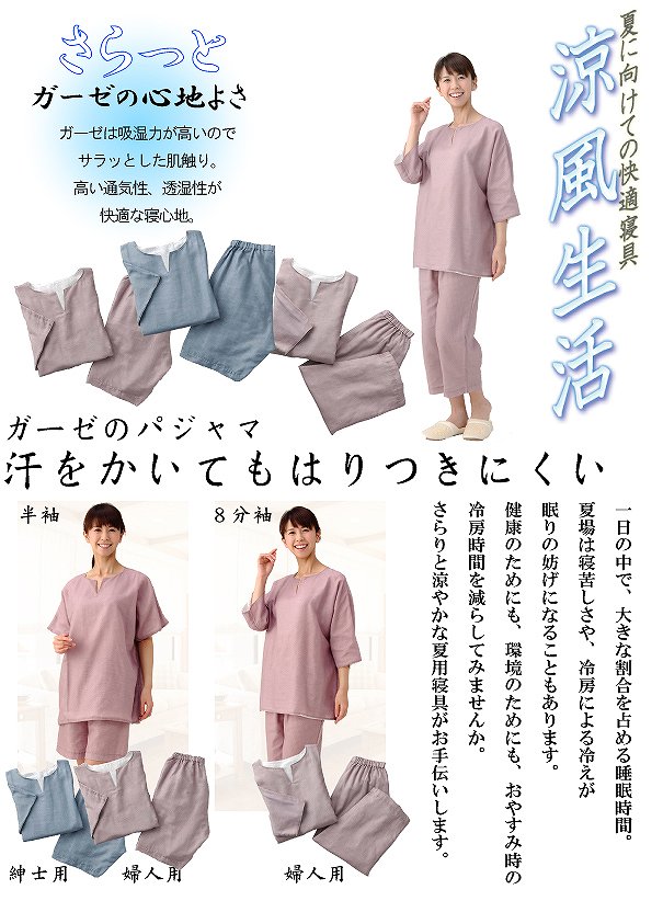 - 綿100%、2重ガーゼ、上着:8分袖かぶり式、8分パンツ:ウエスト総ゴム