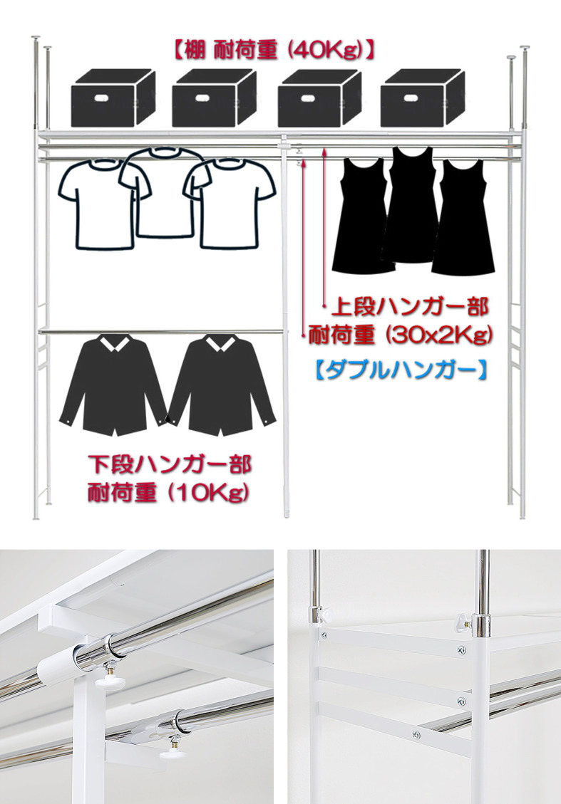 | 耐荷重 | 110kg (棚:40kg、上段ハンガー:30×2kg、下段ハンガー:10kg) |
