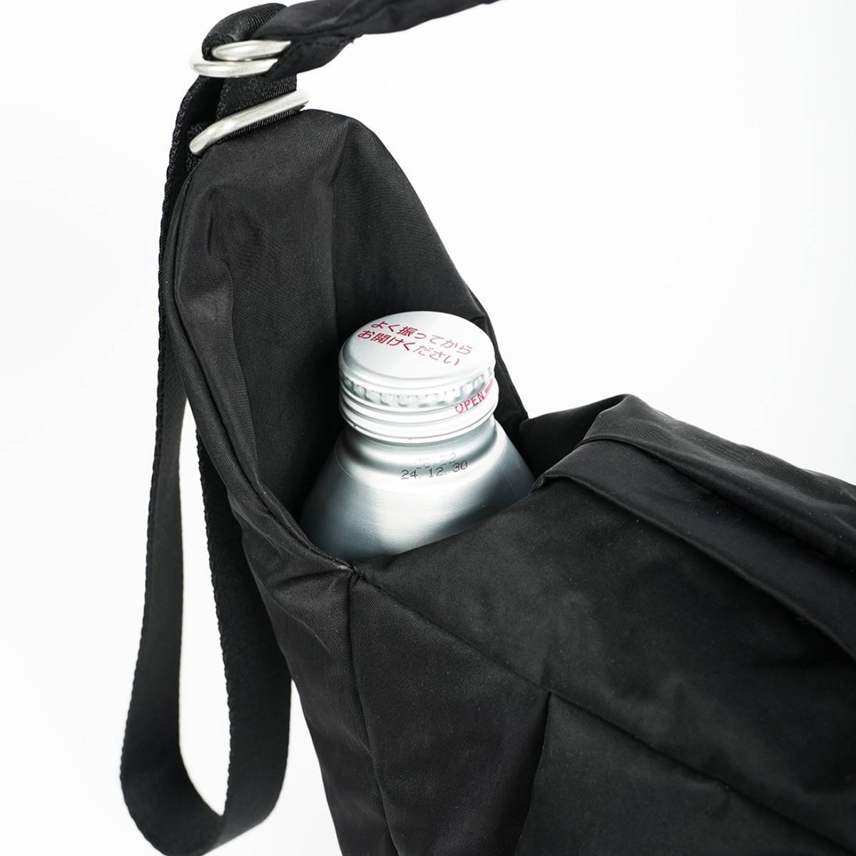 メイン収納のファスナーの両側にはサイドポケットが付いており、500mlのペットボトルがぴったり収まる高さです。ボトルのほか、折りたたみ傘などの収納にも便利です。