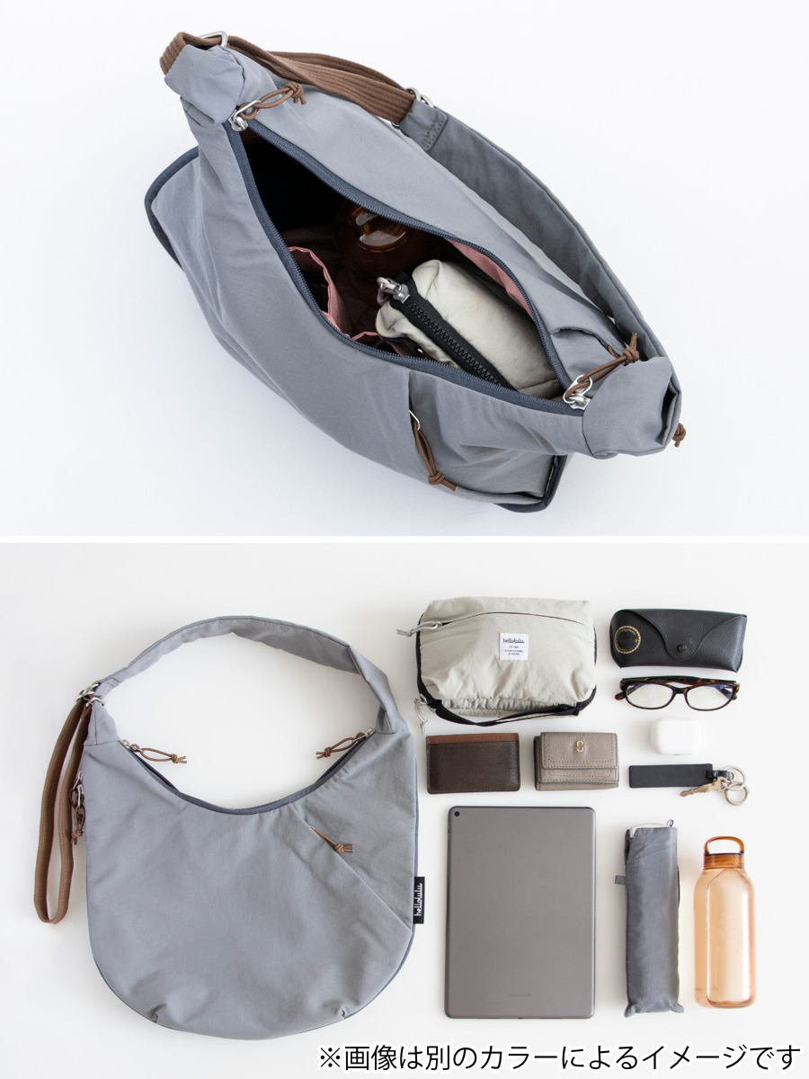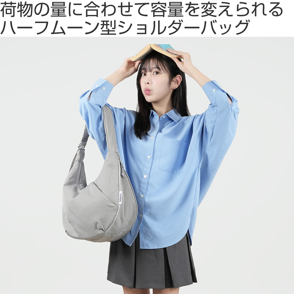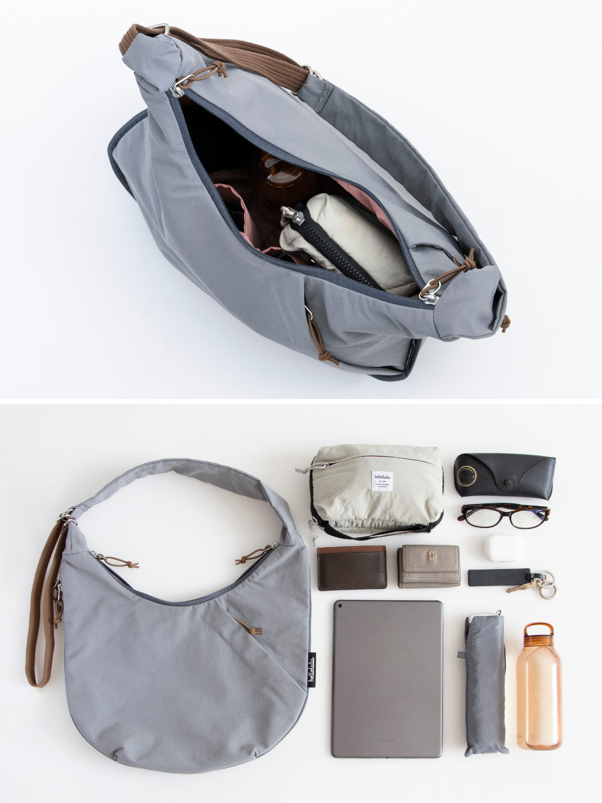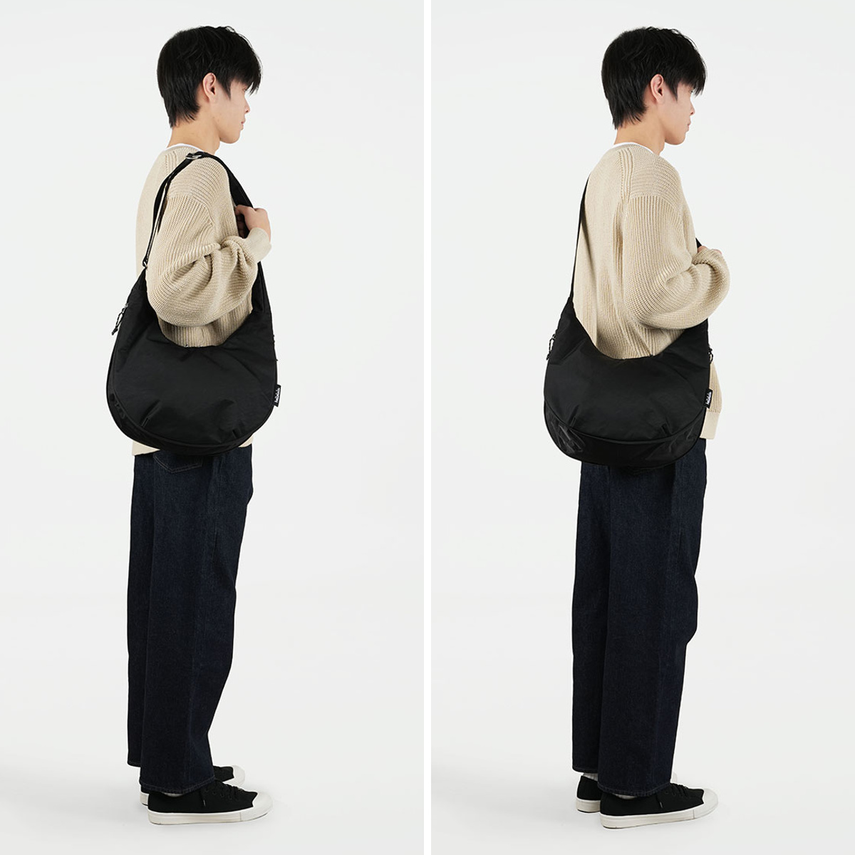 シーンに合わせて容量を変えられるハーフムーンバッグです。底部のファスナーを開くとマチができるので、荷物が増えてもこのバッグ1つで持ち運べます。