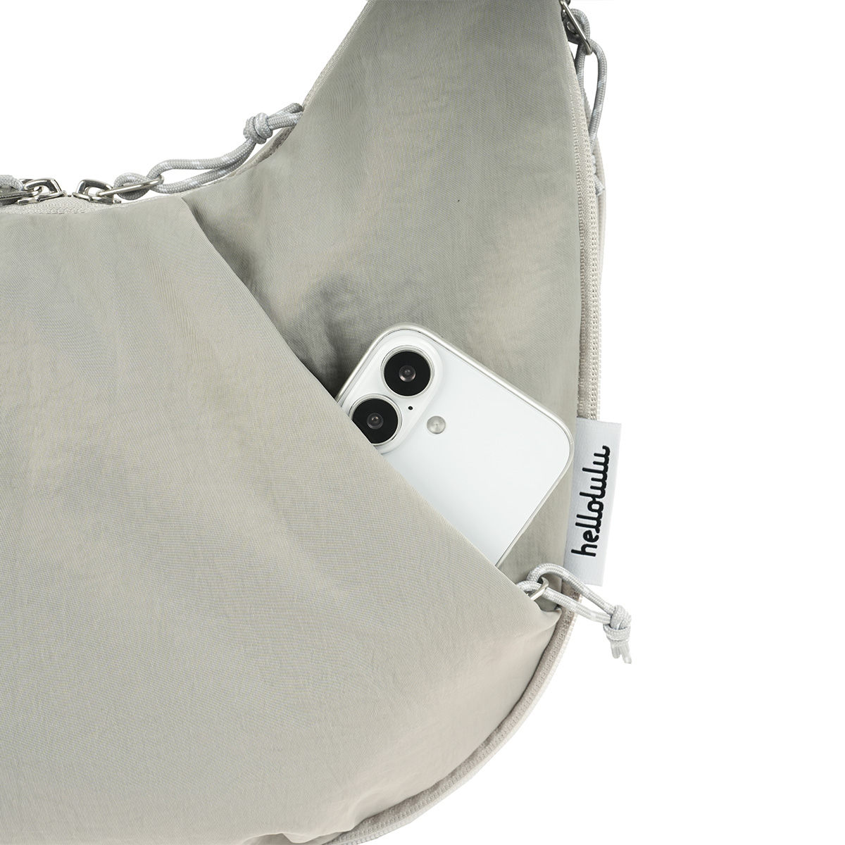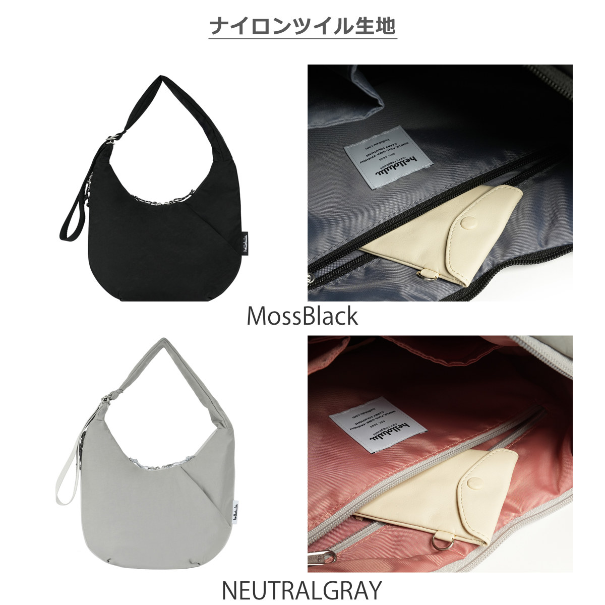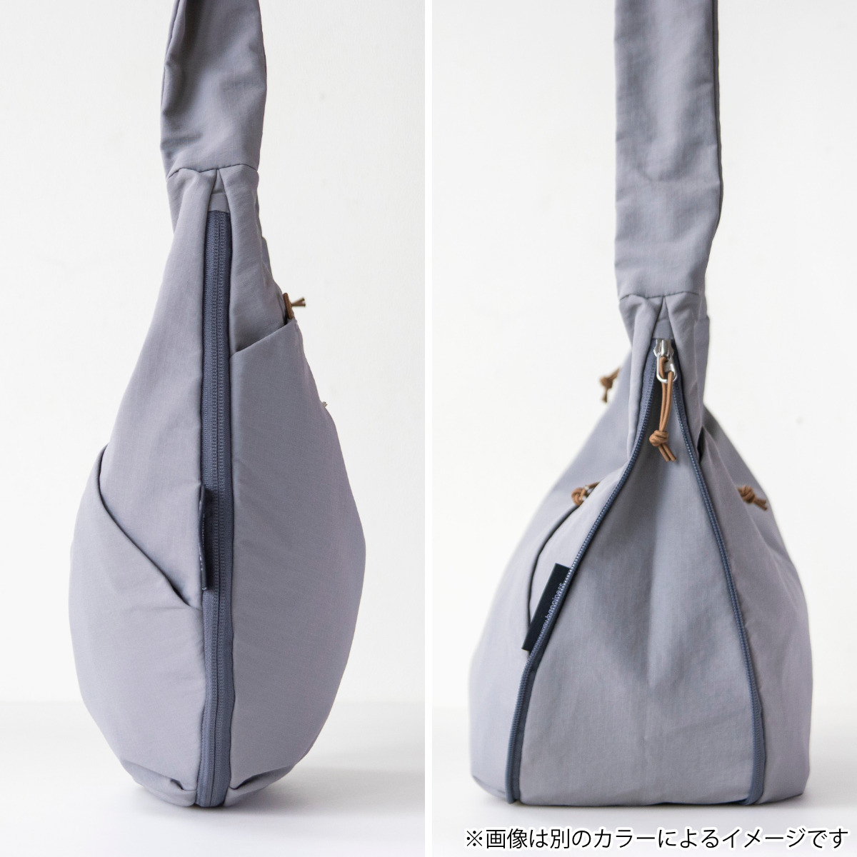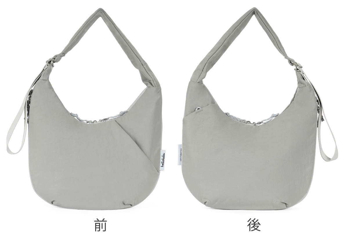 シーンに合わせて容量を変えられるハーフムーンバッグです。底部のファスナーを開くとマチができるので、荷物が増えてもこのバッグ1つで持ち運べます。