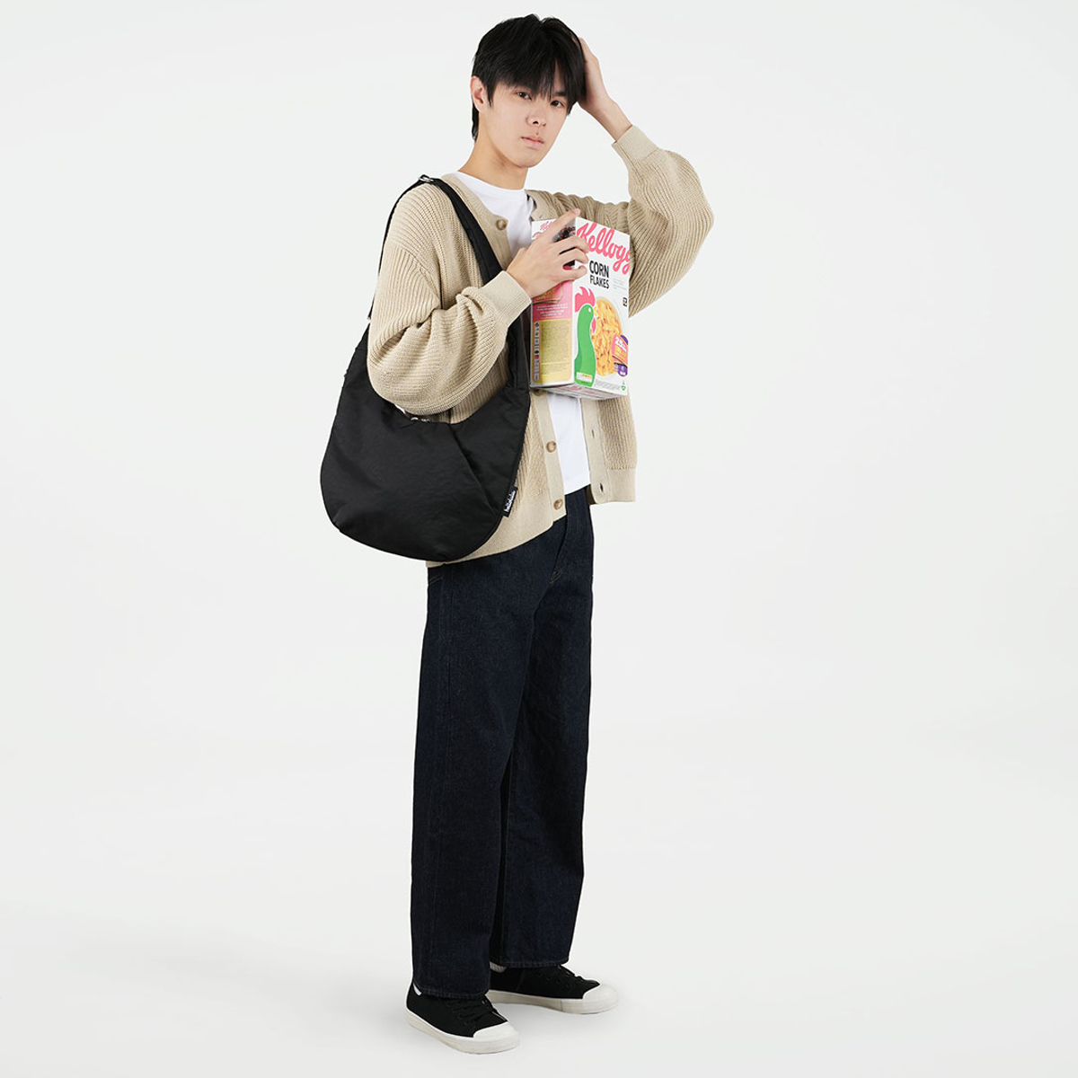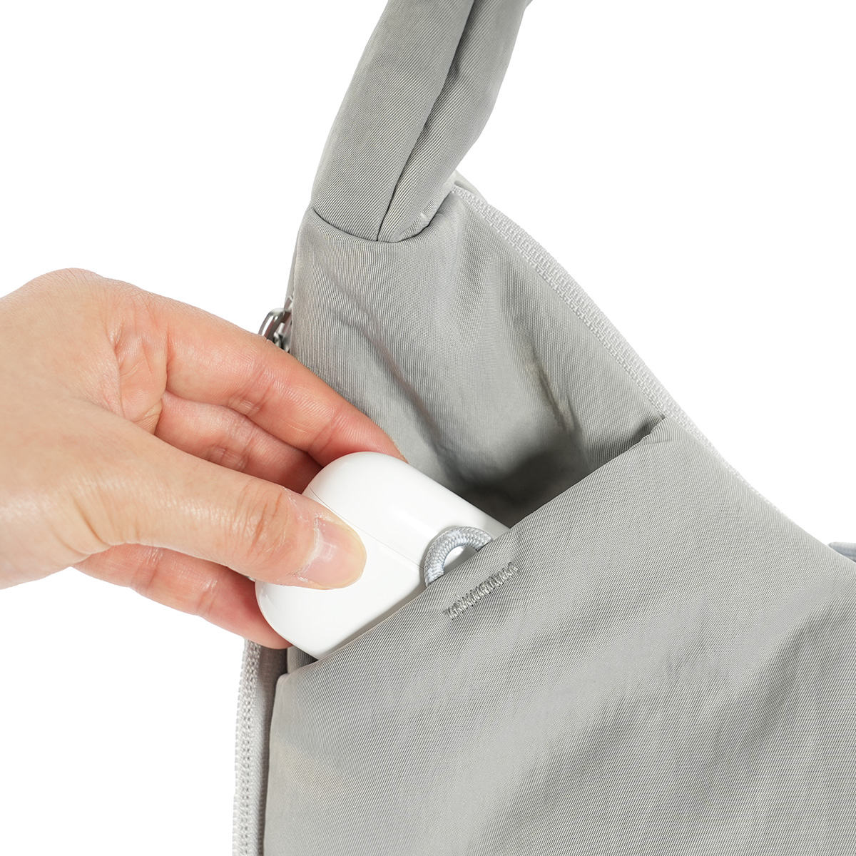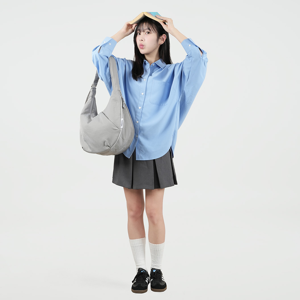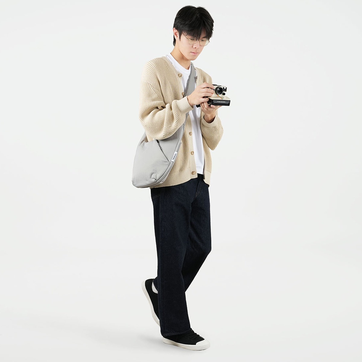 シーンに合わせて容量を変えられるハーフムーンバッグです。底部のファスナーを開くとマチができるので、荷物が増えてもこのバッグ1つで持ち運べます。