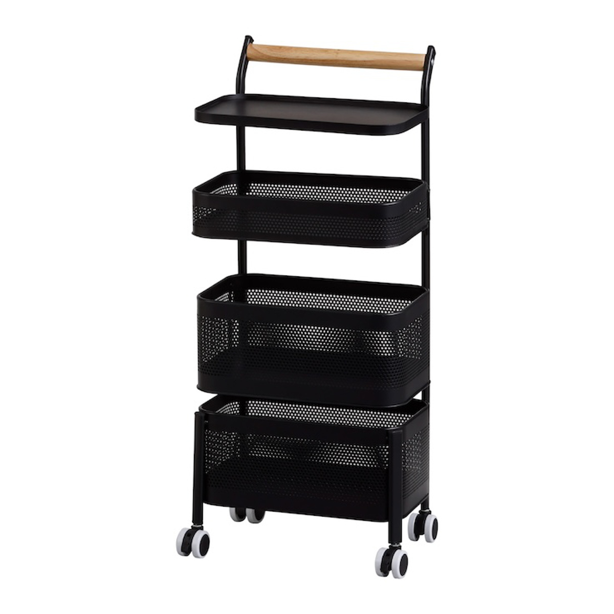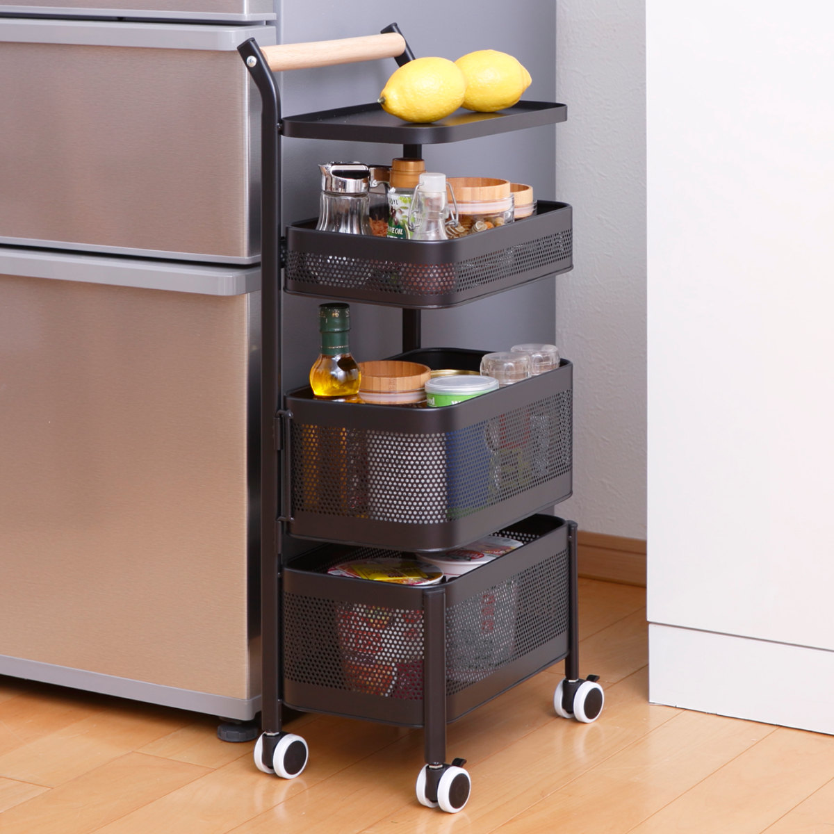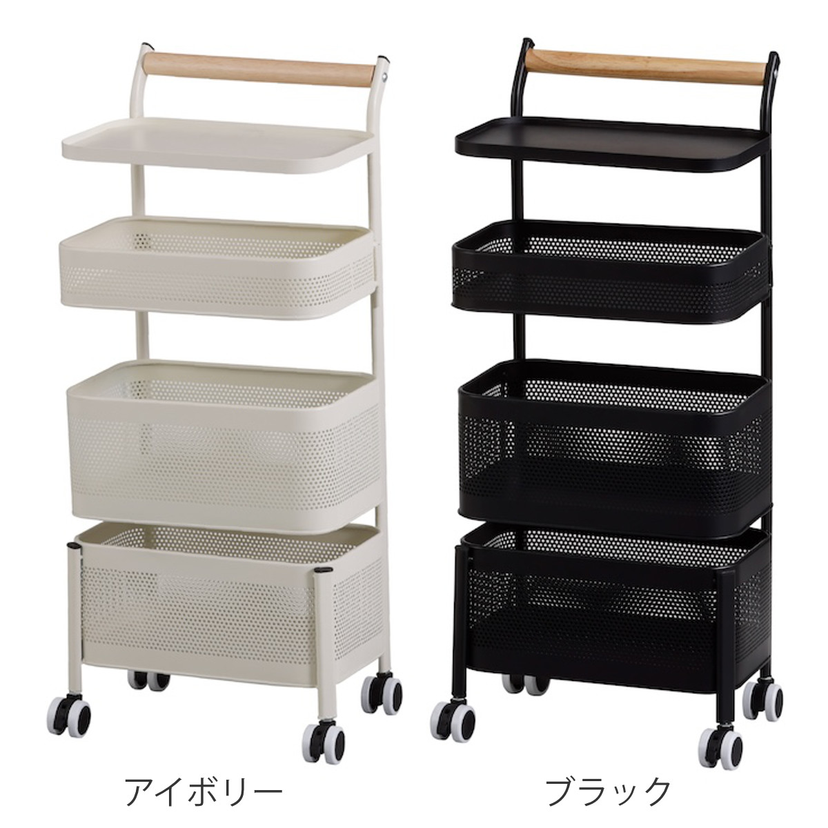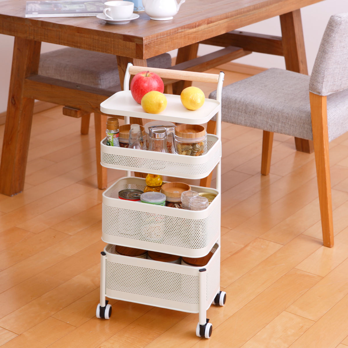 スイングするバスケットで中身が取り出しやすい北欧風ワゴン