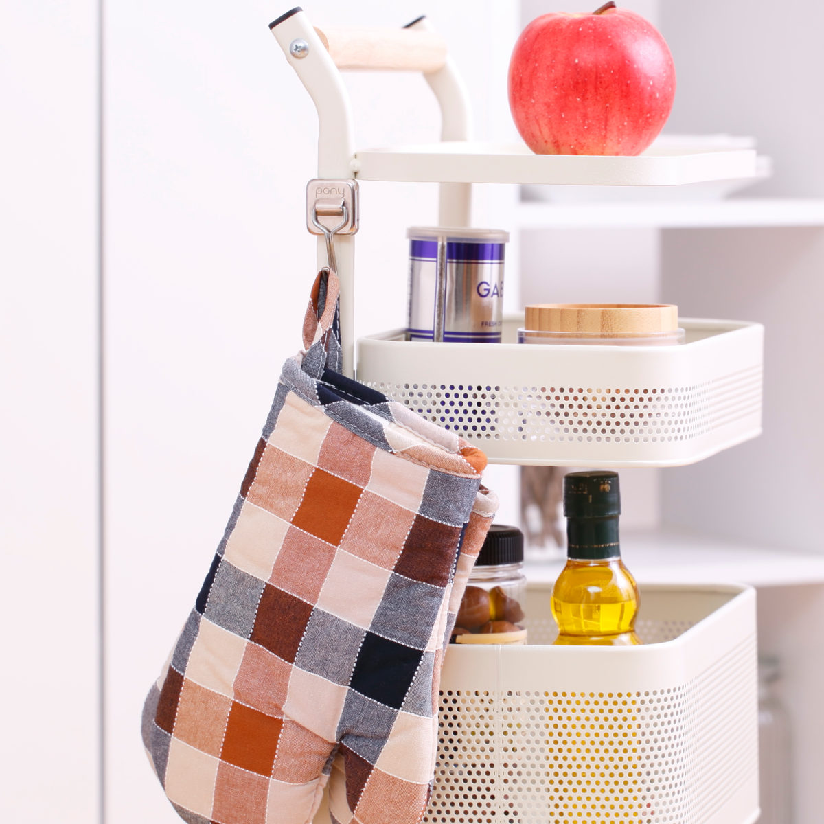 マグネットが使えるアイアン製ワゴンなので、フックなどを取り付けて収納を自由にアレンジできます。必要なものをすぐ手に取れる位置に置け、キッチン作業がスムーズになります。