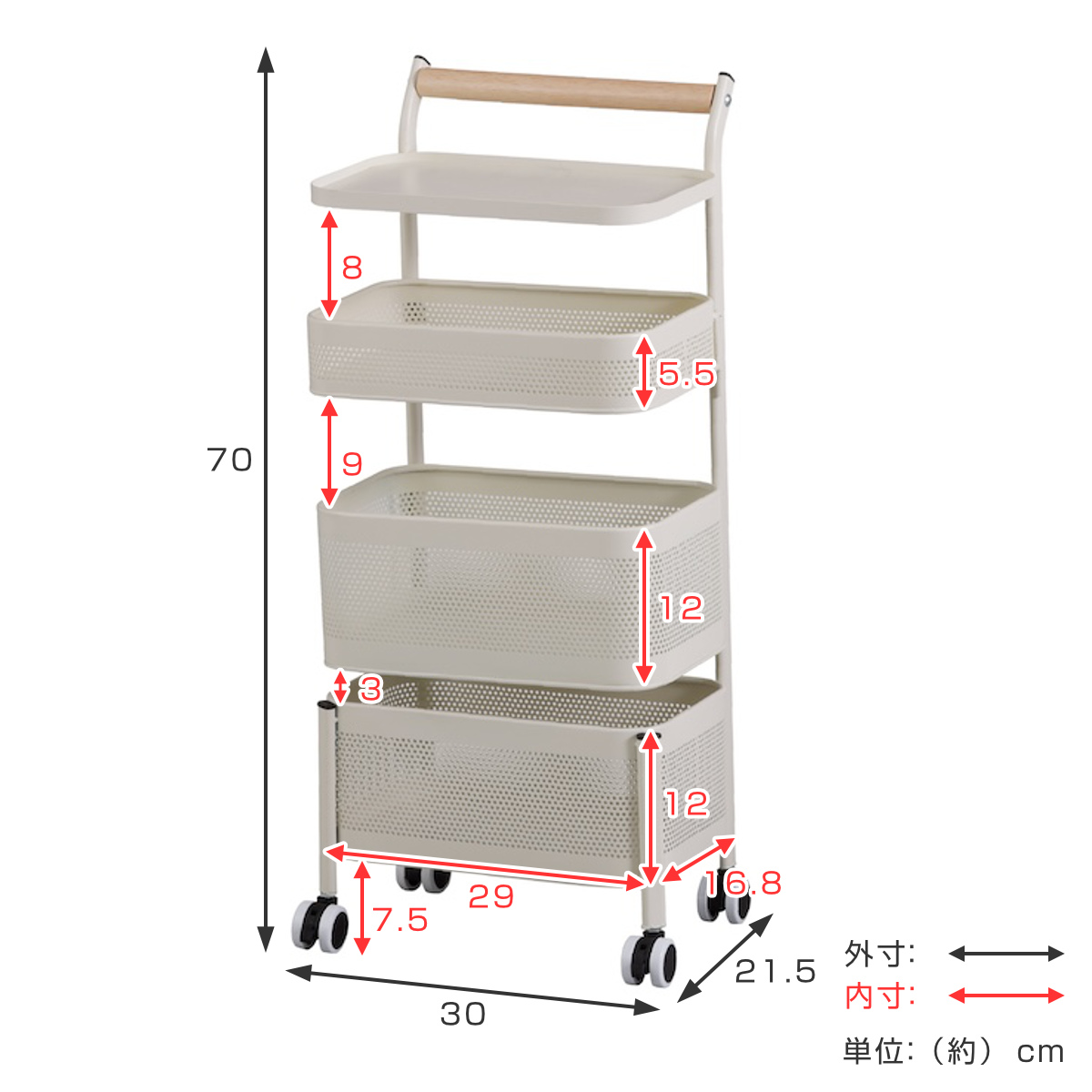 側面にはパンチング穴が開いているので通気性がよく、野菜や果物のストッカーとしてもお使いいただけます。底面はフラット形状なので、小物も安定して収納ができます。