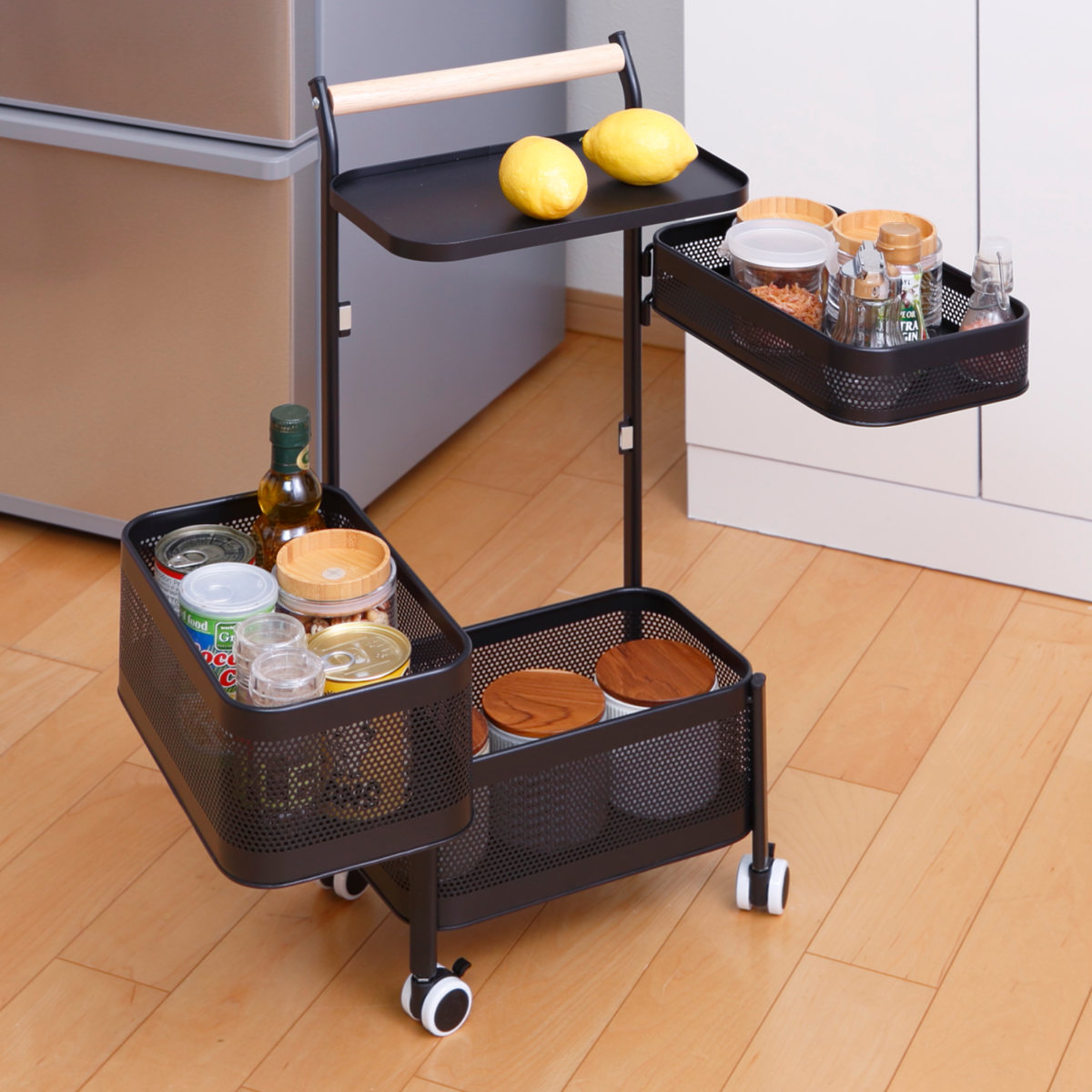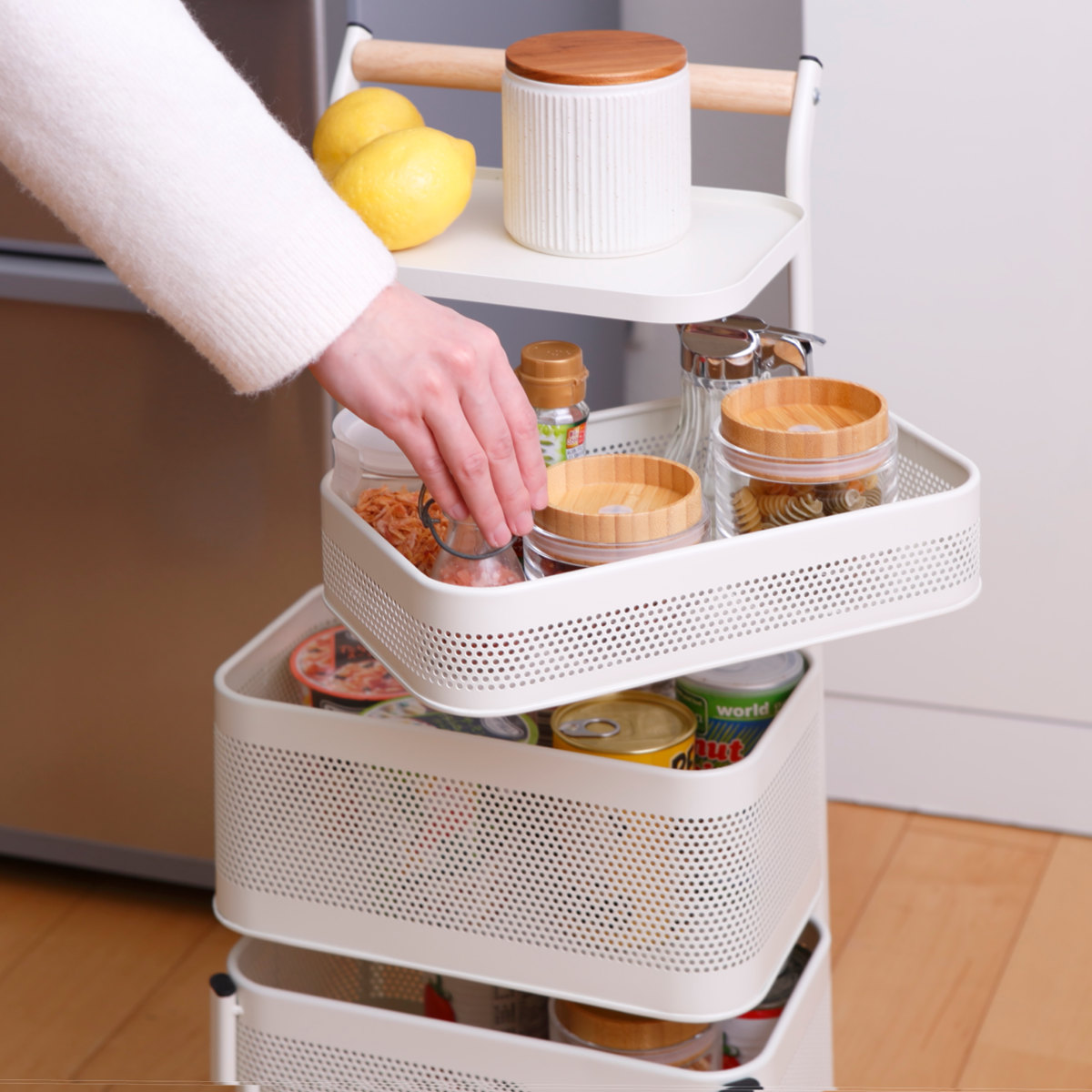 散らかりがちなキッチン小物をまとめてスッキリ収納できるキッチンワゴンです。深さの違う2段目と3段目のバスケットは取り出しやすいスイングタイプ。回転させれば中身の確認も簡単で、サッと取り出すことができます。