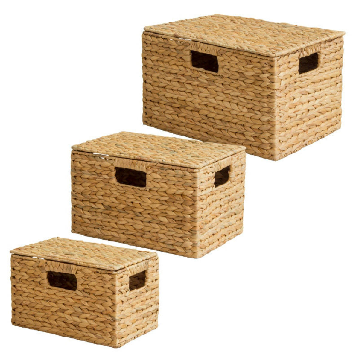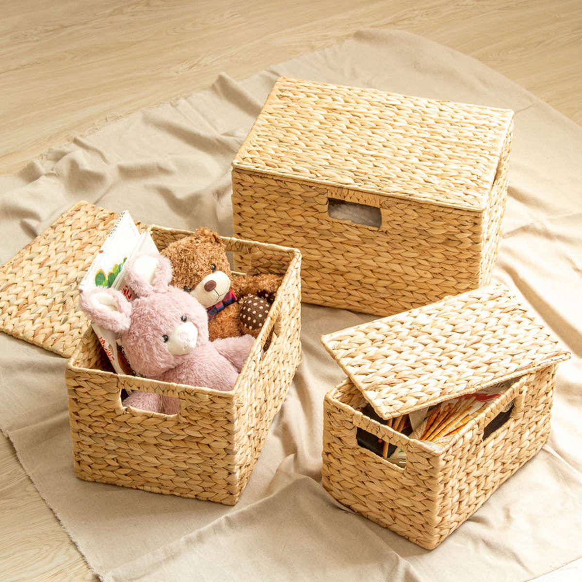 小さな雑貨にはSサイズ、日用品や食品にはMサイズ、 ブランケットや衣類にはLサイズなど、シーンに合わせて幅広く使える3サイズがセットになったバスケットです。見せたくない生活感をさりげなく隠せるフタ付きで、リビング・キッチン・サニタリールームなど、場所を選ばず小物をすっきり収納できます。