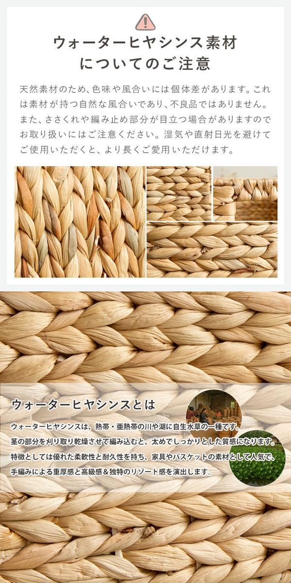 天然素材のウォーターヒヤシンスを、熟練の職人が一つひとつ丁寧に編み上げています。手仕事ならではの温かみとナチュラルな風合いが、毎日の暮らしにそっと寄り添います。優れた柔軟性と耐久性を持ち、しっかりとした質感が特徴です。