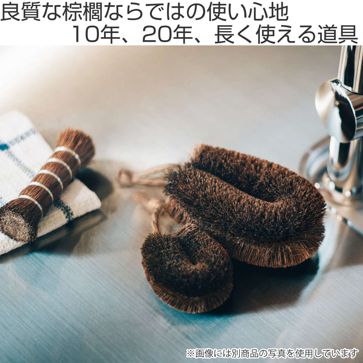 水切れが良く、使用後は吊るし紐で掛けておくだけで清潔に保てます。棕櫚は変色しにくいため、綺麗な状態で長くご使用いただけます。使わない時は壁に立てかけたりフックに掛けるだけで、おしゃれなインテリアとしても楽しめます。