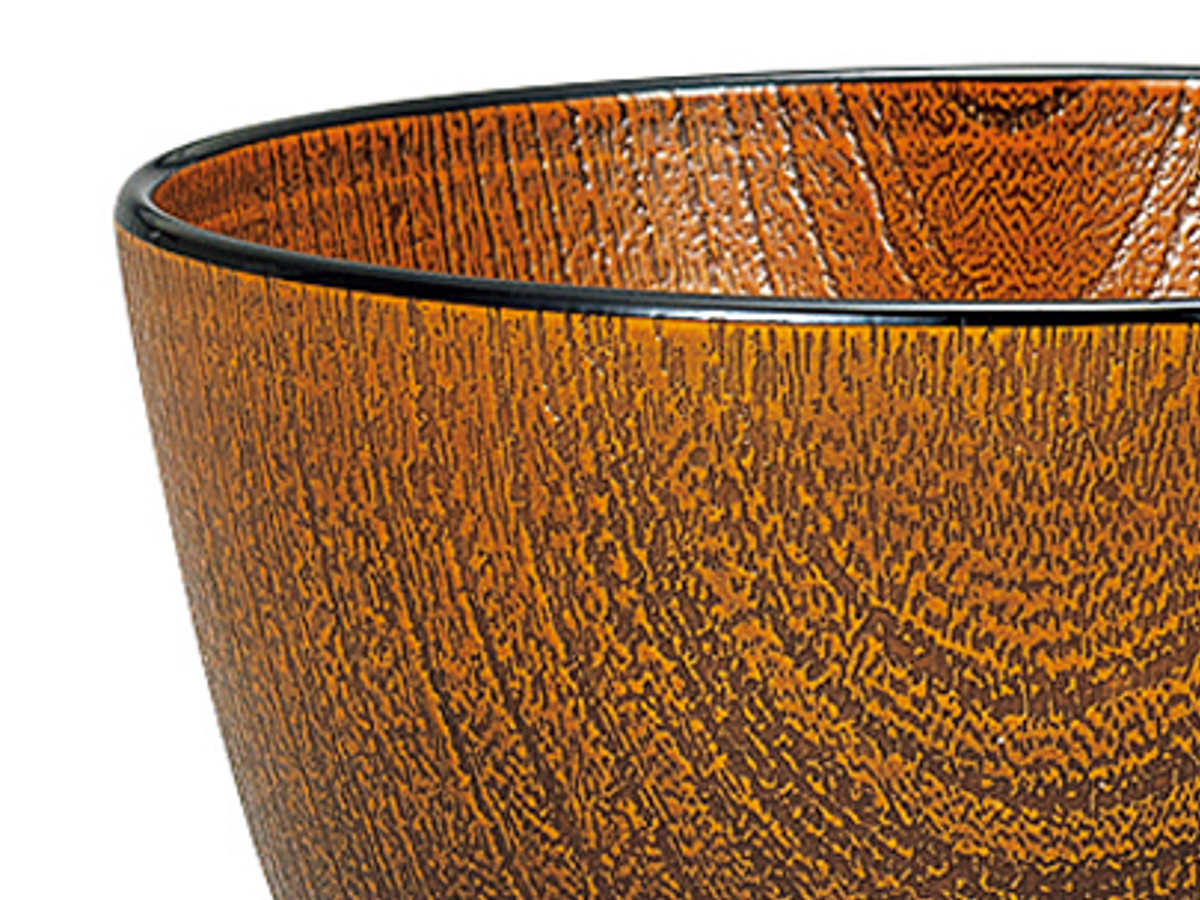 器の内側と外側には木目調のデザインが施されています。食卓に馴染みやすく、温かい雰囲気に包まれるような、ぬくもりを感じられるデザインです。