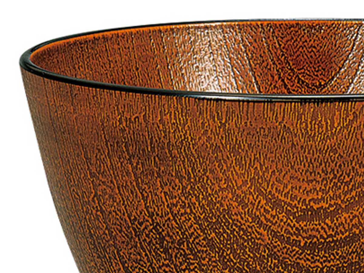 器の内側と外側には木目調のデザインが施されています。食卓に馴染みやすく、温かい雰囲気に包まれるような、ぬくもりを感じられるデザインです。